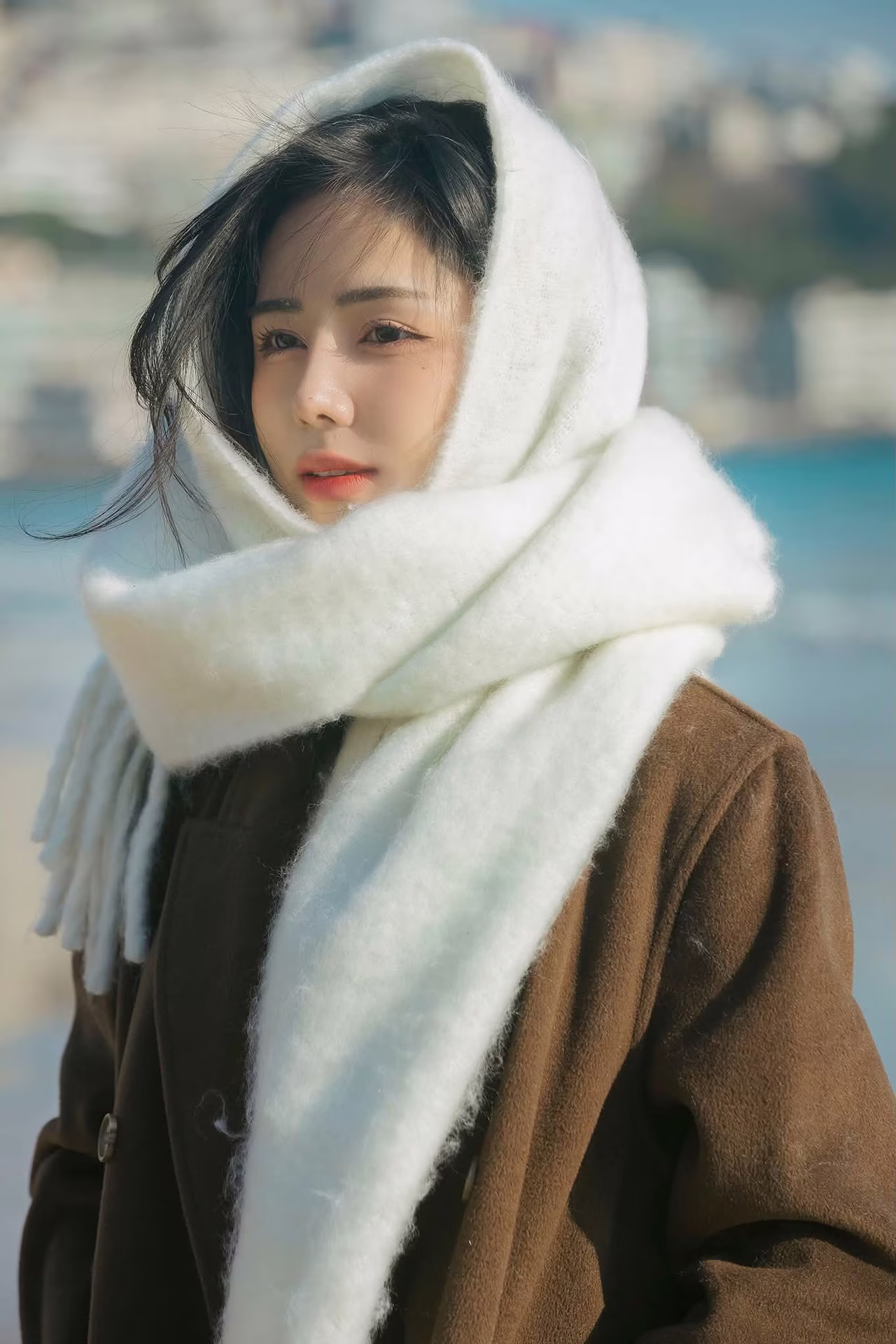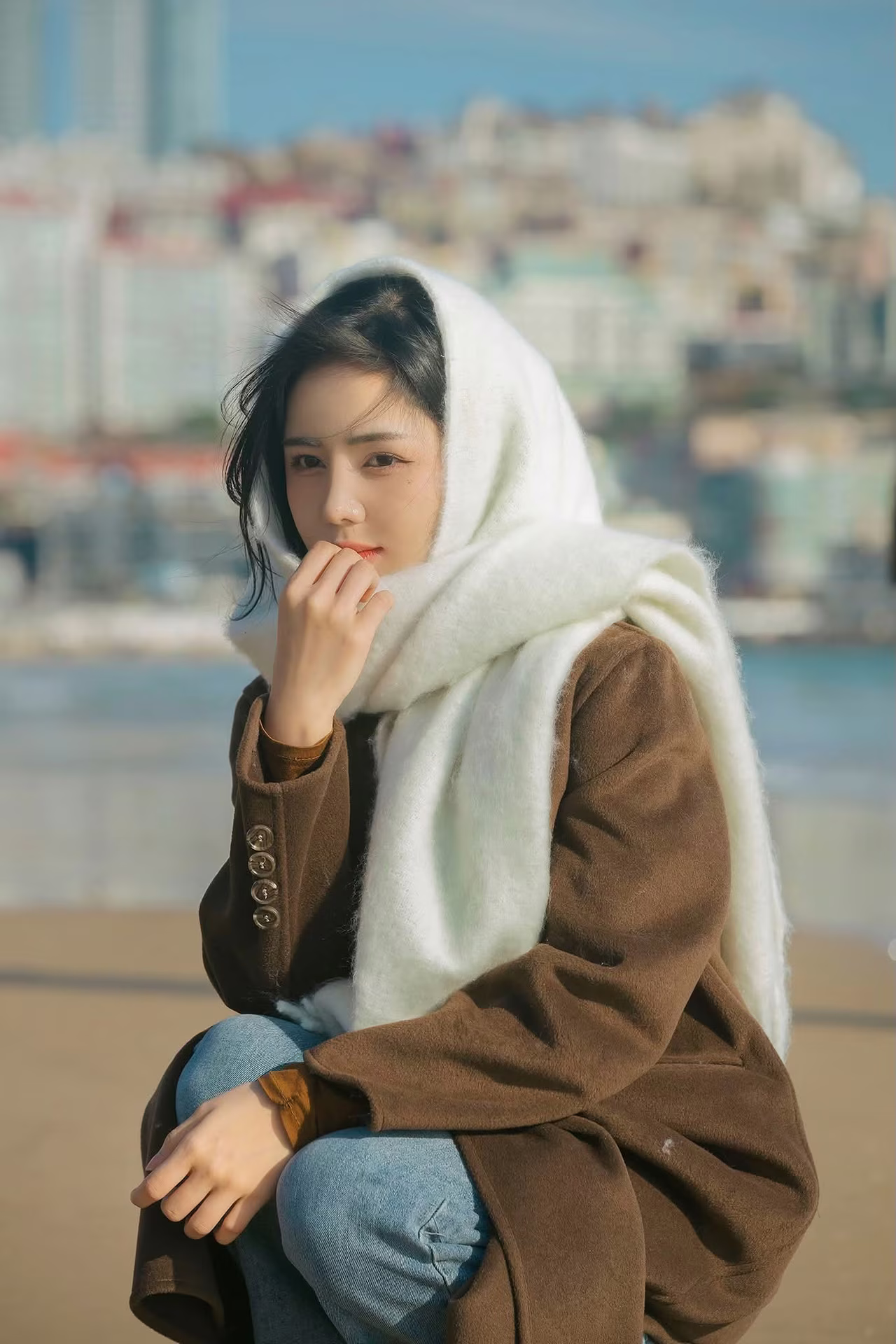 This image captures a poignant moment of a young woman on a serene beach on a cool winter day Dressed in a warm brown coat and a soft white scarf elegantly wrapped around her she exudes a unique blend of elegance and winter style Her pensive gaze directed towards the camera seems to convey a deeper narrative of introspection In the background the expansive coastline meets a peaceful city creating a harmonious and romantic backdrop This portrait not only celebrates individual beauty but also evokes a sense of inner tranquility and timeless charm amidst the grand natural scenery Its a moment of quiet reflection and profound emotion #Vietnamese #pretty #charmVGU No.80: The Graceful Beauty of a Vietnamese Girl in Traditional Ao Dai