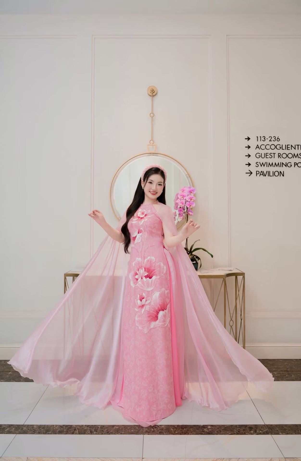 Image VGU No.72 portrays a young woman with a poetic and gentle beauty. She sits gracefully by an antique fountain, adorned in a soft pink silk dress, creating a truly dreamy image. Her clear eyes and gentle smile exude elegance and allure. The pink silk attire enhances her graceful figure, blending harmoniously with the romantic backdrop of the fountain, bringing a sense of peace and captivating charm. This moment beautifully preserves the natural, vibrant, and irresistible grace of the young lady. #Vietnamese #pretty #charmVGU No.71: Discover the Allure of Purple Ao Dai Lotus Flowers and Vietnamese Tradition.