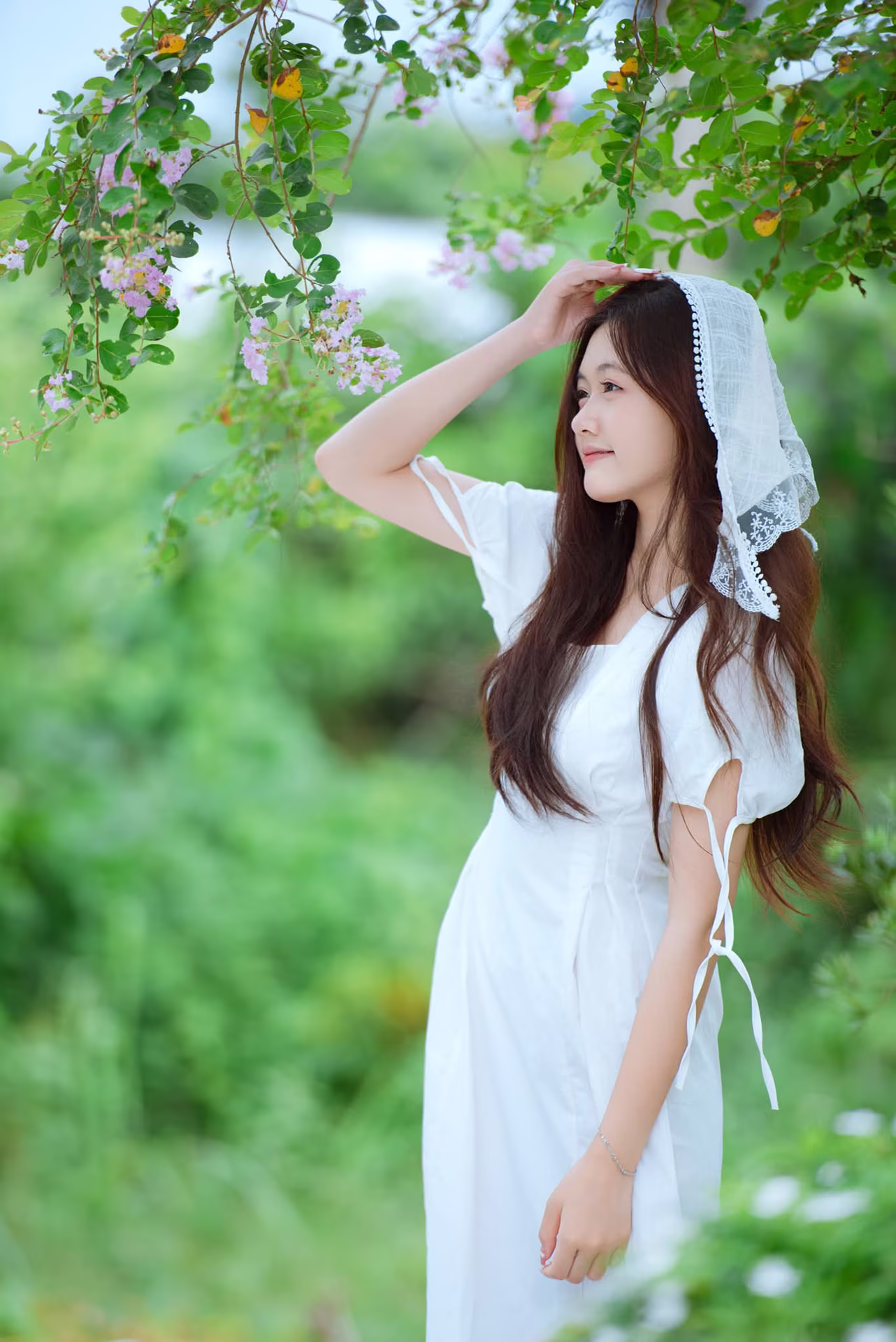 VGU No76 captures a serene moment of a beautiful young woman amidst a vibrant green natural setting Her long flowing hair and pristine white dress exude a pure and gentle charm The delicate lace veil softly adorning her head enhances her graceful and innocent appeal A subtle smile and a dreamy gaze towards the distance create a profound connection with the surrounding environment The fresh green hues of the leaves and tiny blossoms serve as a perfect backdrop for her clear beauty This image radiates vitality and tranquility offering a sense of peace to the viewer It celebrates the harmonious blend of human beauty and the splendor of Vietnamese nature #Vietnamese #pretty #charmVGU No.75: Elegant Youthful Fashion A Charming Duo's Stylish Summer Look