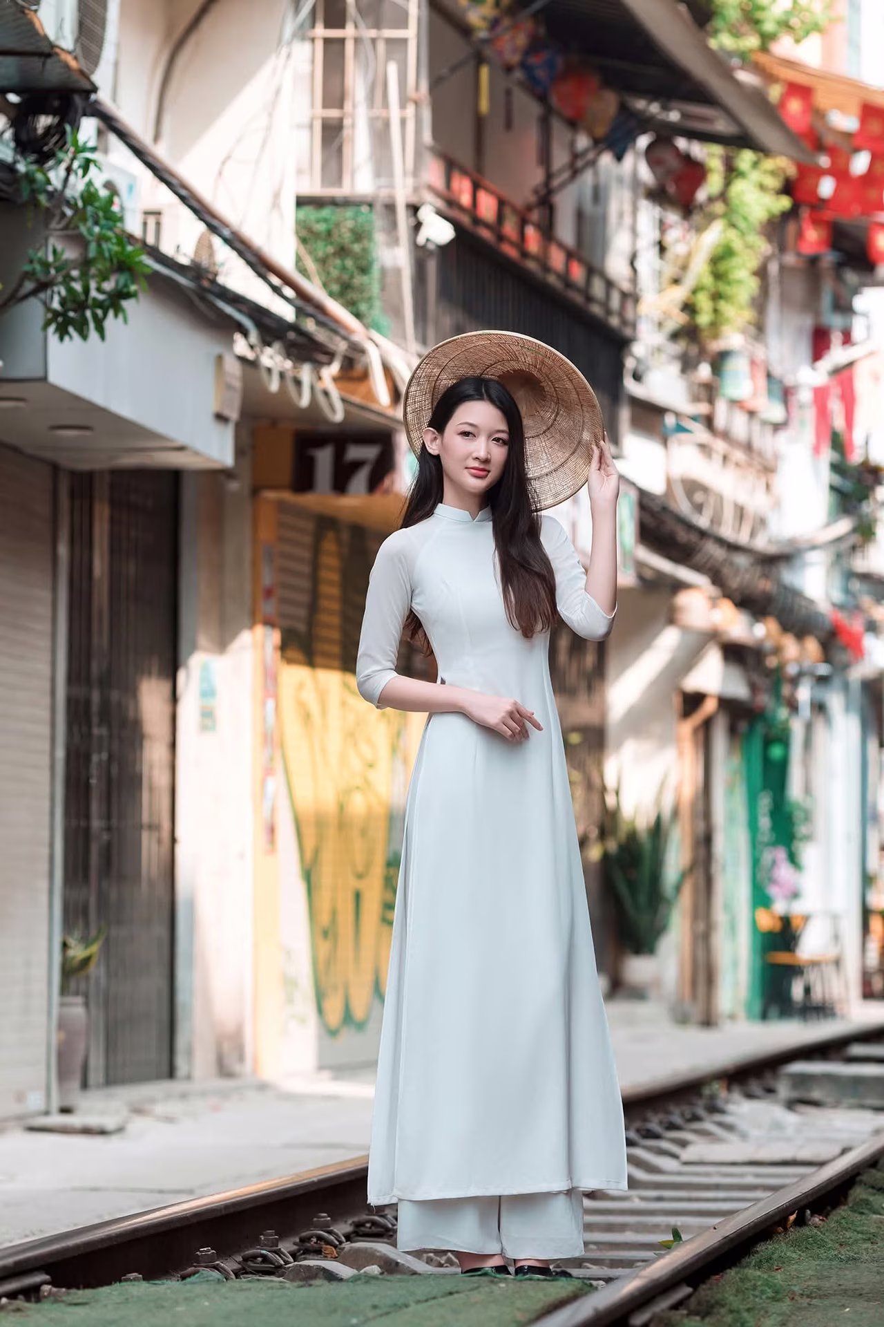 VGU No79 proudly presents the graceful and elegant beauty of a Vietnamese young woman in a pristine white Ao Dai. She stands amidst the charming old Hanoi Train Street a famous tourist destination steeped in history. With a radiant smile and the traditional conical hat held gently behind her the image exudes shyness and tenderness. This photograph not only captures a beautiful moment but also celebrates Vietnam's culture and the iconic Ao Dai traditional dress. The girl's serene elegance combined with the nostalgic atmosphere of the old quarter creates a captivating and harmonious blend. This is an impressive travel highlight for anyone wishing to explore the tranquil beauty and unique culture of Hanoi. #Vietnamese #pretty #charmVGU No.78: Elegant Vietnamese Girl Showcasing Traditional Beauty Amidst Rustic Charm