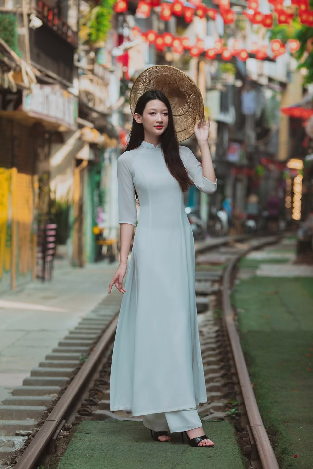 VGU No.80 captures the gentle and elegant beauty of a Vietnamese girl in a light pink ao dai Standing on an old staircase her gaze is deep reflecting the grace and traditional charm of an East Asian woman The flowing ao dai perfectly embraces her figure highlighting sophistication and poise The ancient backdrop with moss-covered walls and lush greenery creates a nostalgic atmosphere emphasizing the timeless beauty of the subject This is more than just a picture it is a story of Vietnamese culture and soul #Vietnamese #pretty #charmVGU No.79: Elegant Vietnamese Ao Dai Beauty on Hanoi Train Street