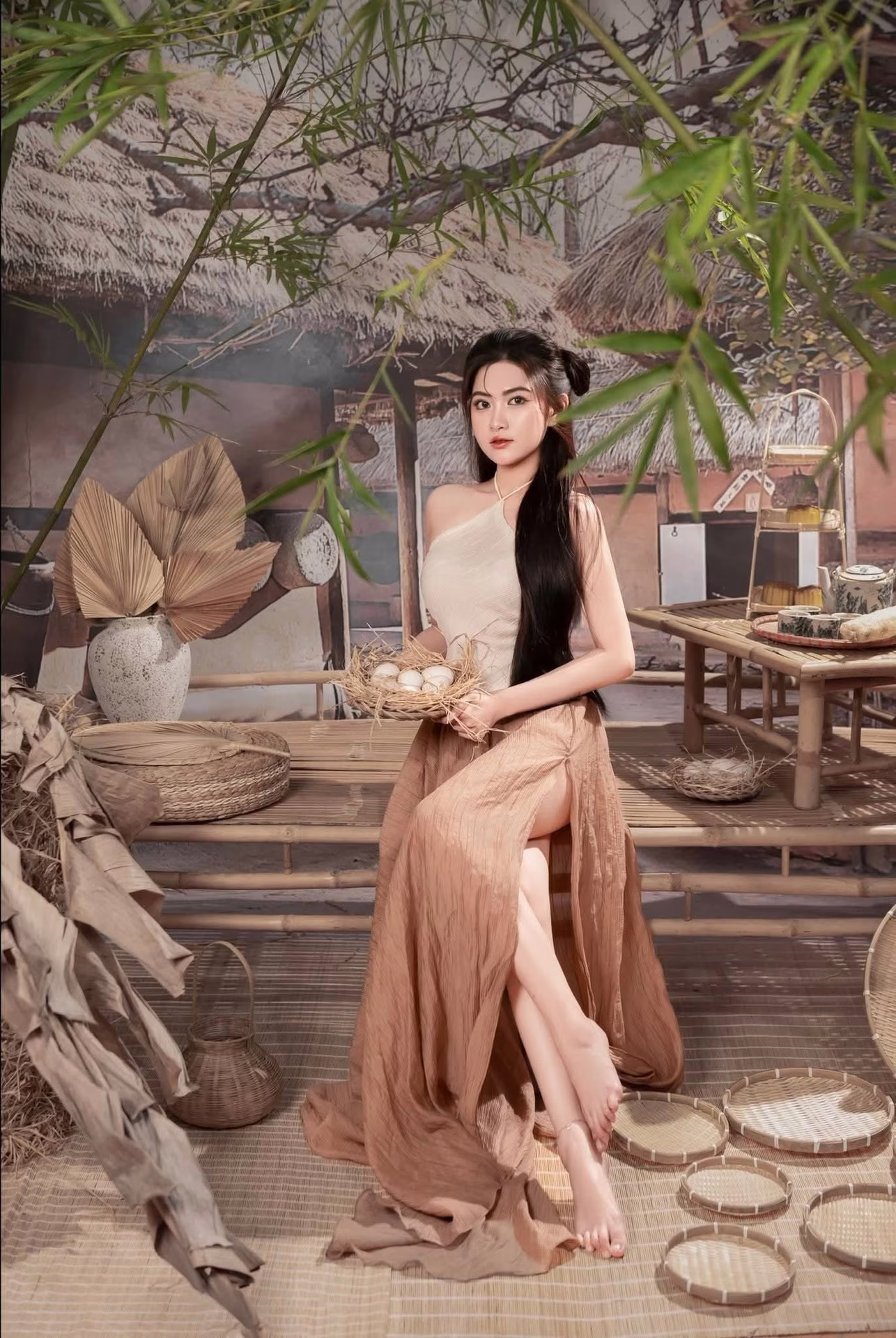 This image VGU No78 captures a Vietnamese girl exuding a gentle and elegant beauty that is utterly captivating She is adorned in a traditional inspired outfit featuring a stylish one shoulder top and a graceful long slit skirt highlighting her slender figure Her long dark hair and dreamy eyes complemented by a delicate forehead adornment add to her mysterious and alluring charm The rustic backdrop of a thatched house and lush bamboo leaves creates a serene and poetic Vietnamese countryside ambiance Overall this picture VGU No78 not only portrays the beauty of the woman but also evokes a deep sense of traditional culture a harmonious blend of human elegance and natural tranquility offering viewers a nostalgic and peaceful feeling #Vietnamese #pretty #charmVGU No.77: Elegant Vietnamese Girl in White Ao Dai by Hanois Hoan Kiem Lake