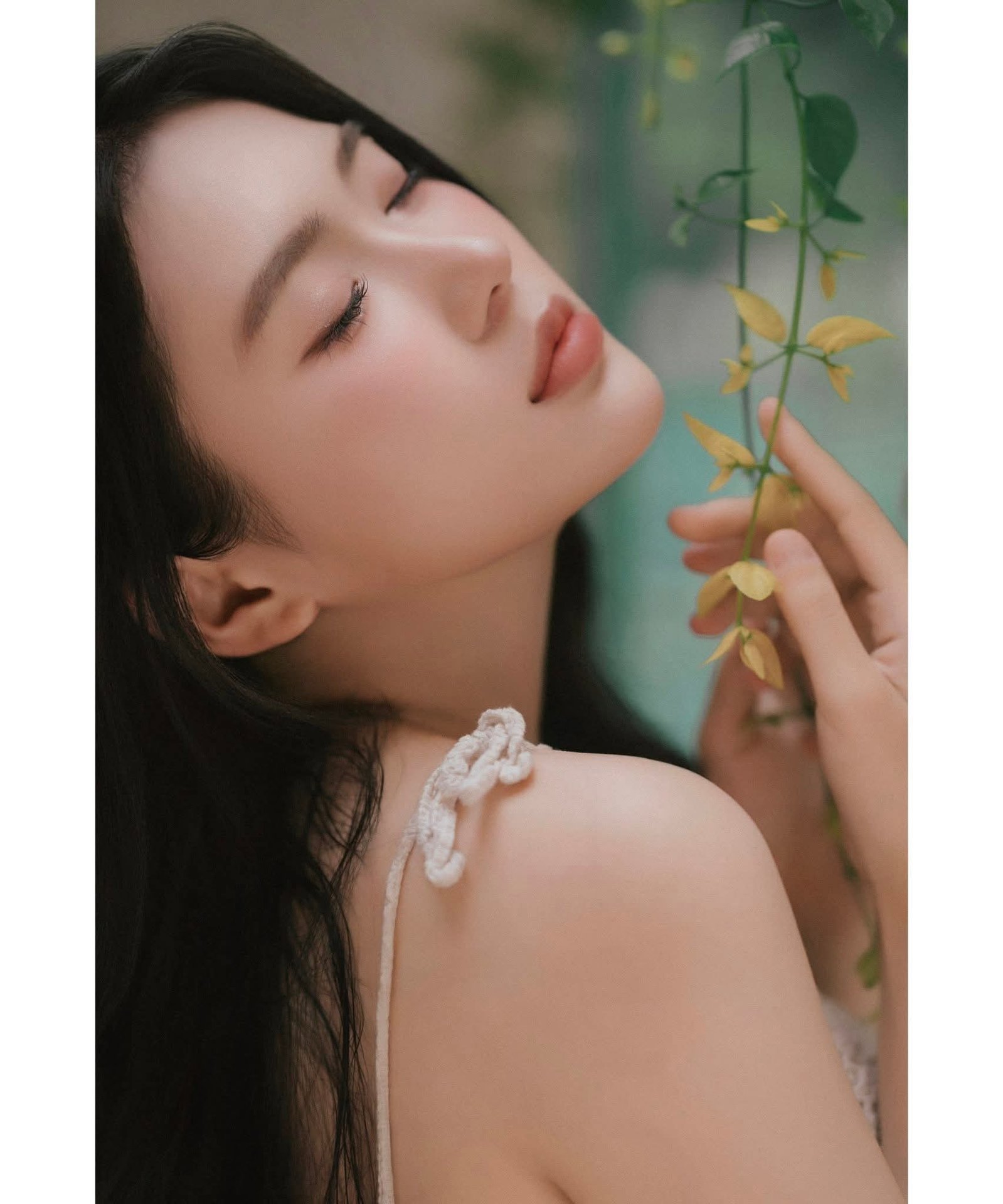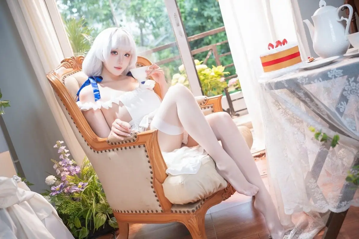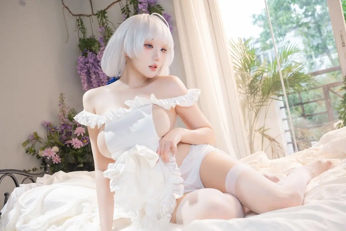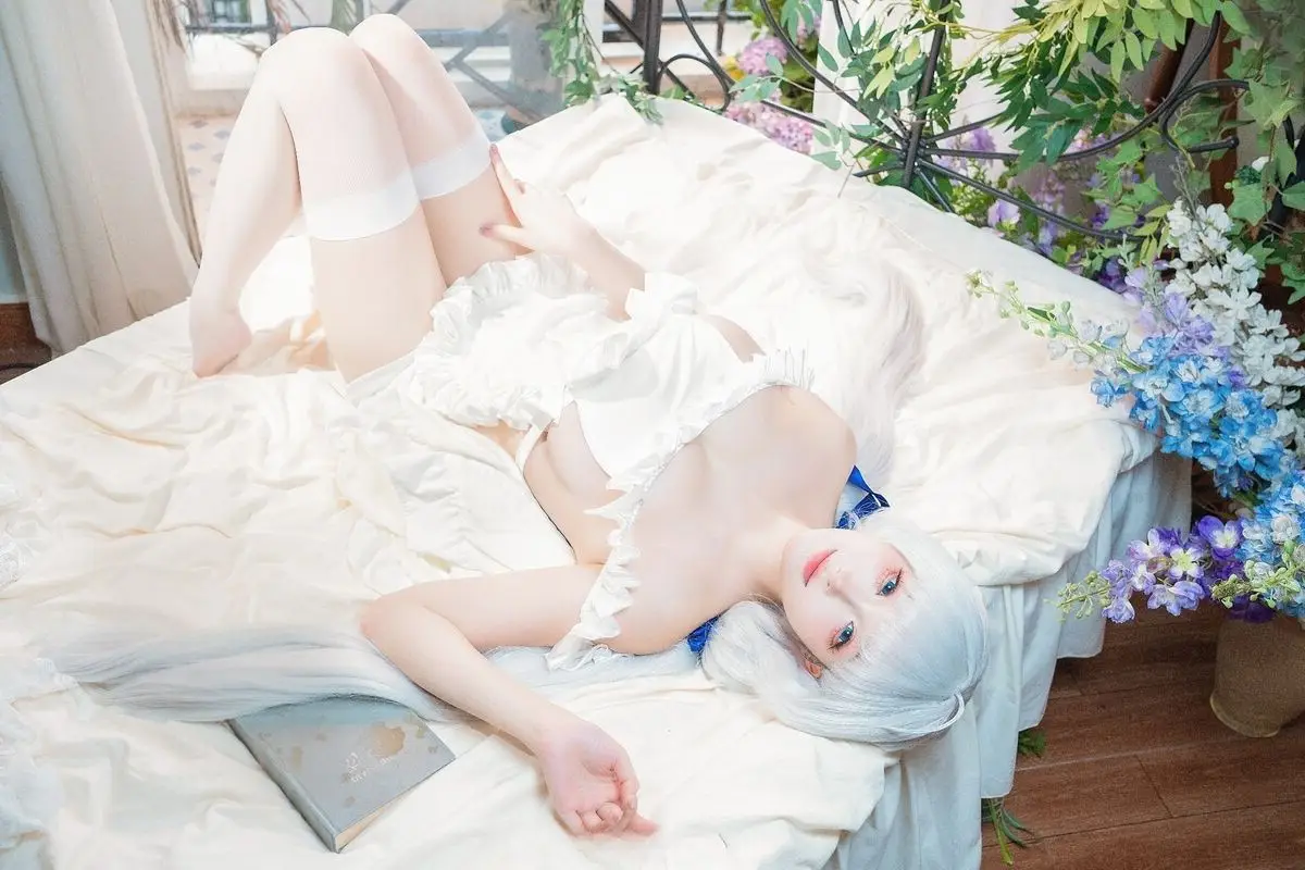 Coser Gua Xi Jiang masterfully embodies the character Illustrious from the game Azur Lane, presenting a graceful and utterly captivating beauty. Set in a romantic ambiance, she reclines elegantly on a pristine white-sheeted bed, adorned in a pure white outfit with delicate lace accents that highlight her refined charm. Her dreamy gaze and gentle expression create an irresistible allure. Surrounding her are blue-purple flowers and lush greenery, adding a poetic touch, as if a fairy is resting in an enchanted garden. This image not only perfectly recreates Illustrious but also showcases Coser Gua Xi Jiangs elegance and captivating appeal.#Coser #GuaXiJiang #AzurLane #Illustrious #GameCosplay #ElegantCosplay