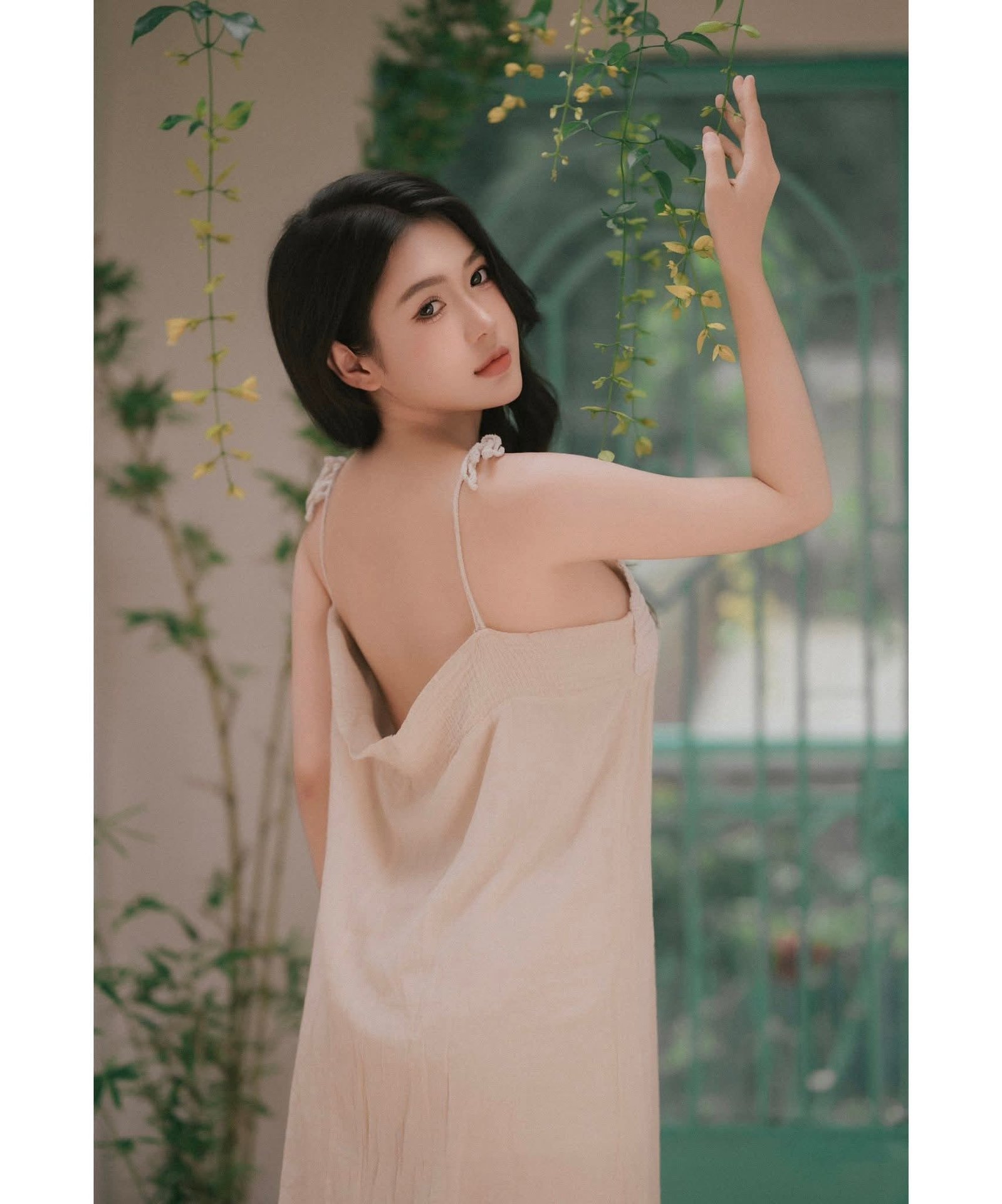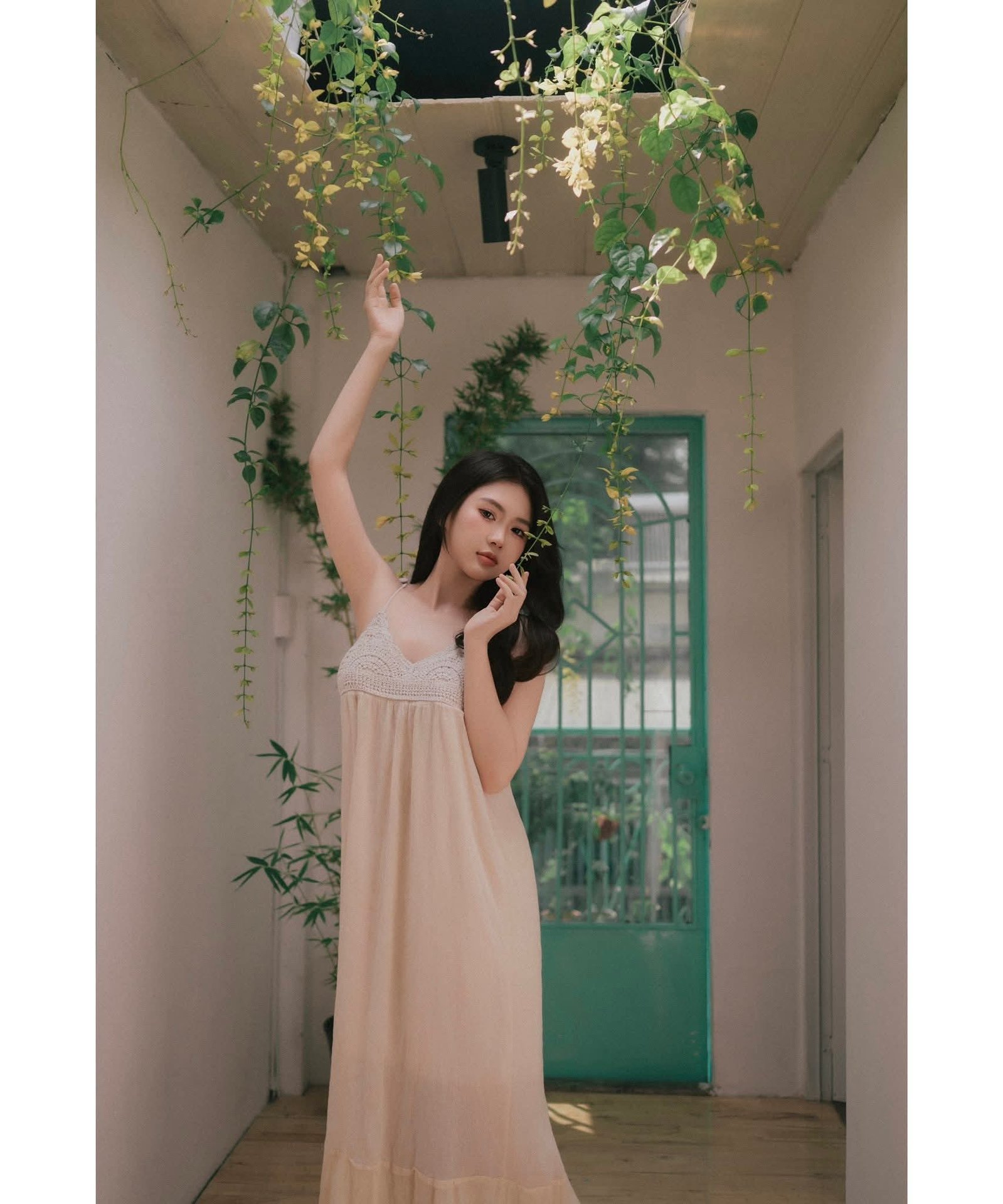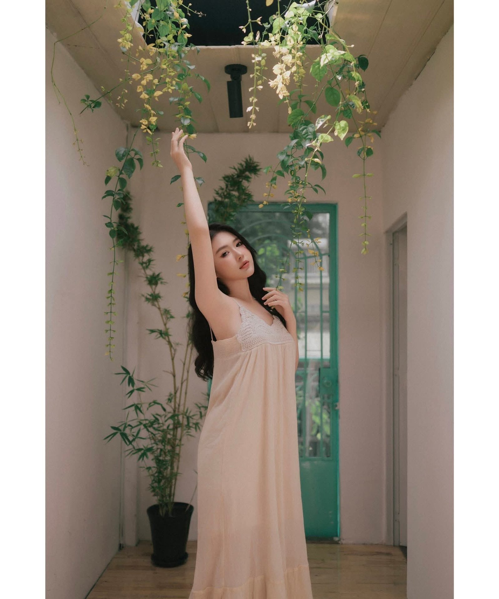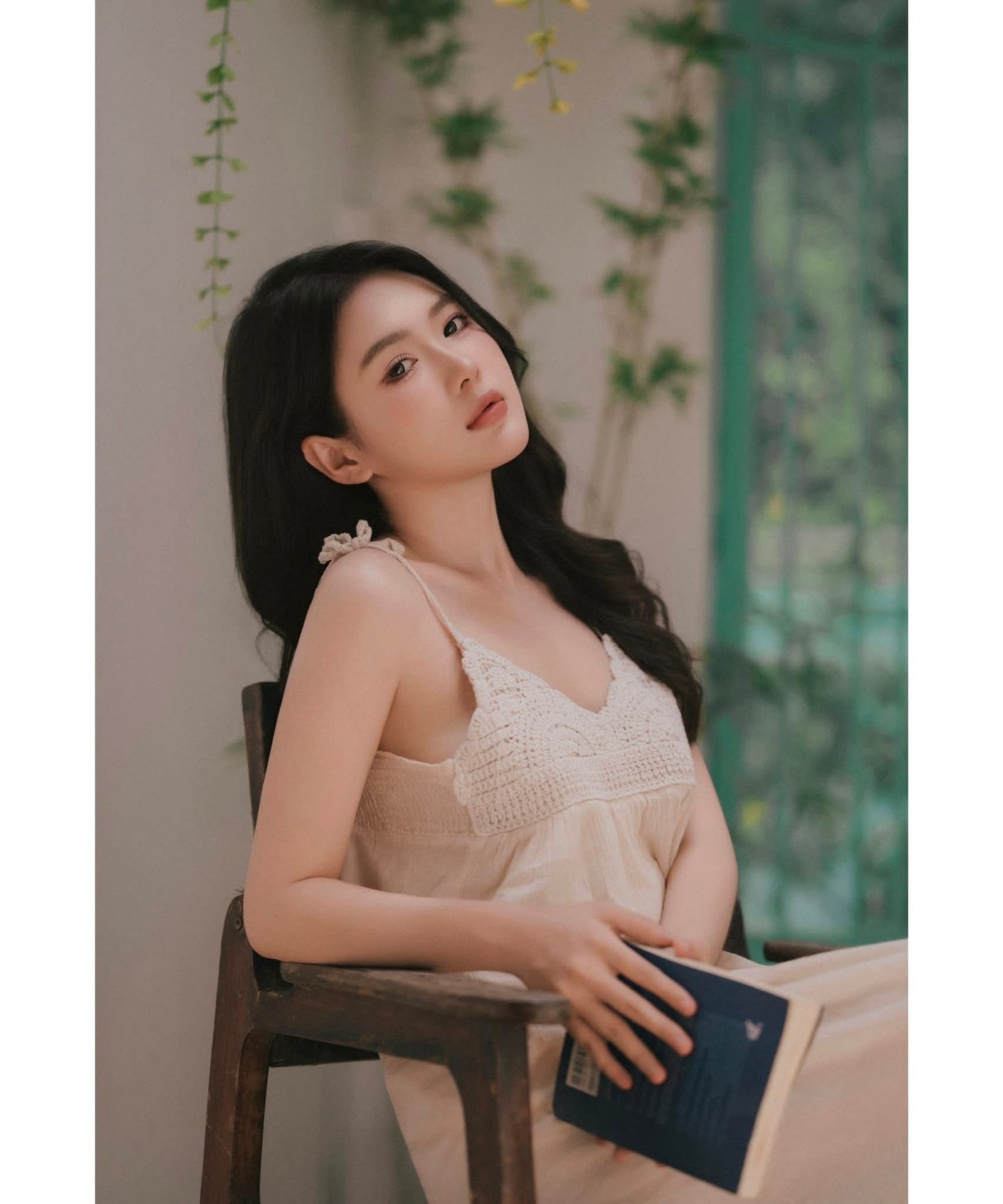 In this captivating image, a young woman with long dark hair is captured in a moment of absolute tranquility. Seated gracefully on a rustic wooden chair, she wears a delicate cream-colored slip dress with an open book resting gently on her lap. Her eyes are softly closed and her serene expression radiates a profound sense of peace as if she is drifting into a beautiful dream or deep contemplation under the soft natural light. The surrounding environment adorned with lush green foliage and abundant natural light creates an invitingly cozy and quiet ambiance. This photograph beautifully encapsulates self-care ethereal beauty and the precious value of rest allowing the soul to find serenity amidst life's demands. It evokes the feeling of a calm afternoon where time stands still celebrating the elegance of simplicity and stillness.Đông Hoàng