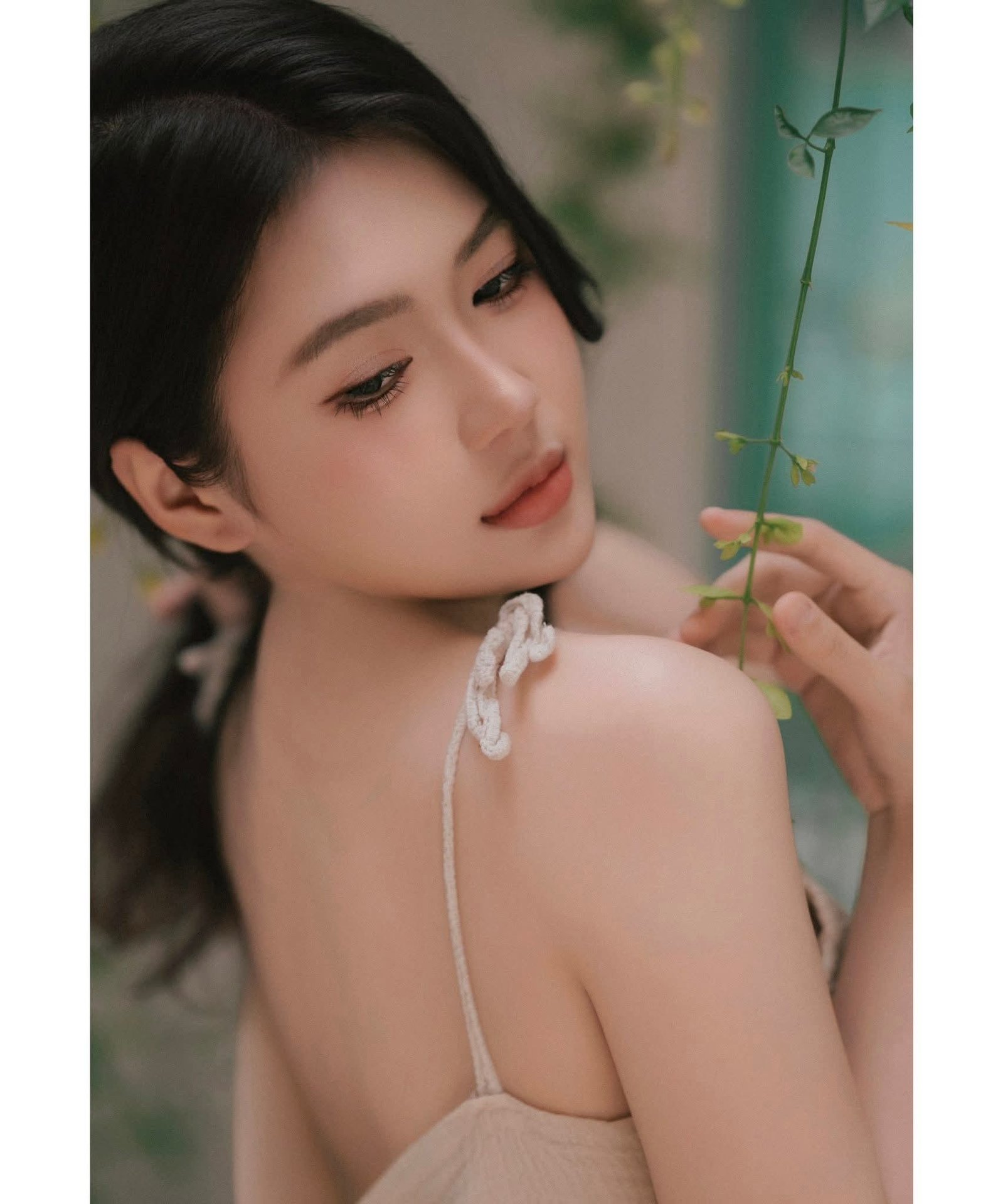 VGU No.91 presents an enchanting scene delicately capturing the ethereal beauty of a muse. The woman with her long flowing dark hair and gently closed eyes exudes a profound sense of serenity and dreaminess. Her soft green attire perfectly complements the pristine white blossoms that frame her creating a natural and romantic tableau. Every detail from the gentle play of light to her hand gracefully resting on her cheek evokes a narrative of inner peace pure beauty and heartfelt emotion. This is more than just a portrait it is a timeless moment inviting viewers to immerse themselves in a world of gentle dreams and find tranquility in every exquisite line and shade. #Vietnamese #pretty #charm