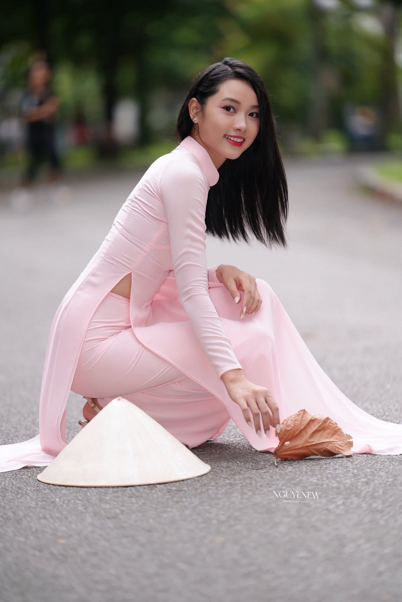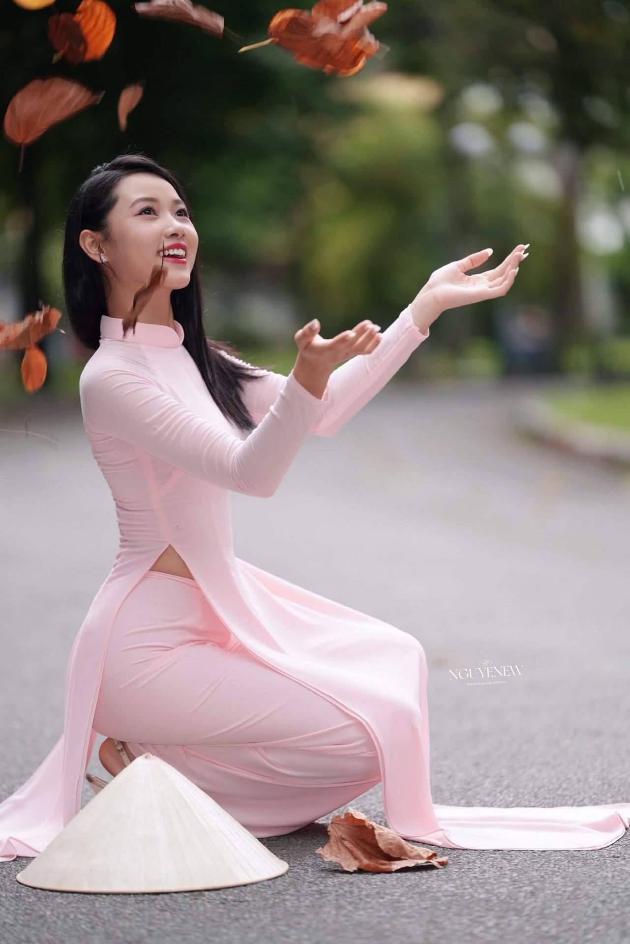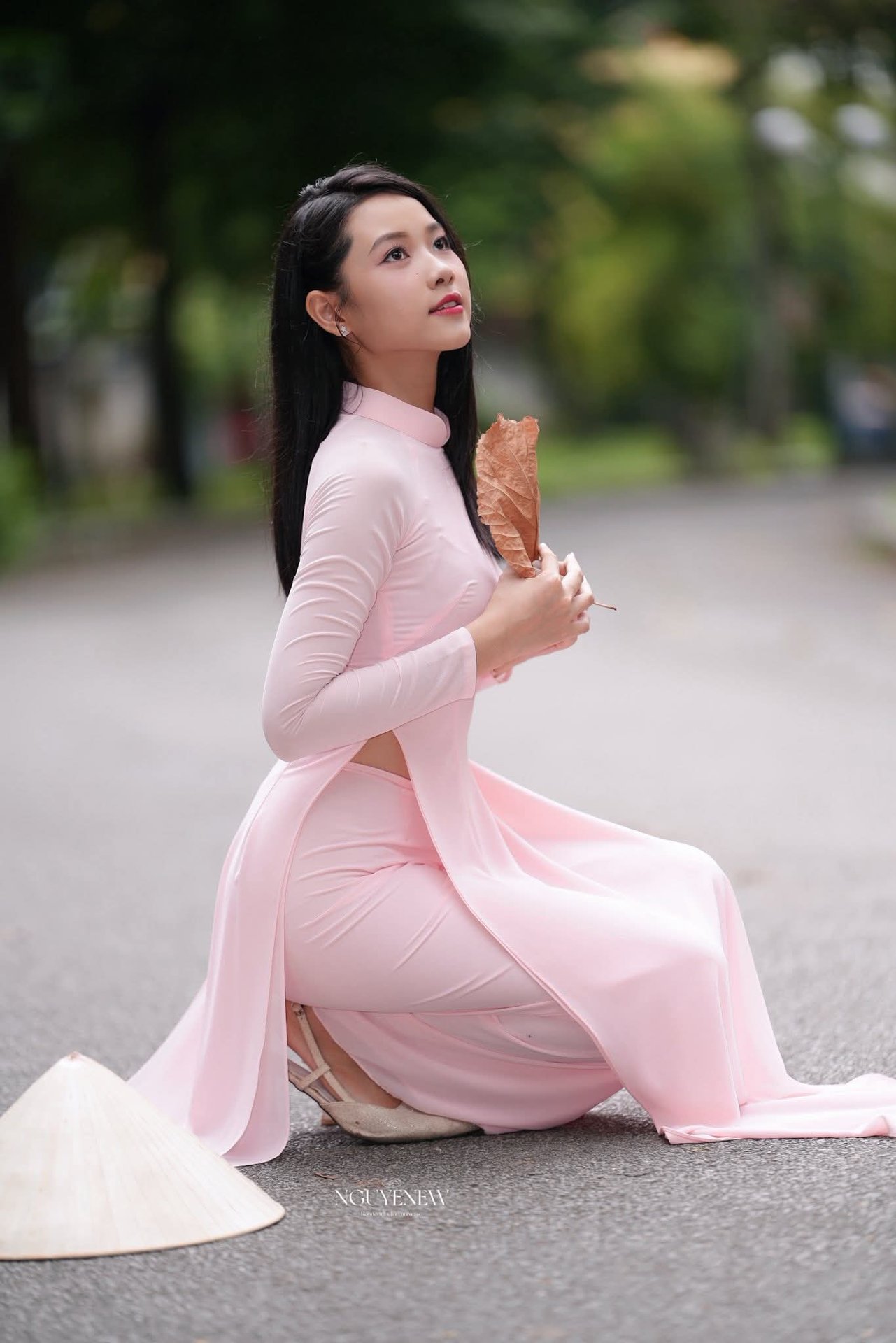 This exquisite photograph captures a beautiful young Vietnamese woman gracefully adorned in a soft pink ao dai. Her gentle smile and serene gaze exude an elegant charm that captivates every viewer. The perfectly tailored ao dai accentuates her slender figure, embodying the timeless grace and traditional allure of Vietnamese women. Resting beside her are a pristine white conical hat (nón lá) and a rustic dried leaf, subtle yet profound symbols of Vietnamese heritage and connection to nature. The lush green backdrop of trees enhances the tranquil and pure essence of this moment. This image beautifully blends contemporary elegance with rich cultural tradition, celebrating the enduring vitality and captivating charm of the iconic Vietnamese ao dai.Đông Hoàng