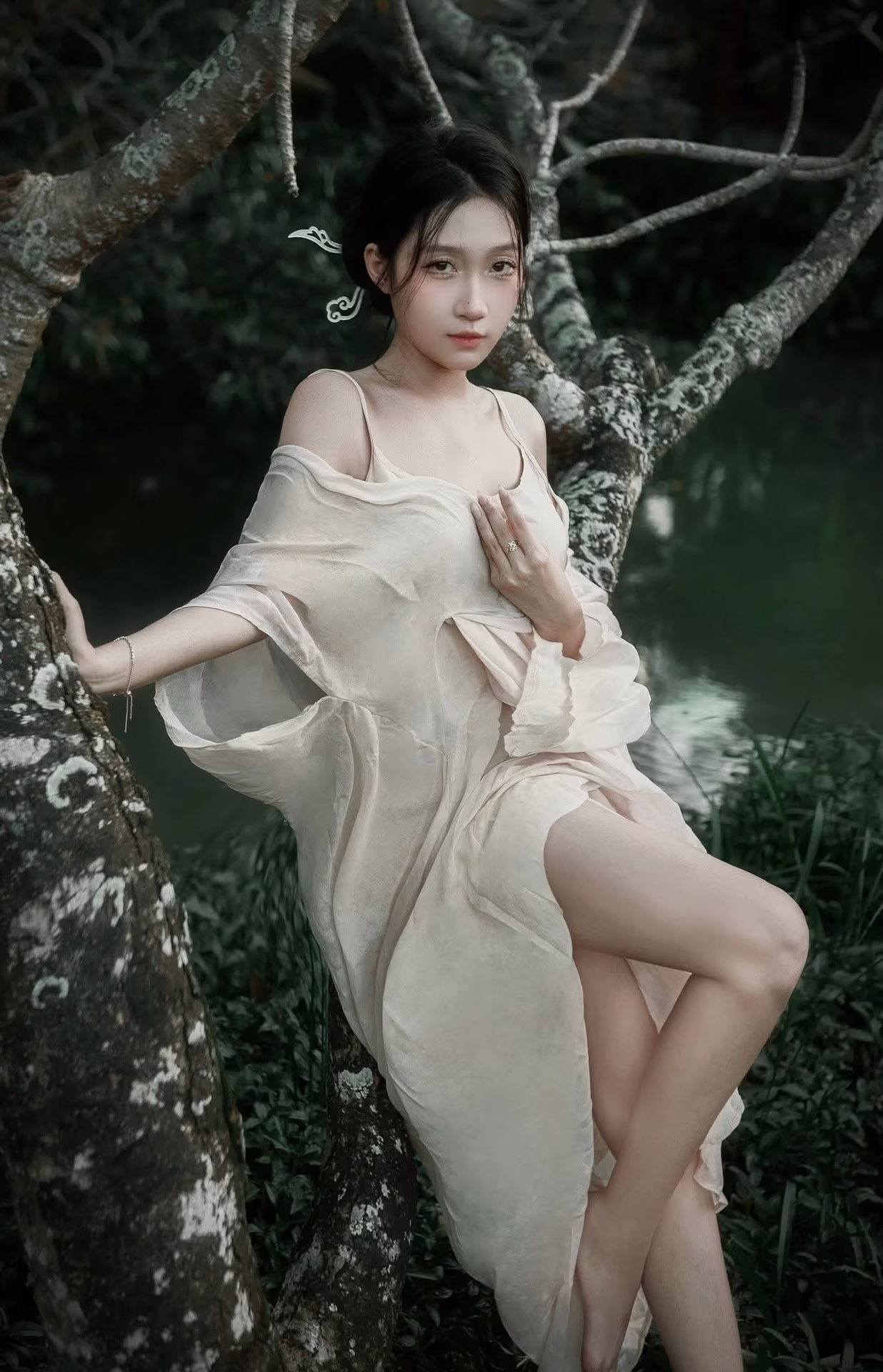 The XVG No.35 image captures an enchanting East Asian muse, embodying delicate beauty and grace, akin to a living work of art. She sits thoughtfully by tranquil waters, adorned in a flowing, ethereal gown that highlights her elegance. Her gentle, downward gaze conveys a sense of introspection and quiet emotion, creating a moment of profound serenity. A delicate white and yellow lotus flower rests beside her, enhancing the pure aesthetic and harmonizing with the peaceful natural setting. This photograph transcends mere imagery; it is an artistic masterpiece, evoking timeless tranquility and exquisite beauty.Stories