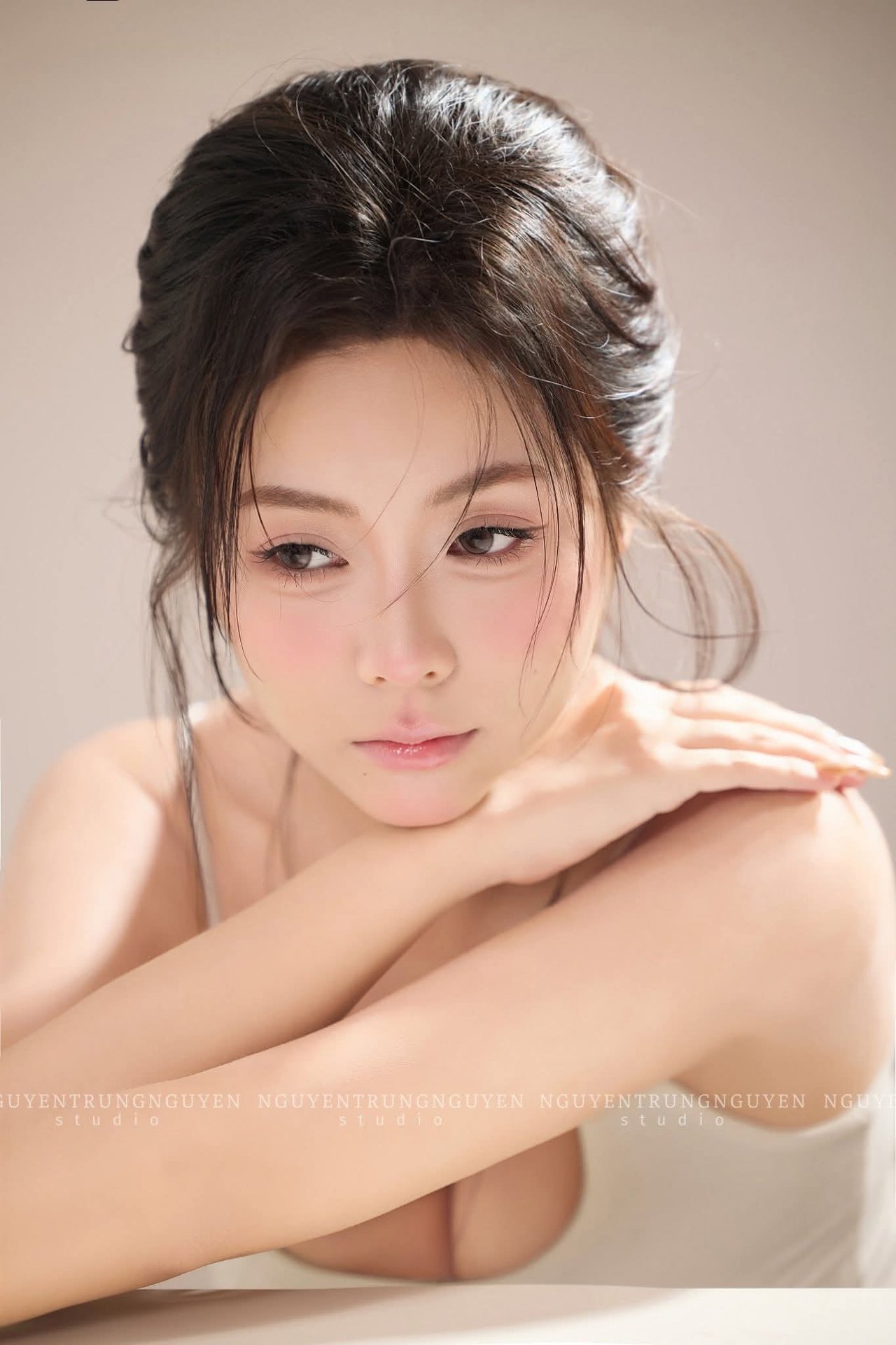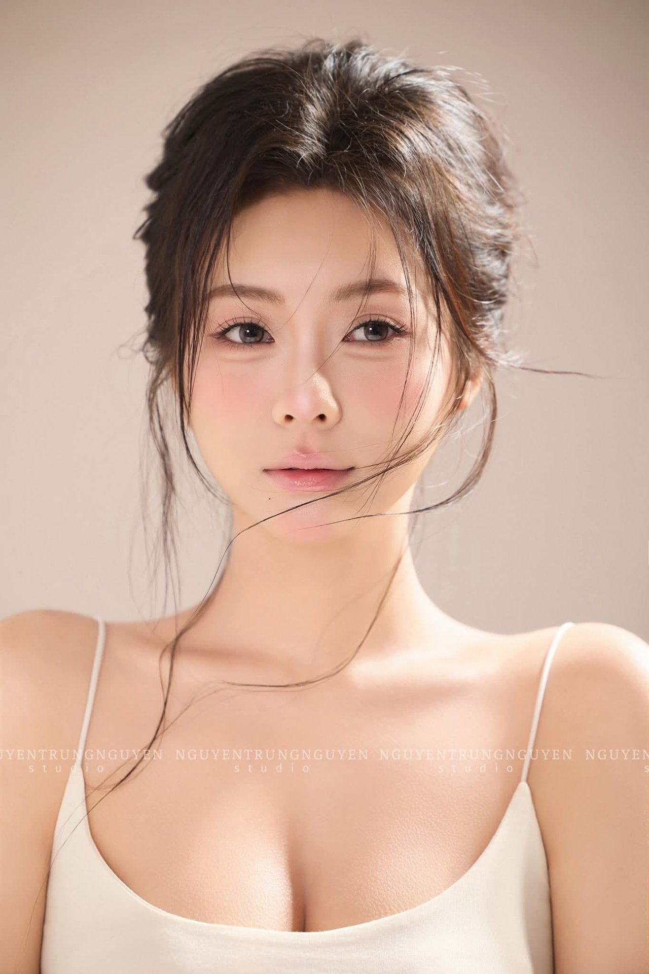 This close-up portrait celebrates the natural and pristine beauty of a young woman. With a gentle gaze and serene expression, she exudes a sense of peace and captivating charm. Her soft dark hair and smooth skin, subtly enhanced by a touch of pink on her cheeks, highlight her understated elegance. The simple yet refined white spaghetti strap top contributes to a harmonious and graceful overall look. This beautiful portrait photography captures a moment filled with emotion and self-assurance, offering a profound glimpse into authentic beauty without any pretense.Đông Hoàng