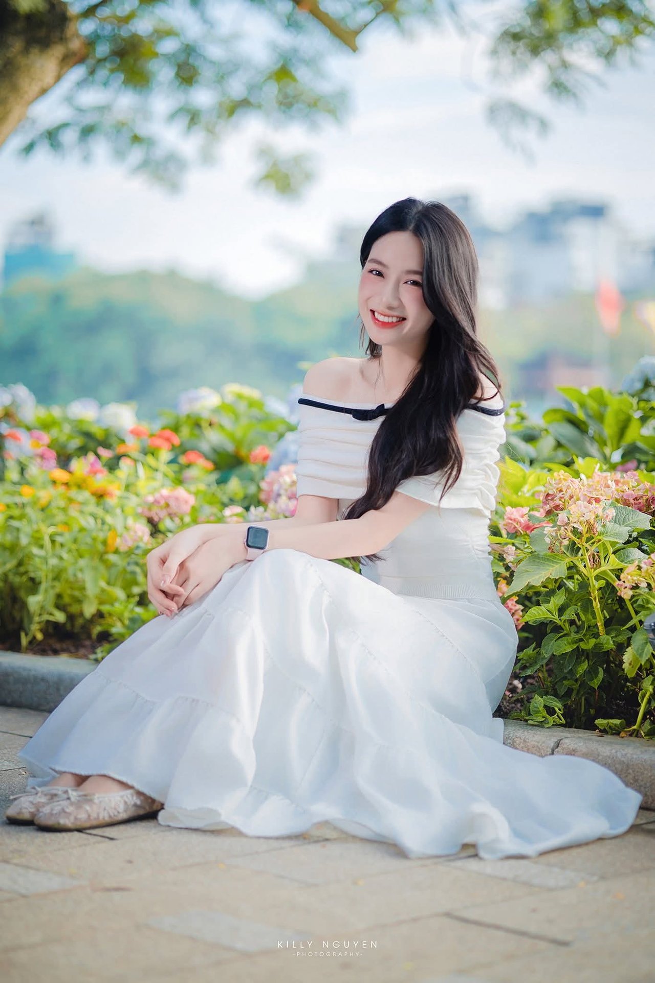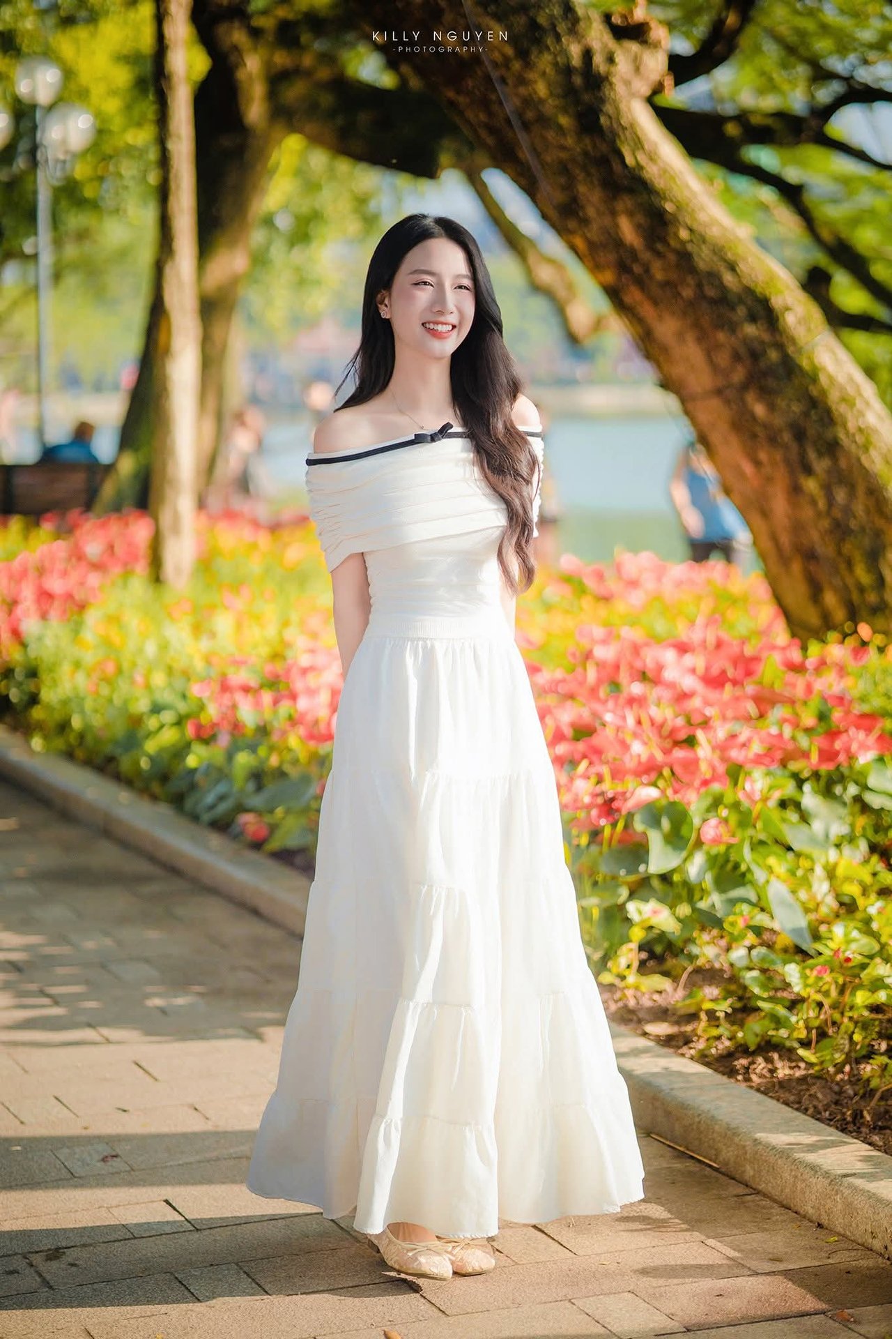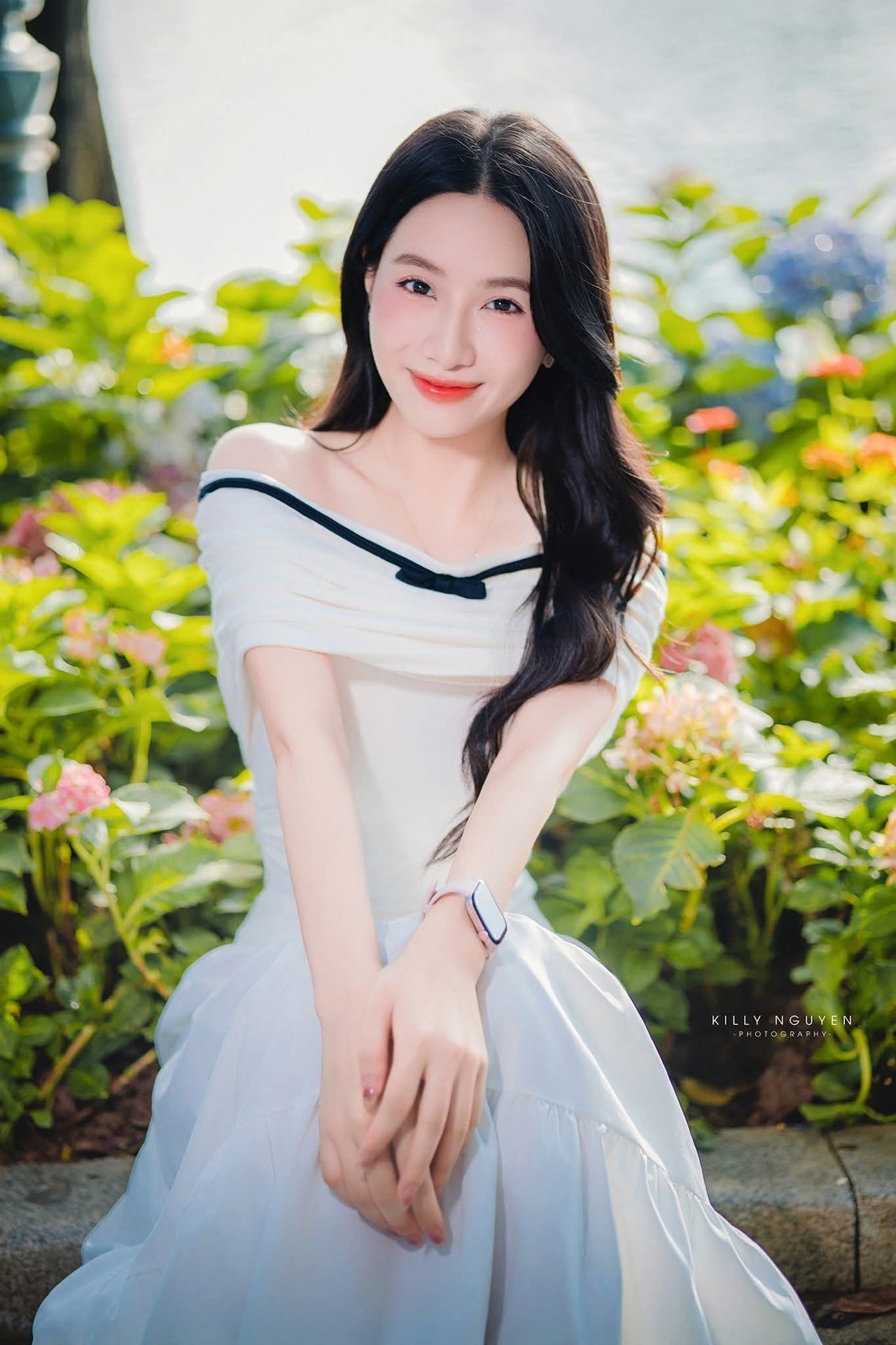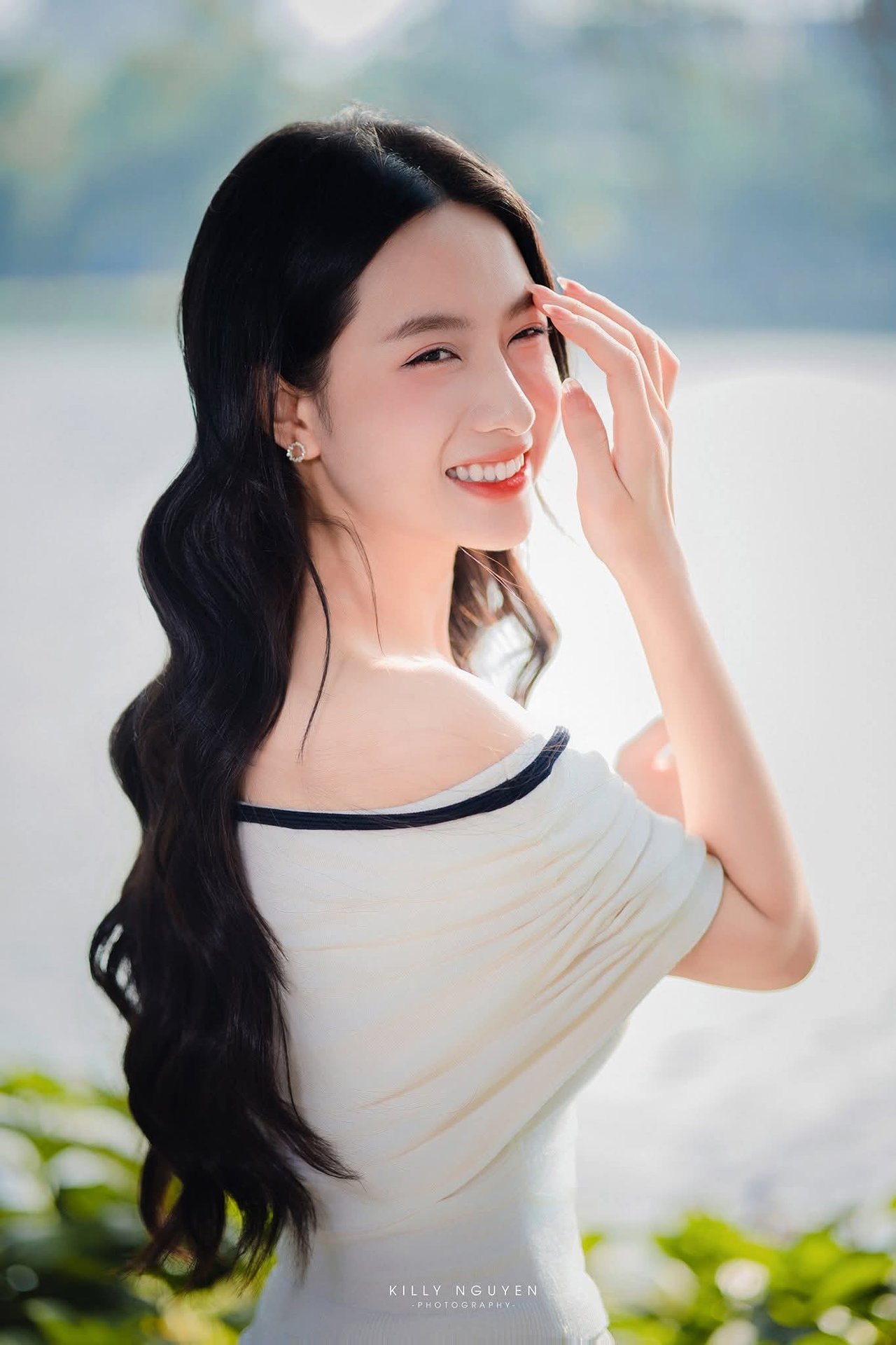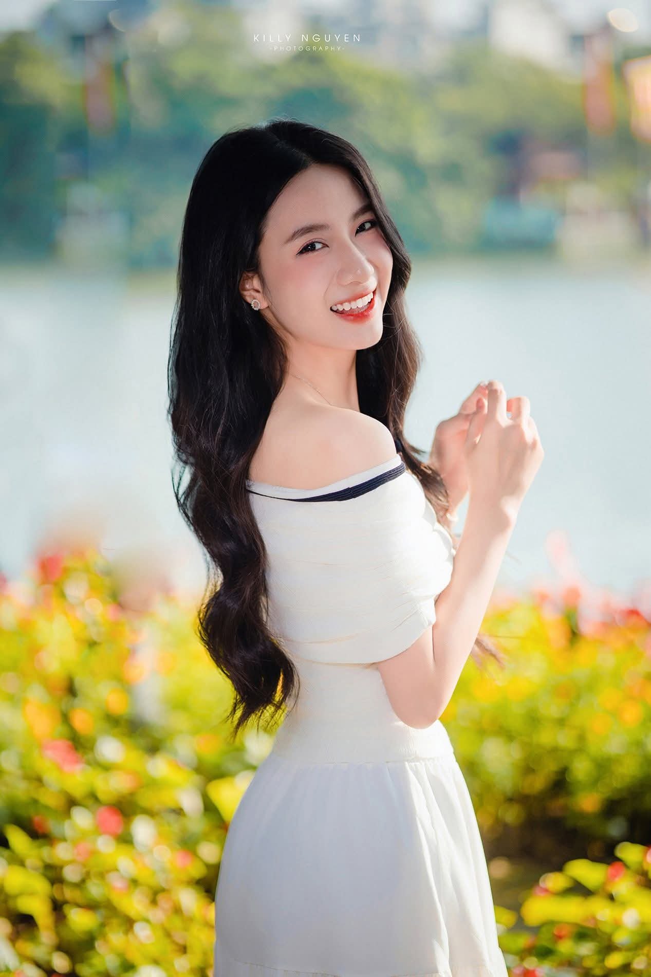This stunning photograph captures a radiant moment of a Vietnamese girl with a bright smile and eyes full of joy. She possesses an elegant gentle beauty long flowing hair and fair skin. Her pristine white off shoulder dress accentuates her graceful and refined charm. In the background lush green nature bathed in golden sunlight creates a perfect backdrop highlighting her beauty. The natural light illuminates her face bringing a fresh and vibrant feel. This image represents the beauty of Vietnamese people both modern and traditionally graceful amidst a serene environment.Đông Hoàng