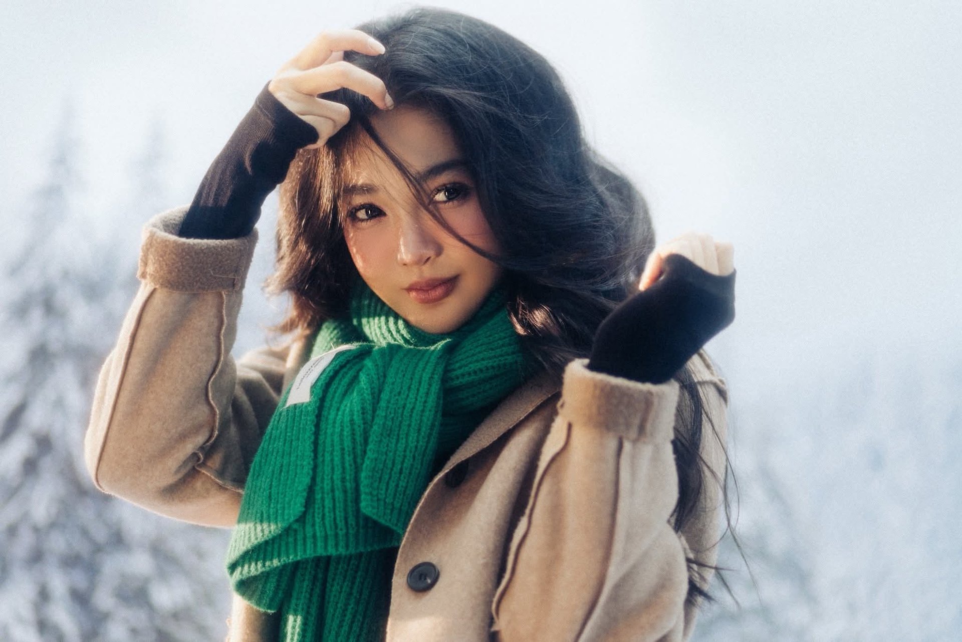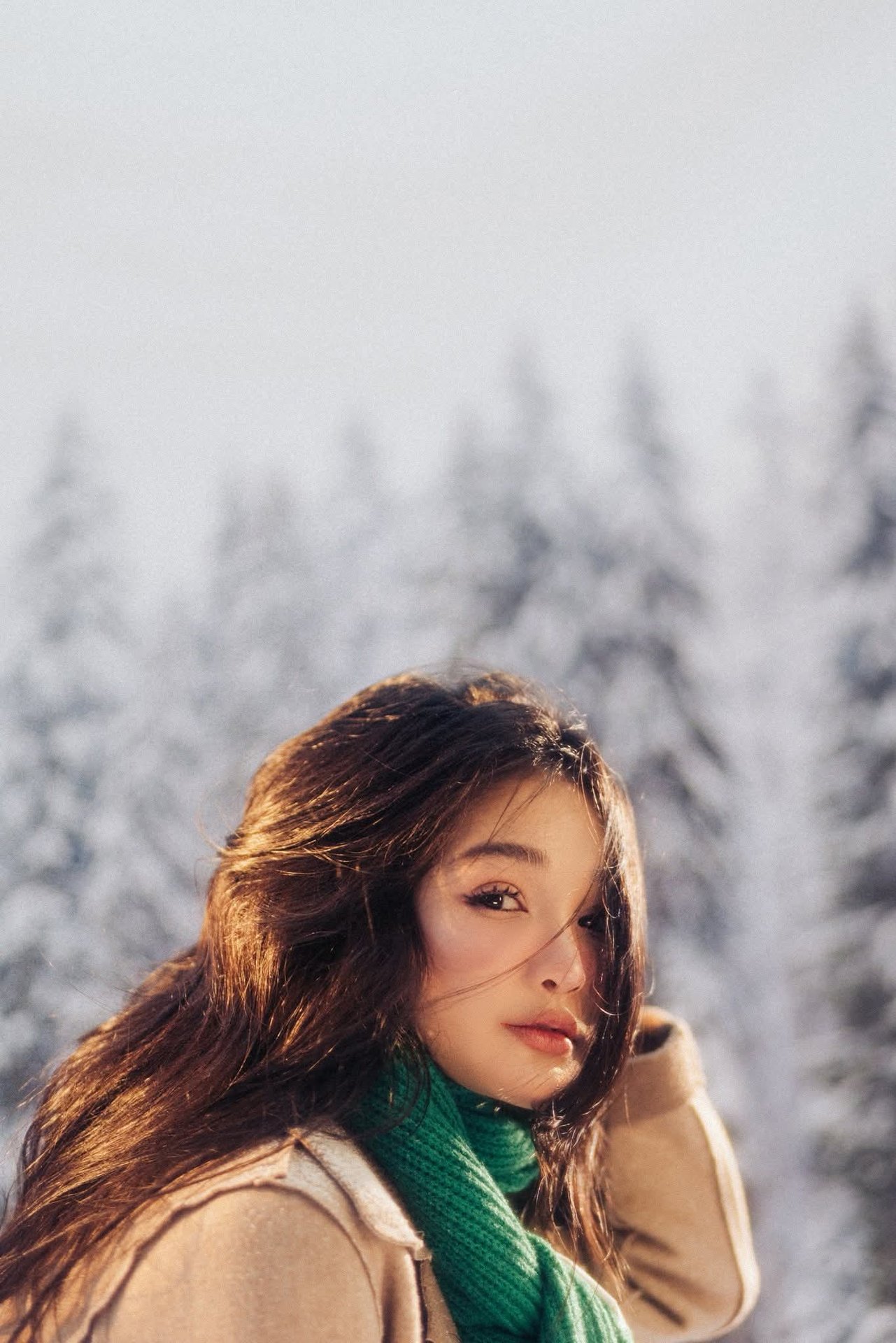 This image captures a beautiful moment of a young Asian girl amidst a magical winter wonderland. Her radiant smile shines brightly against the pristine white of the snow and the frost-covered pine trees. Natural light highlights her long dark hair and her delicate, natural beauty. She appears to be fully embracing the serenity and splendor of the cold natural environment, with her hands gently raised as if to cup delicate snowflakes. This is not merely a winter portrait but also a symbol of vitality and joy amidst the chill, conveying a sense of warmth and happiness to the viewer.