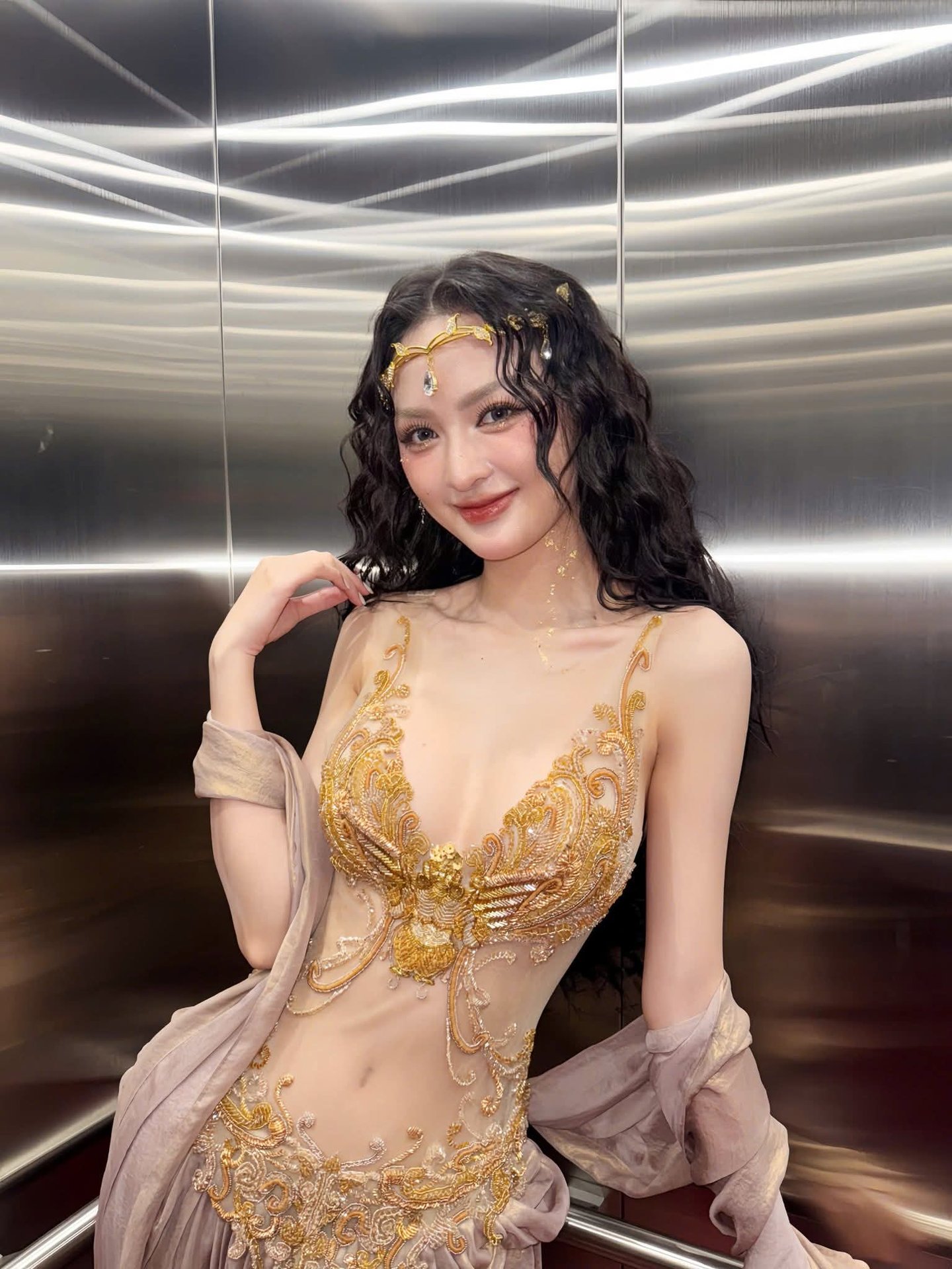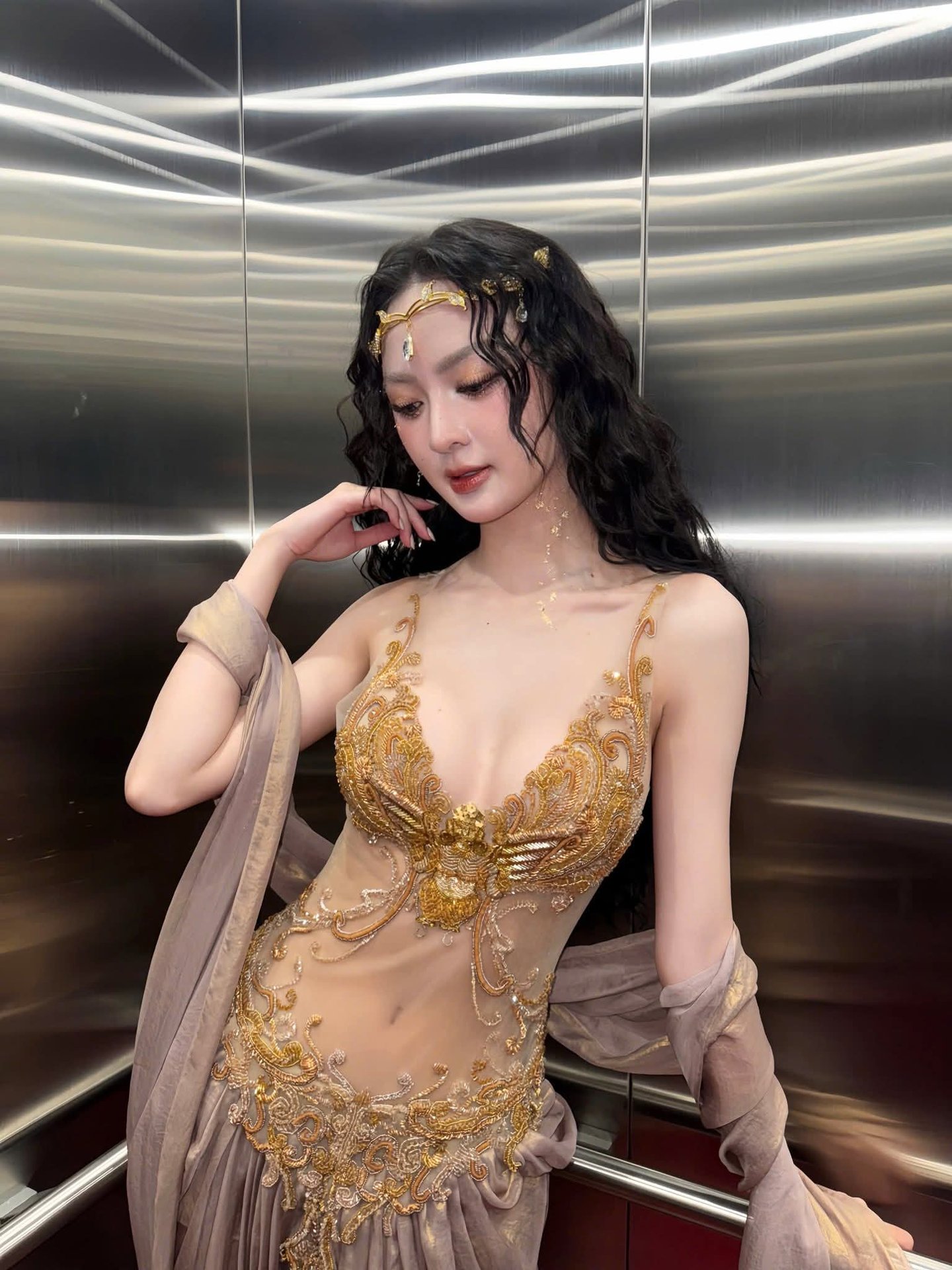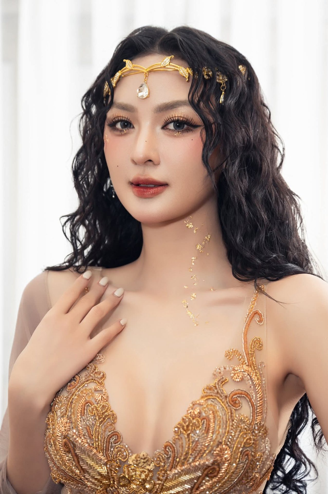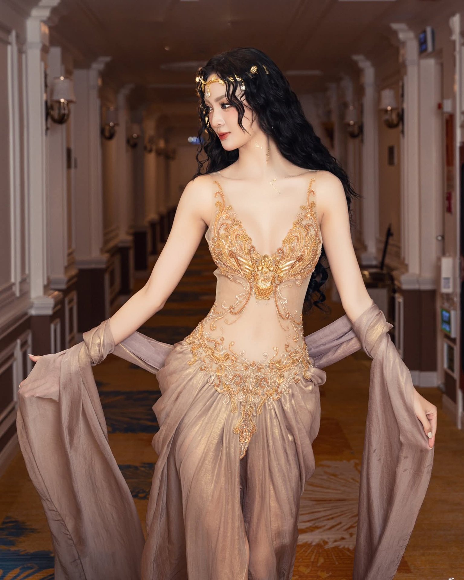 This stunning photograph captures a woman embodying captivating Asian beauty exuding an aura of luxury and allure She is elegantly seated on a classic sofa adorned in a magnificent outfit featuring intricate gold embroidery reminiscent of regal attire Her flowing dark hair and sparkling headpiece further enhance her noble and mysterious charm Her deep gaze and gentle smile create an irresistible appeal reflecting confidence and grace This is more than just a fashion portrait it is an artistic masterpiece celebrating timeless beauty rich with emotion and profound depth making it a truly remarkable visual experience