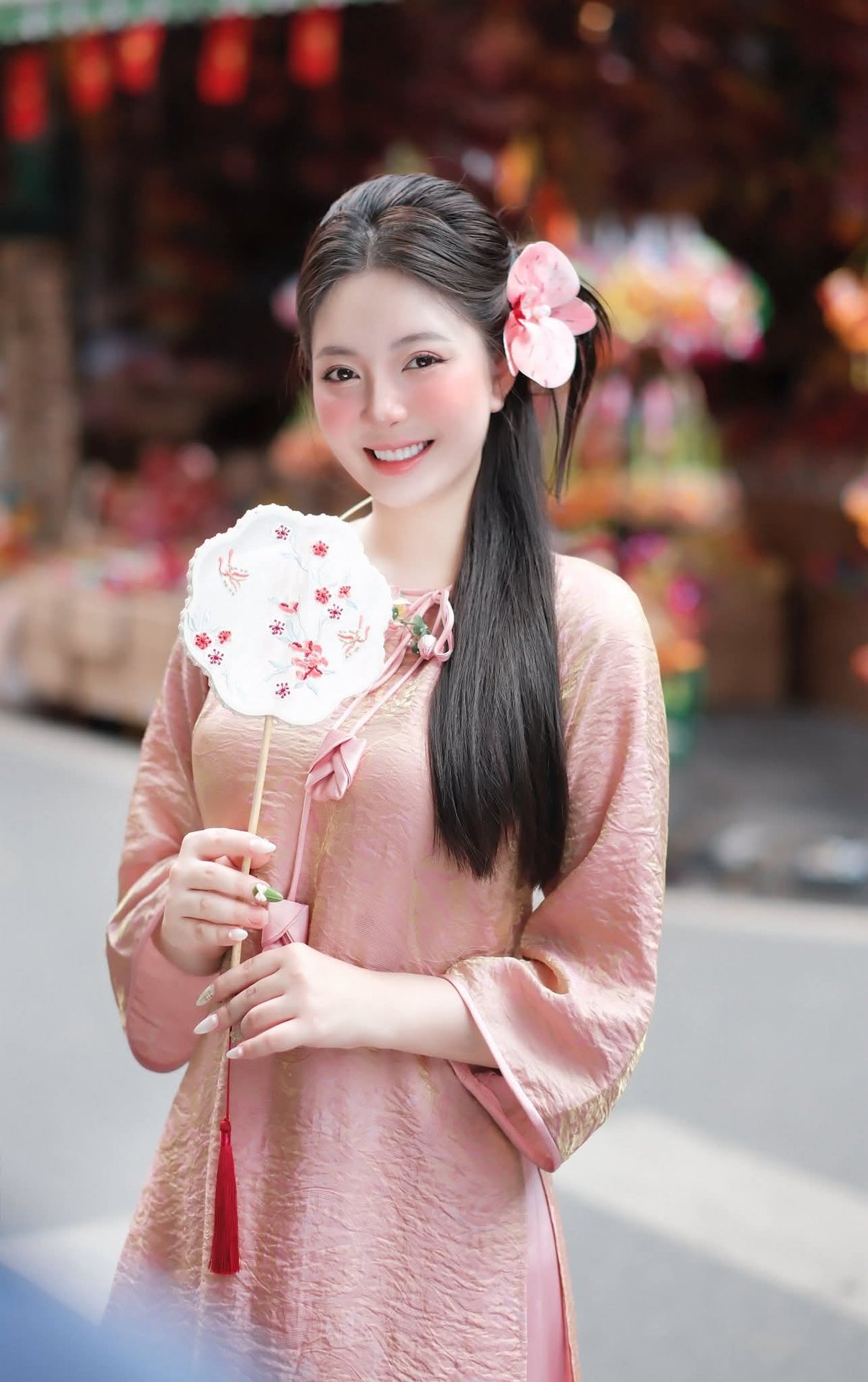 This stunning portrait captures a Vietnamese girl exuding gentle grace and elegance. She wears a beautiful modernized Ao Dai in soft pastel pink highlighting her fair skin and long flowing hair. A delicate pink flower adorns her hair complementing the traditional paper umbrella she holds creating a harmonious and poetic image. Her dreamy eyes and subtle smile convey a sense of serenity and the unique charm of an East Asian woman. This photograph is more than just a moment it celebrates the beauty of Vietnamese traditional culture blended with modern flair evoking noble and graceful values. It is a perfect representation of timeless beauty and cultural pride.