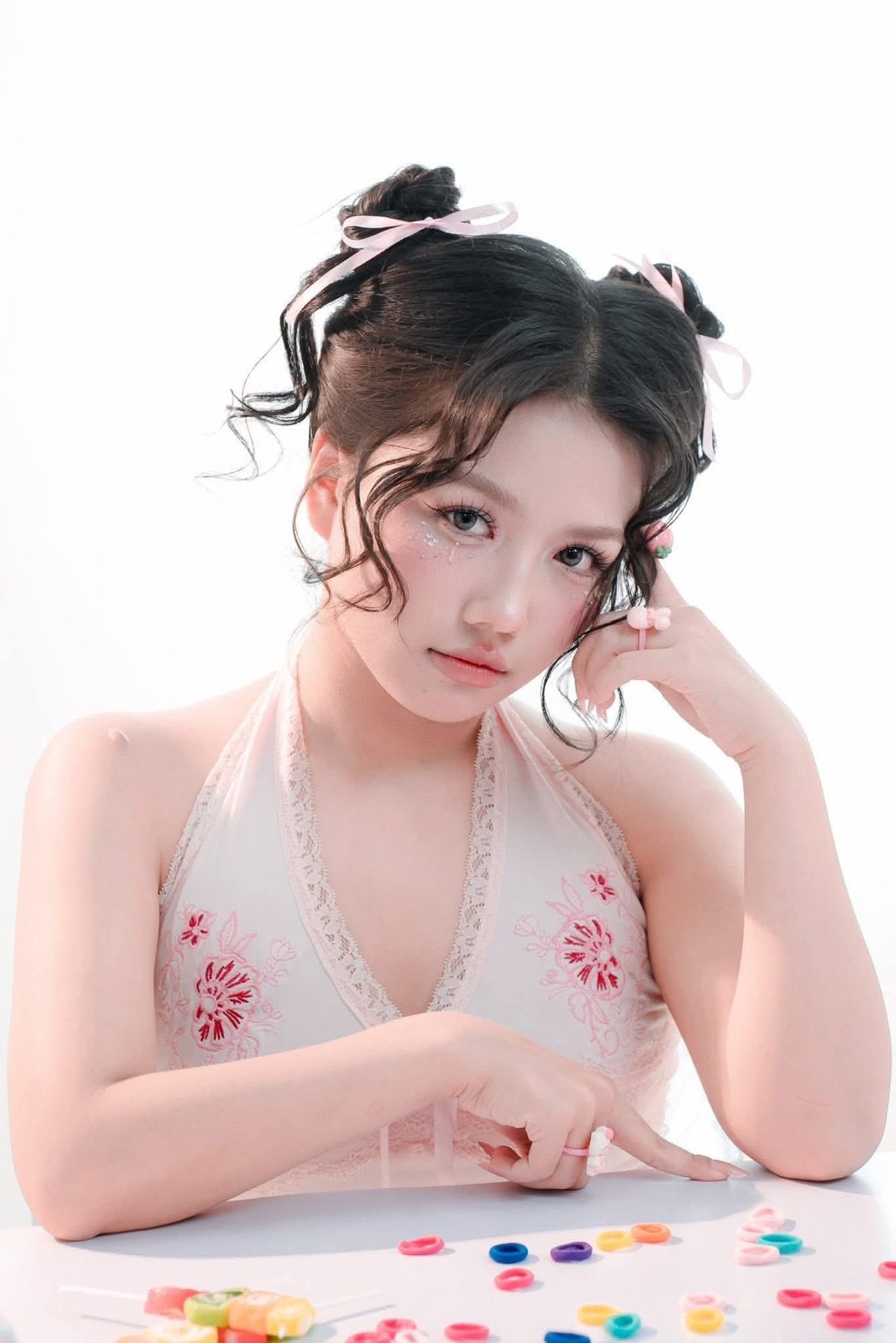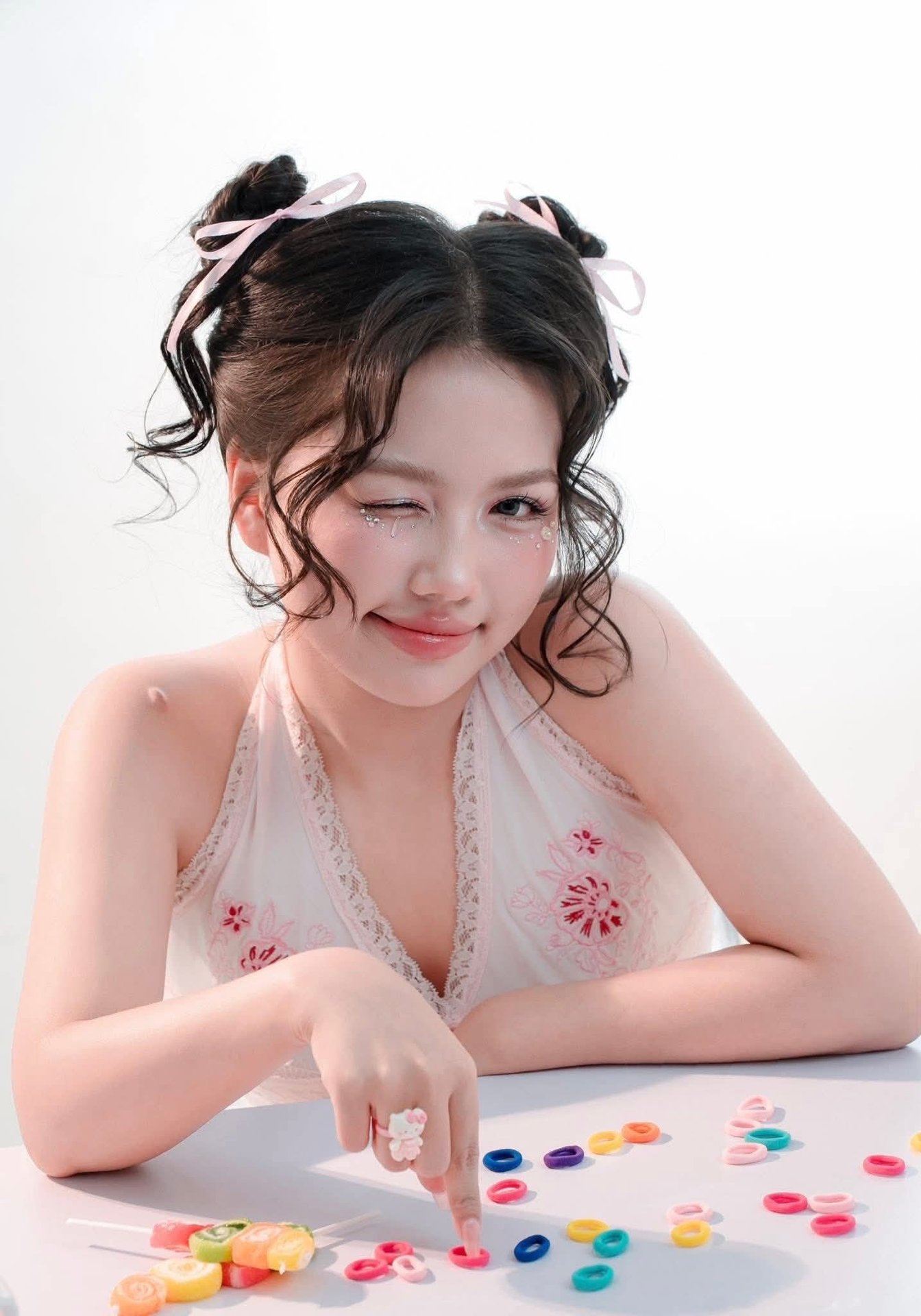 This enchanting image features a beautiful young girl with a radiant smile and a playful wink. Her charming hairstyle includes two adorable buns adorned with pink ribbons, complementing her delicate halter top. Scattered before her are vibrant, colorful candies, creating a delightful and sweet tableau. The girl's innocent beauty and cheerful spirit exude a positive energy, making the viewer feel warm and happy. This photograph perfectly blends the graceful charm of youth with the irresistible sweetness of candy, capturing a moment of pure joy.