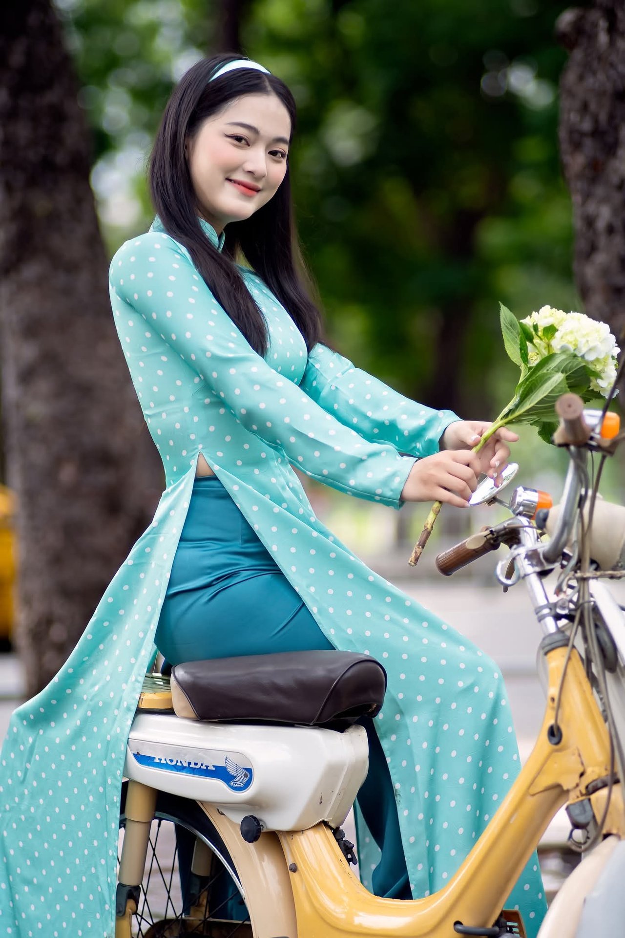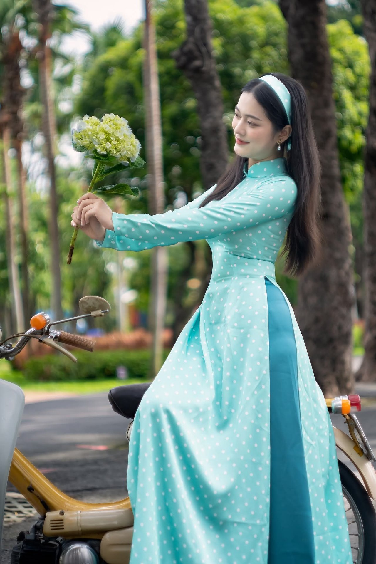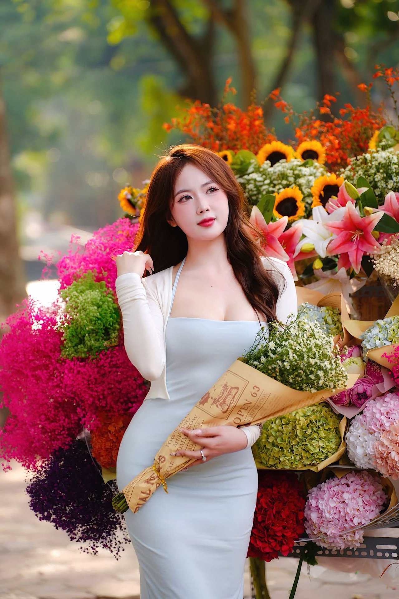 Cô gái Việt Nam dịu dàng trong mùa hoa, một con đường đầy màu sắc