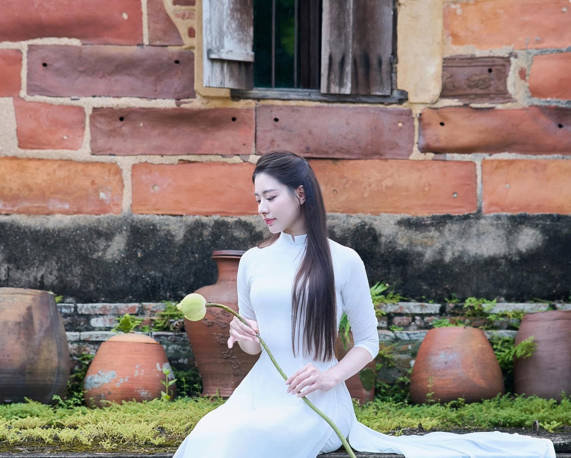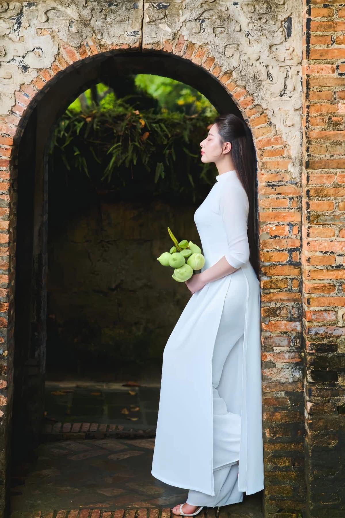 This captivating image features a graceful Vietnamese woman elegantly dressed in a pristine white Ao Dai, a timeless symbol of traditional beauty and sophistication. She stands on an ancient stone pathway beside a weathered wall, creating a picturesque setting rich in Vietnamese history and culture. Holding a delicate yellow flower, she exudes a gentle charm, perfectly embodying the refined essence of Vietnamese women. More than just a portrait of a person, this photograph celebrates the Ao Dai, a traditional garment that has become a cultural heritage. Its harmonious blend of classic and modern aesthetics, deeply rooted in Vietnamese identity, makes it truly enchanting.
