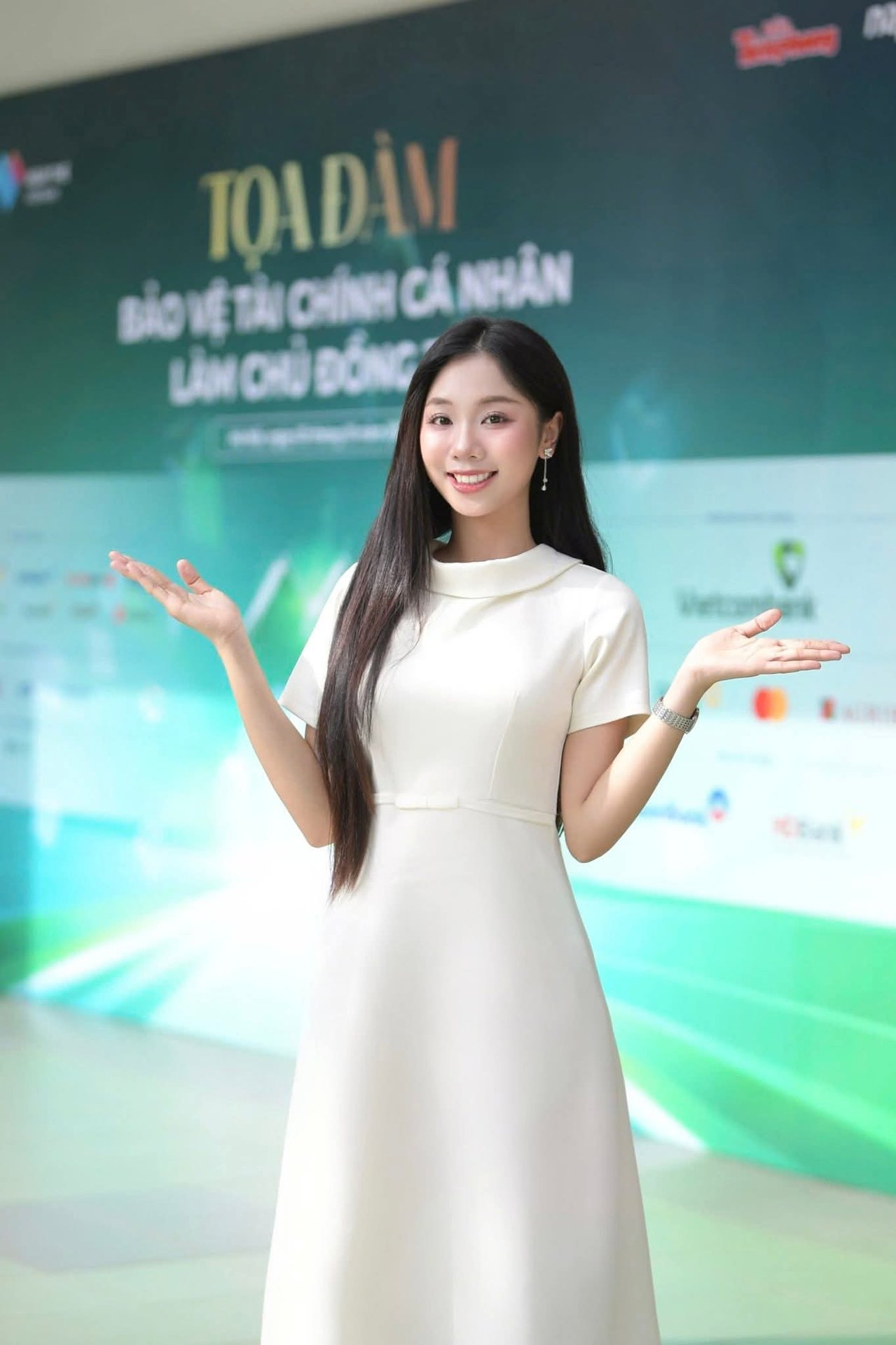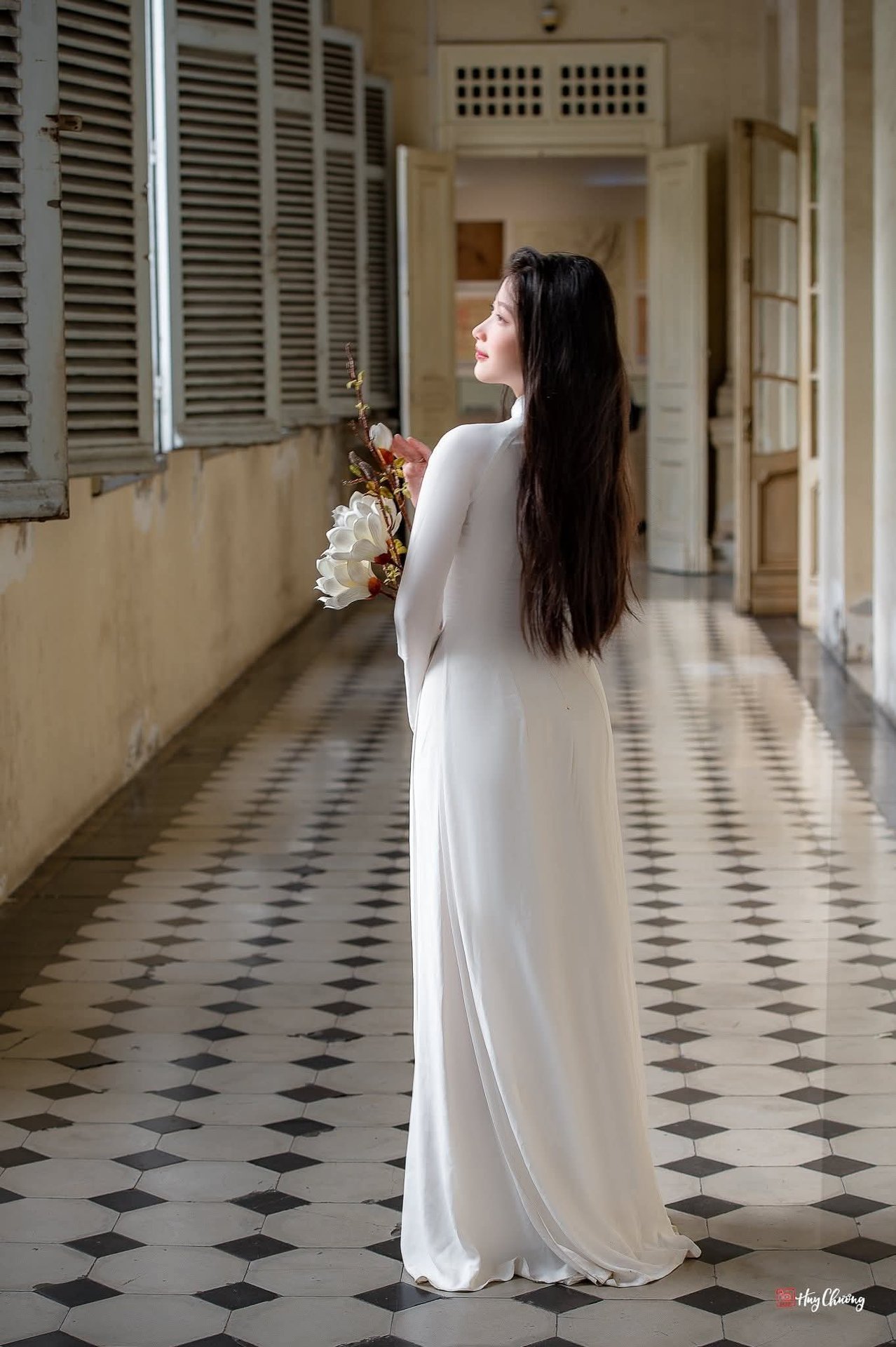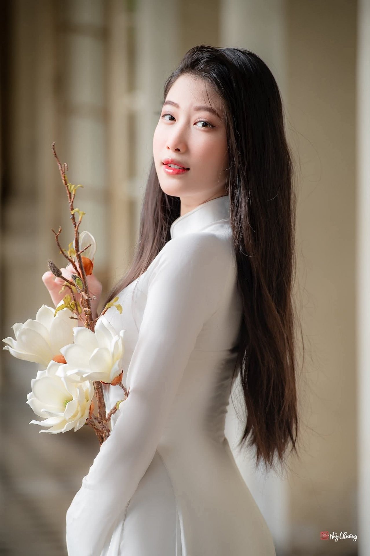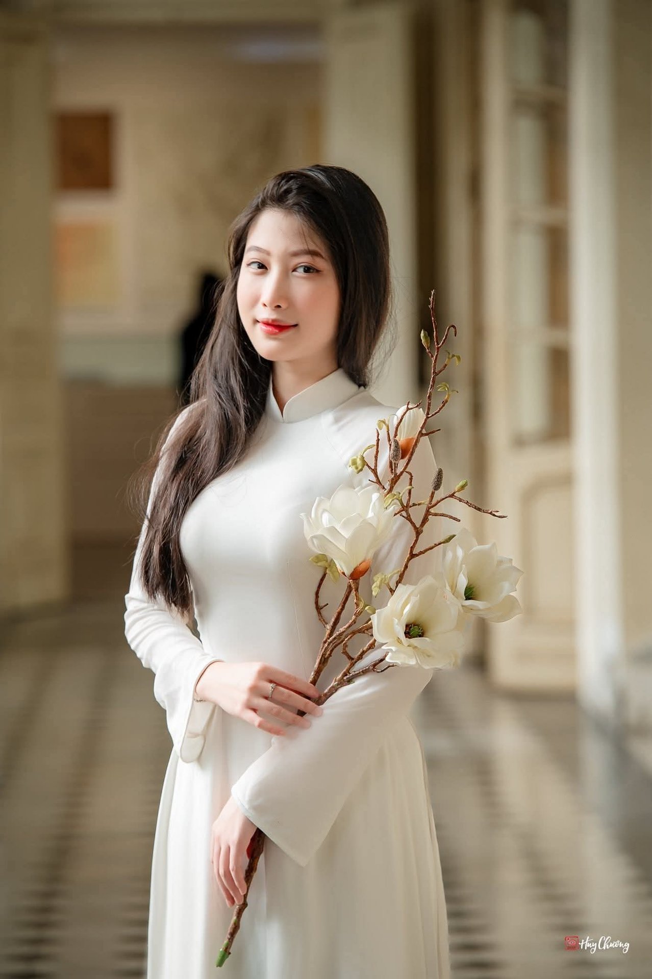 This captivating portrait features a beautiful Vietnamese woman exuding grace and charm. She is elegantly dressed in a cream-white midi dress, perfectly accentuating her slender figure. Her long, dark, flowing hair and gentle smile, combined with a radiant gaze, create a harmonious and alluring presence. Captured in a bright corridor, the image conveys a sense of serene beauty and refined style. This high-quality full-body portrait is ideal for those seeking stunning visuals. Perfect as an HD wallpaper, showcasing the natural allure of Vietnamese beauty. The photograph highlights her captivating charm and elegant demeanor, making it a wonderful representation of Asian beauty and graceful fashion. Image ID: 1000017598.jpg.