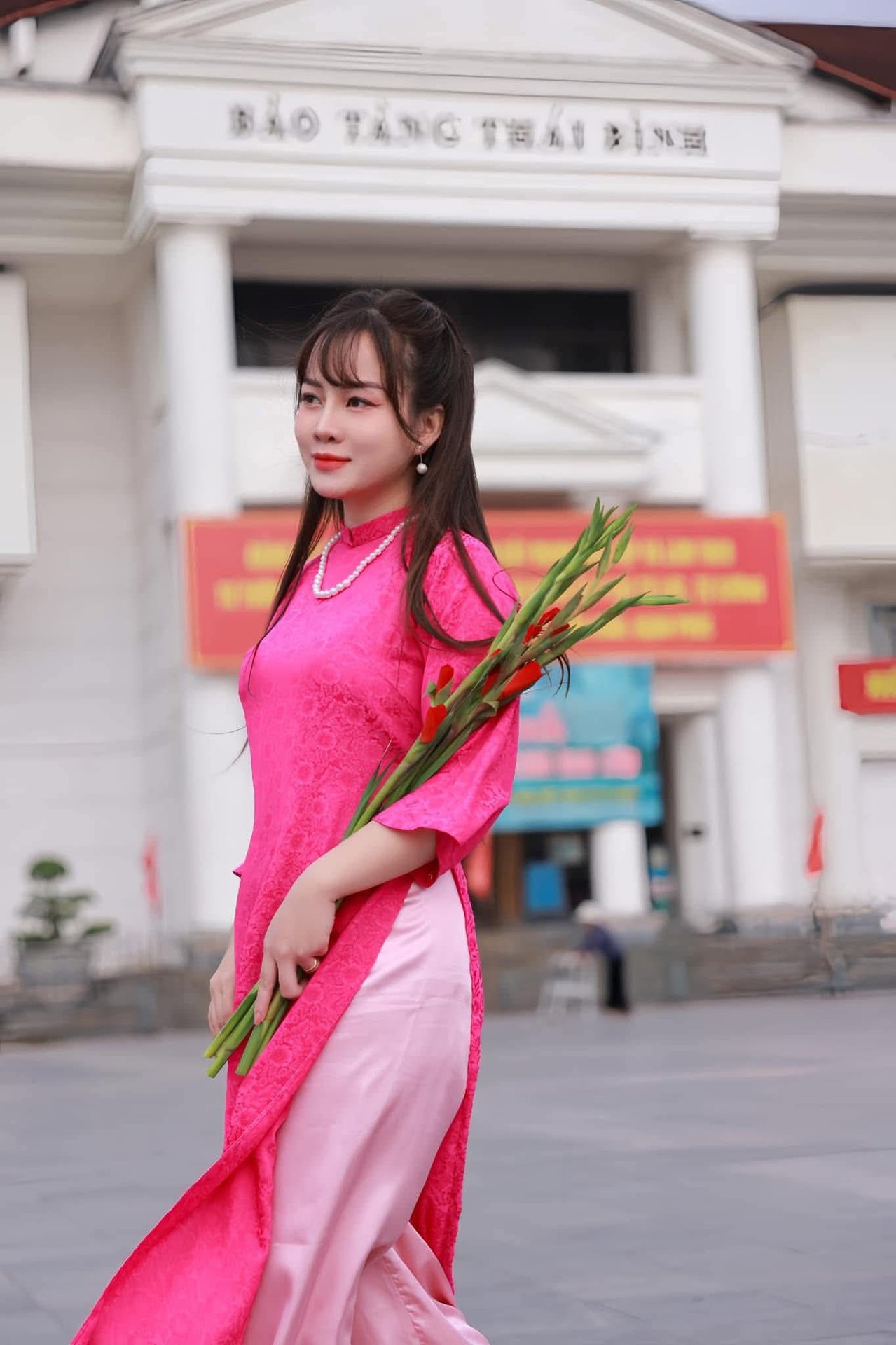 This captivating portrait features a beautiful Vietnamese woman elegantly dressed in a vibrant fuchsia pink ao dai, showcasing the traditional charm and grace of Vietnamese culture. The intricate patterns on her ao dai highlight her slender figure and sophisticated style. She adorns a delicate pearl necklace and earrings, holding a striking bouquet of red gladiolus flowers that perfectly complement her stunning outfit. With a gentle smile and engaging eyes, she poses confidently, embodying the serene beauty and thanh thoát (grace) of Vietnamese women. This image beautifully captures a moment of traditional elegance, highlighting the timeless appeal of the ao dai as a profound cultural symbol of Vietnam.