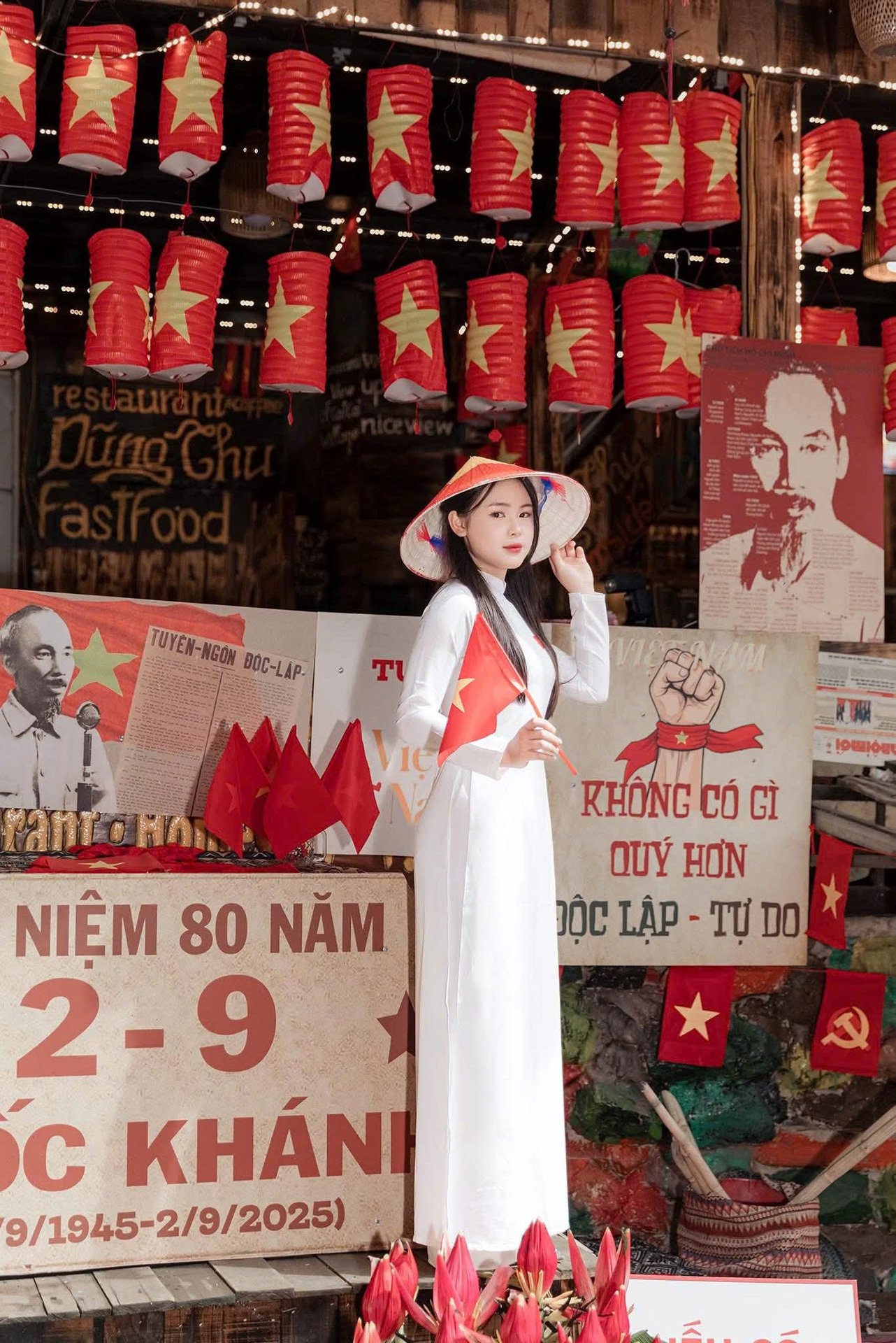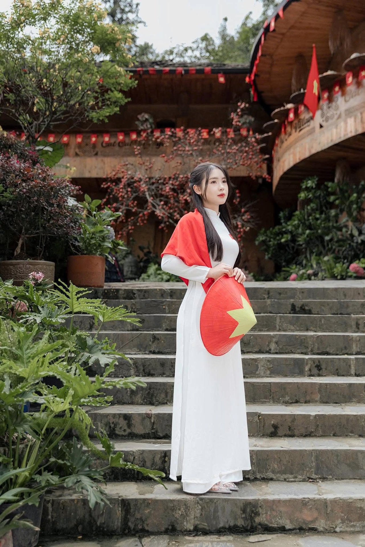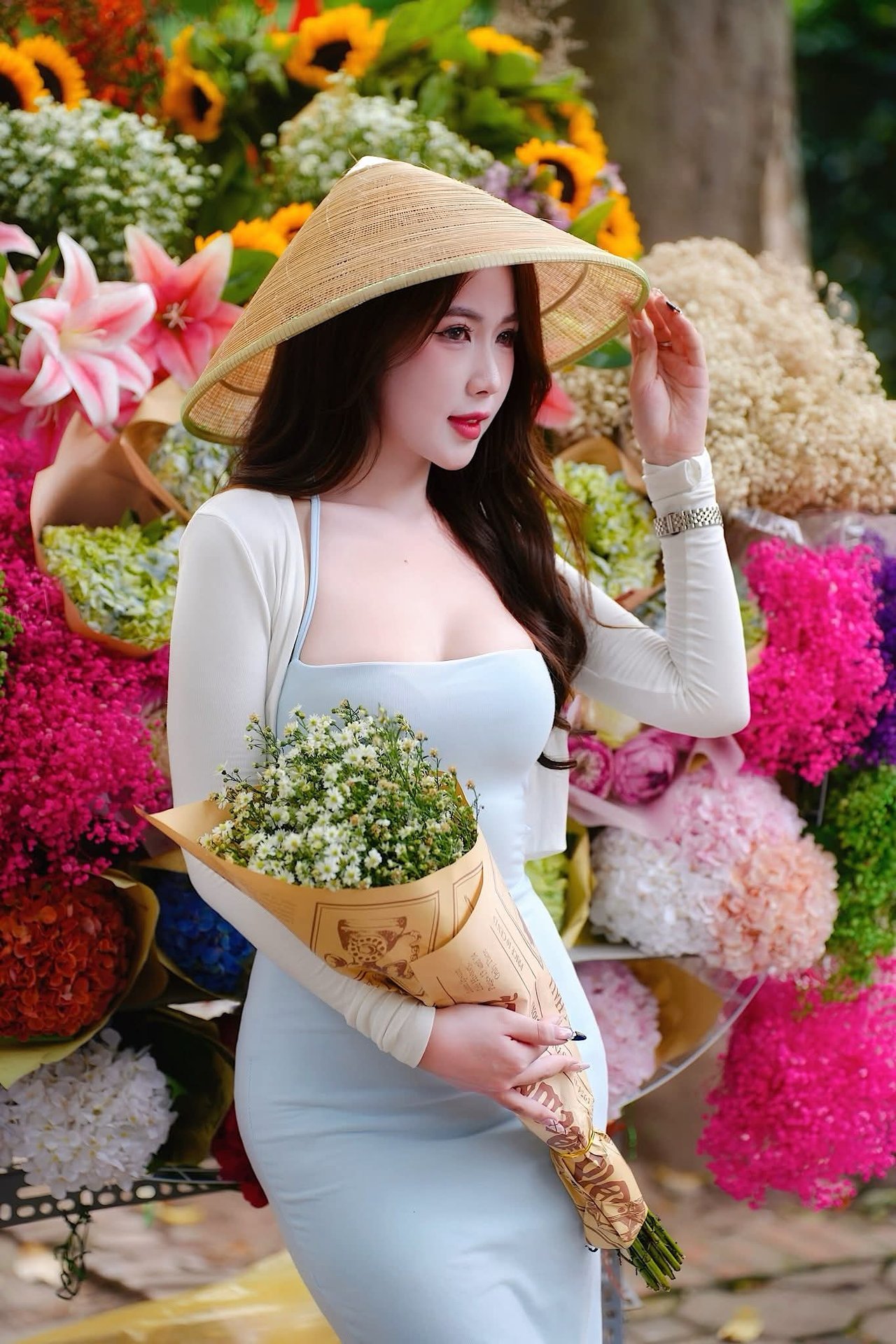 This captivating image showcases the ethereal beauty of a young Vietnamese woman gracefully adorned in a pristine white Ao Dai, complemented by a traditional conical hat (nón lá). Her long, dark hair and gentle expression highlight a serene Asian aesthetic. Holding a bouquet of delicate white lilies, she embodies purity and elegance. The Ao Dai, a quintessential symbol of Vietnamese culture, accentuates her slender figure and timeless charm. This portrait not only captures her striking physical appearance but also evokes the spirit and cultural heritage of Vietnam. It's a profound representation of traditional Vietnamese beauty, offering a glimpse into the nation's rich identity and the enduring grace of its women.