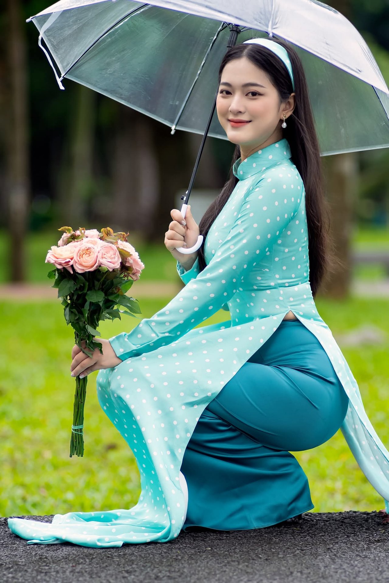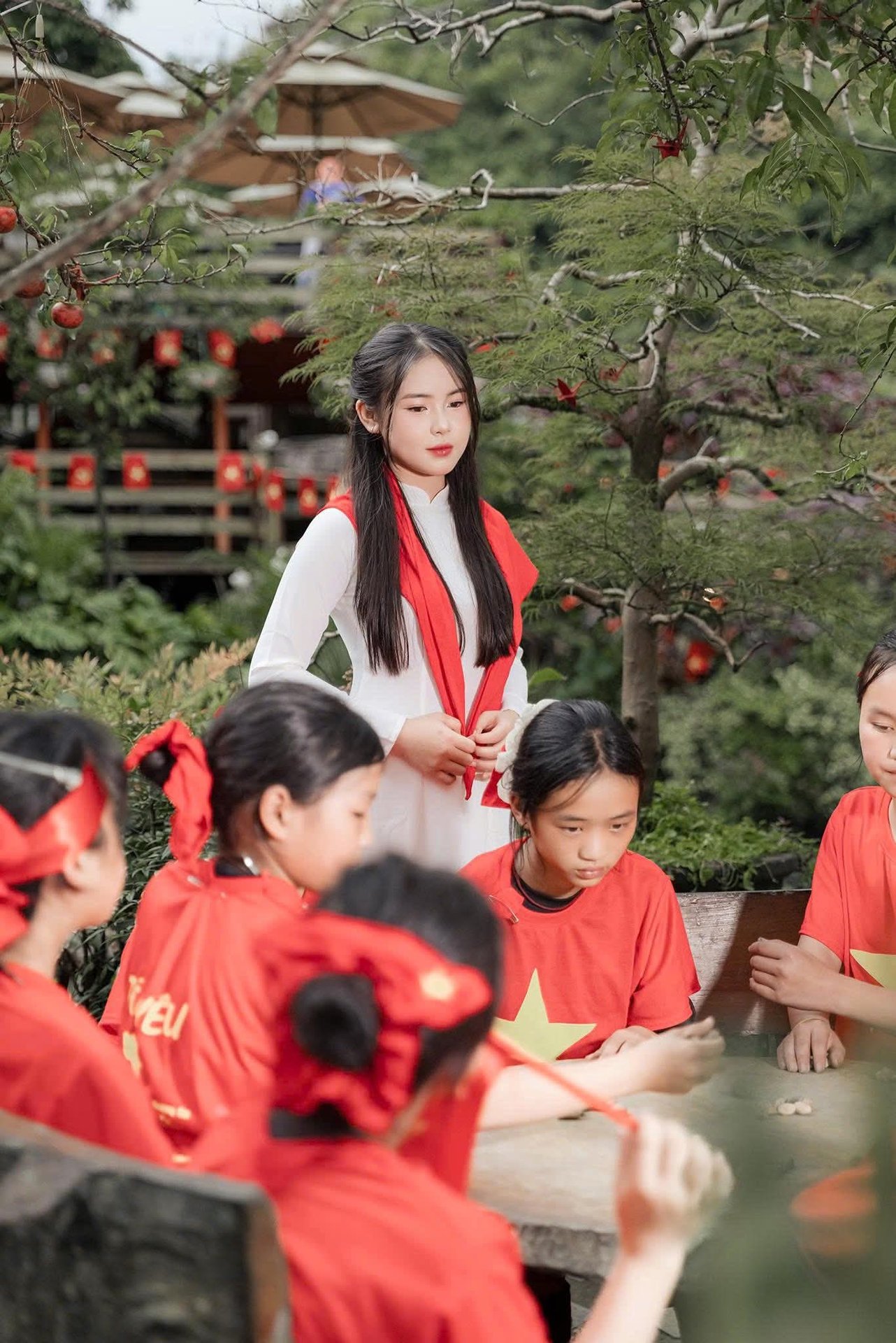 This image captures the innocent moment of a female student in a familiar school uniform: a white shirt, red vest, and blue skirt. With a radiant smile and pure eyes, the girl exudes youthful and vibrant beauty. The background features a serene tree-lined path, creating a peaceful and poetic setting that enhances the image of school age. This photograph symbolizes innocence, natural beauty, and cherished memories of student life. It is an ideal visual for projects related to education, youth, and the purity of adolescence, perfectly embodying the spirit of a bright student.