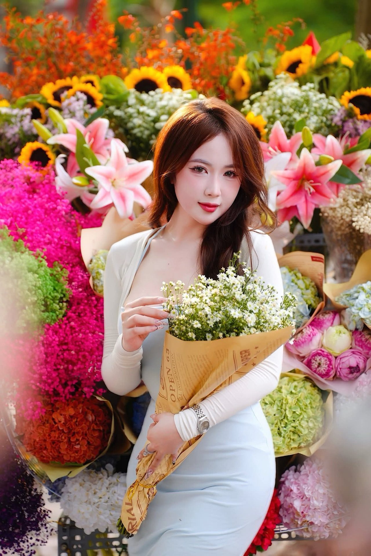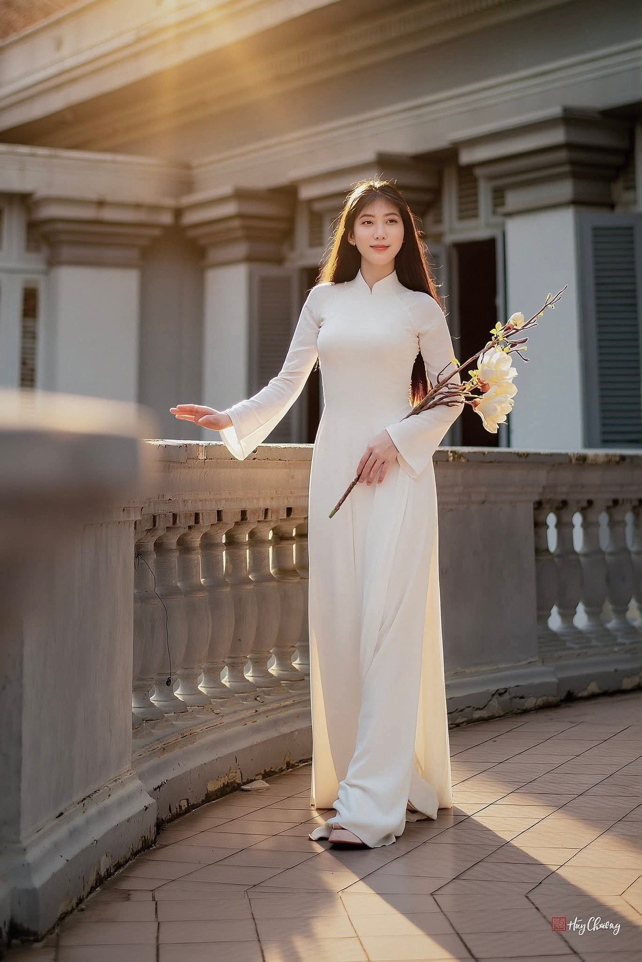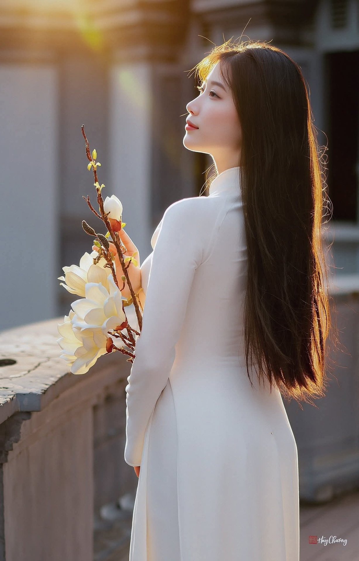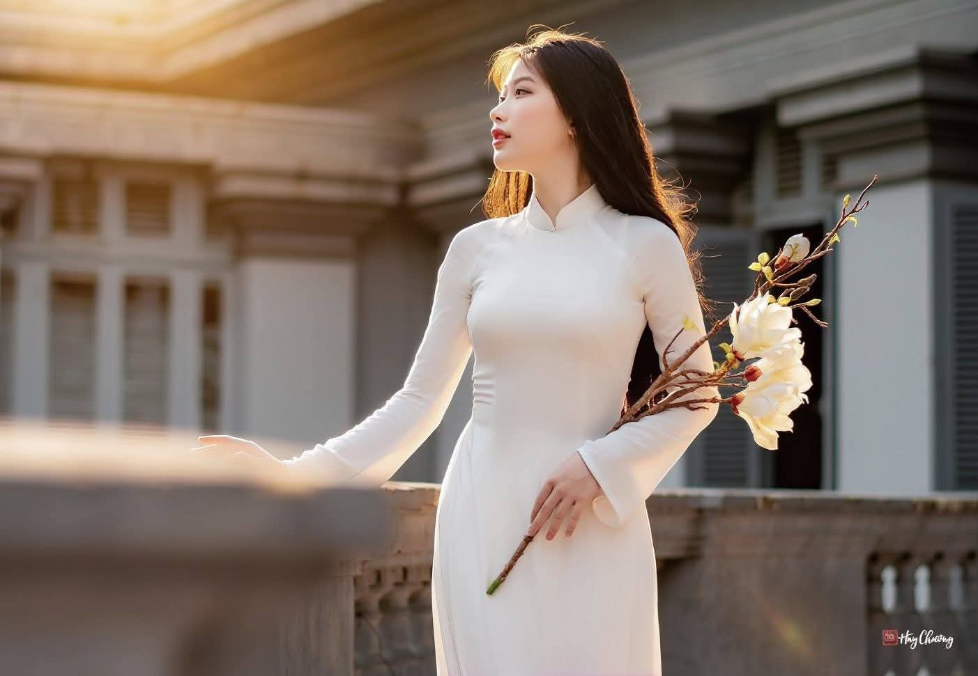 Youthful Vietnamese Girl in Pure White Silk Ao Dai with Yellow Lilies