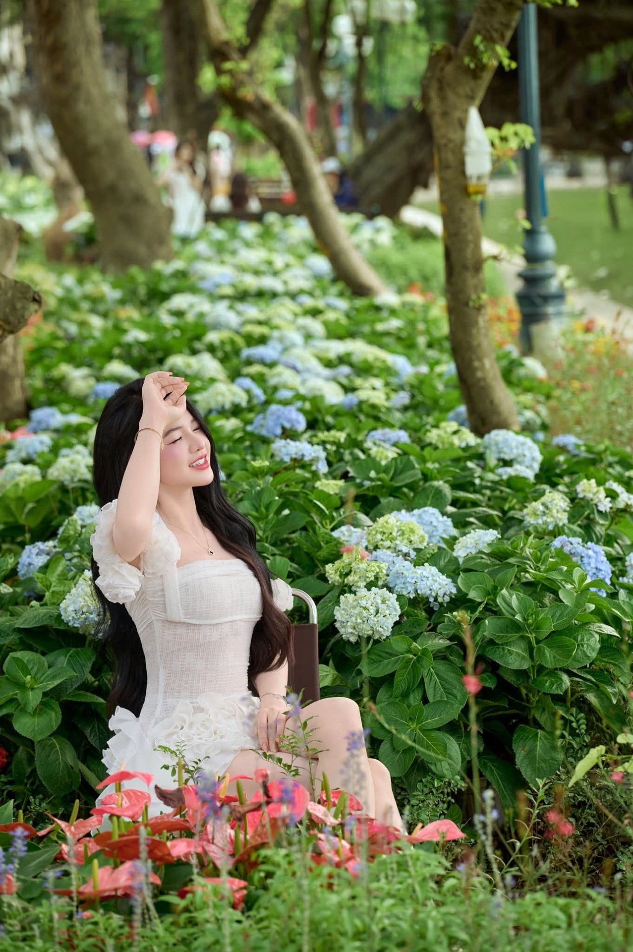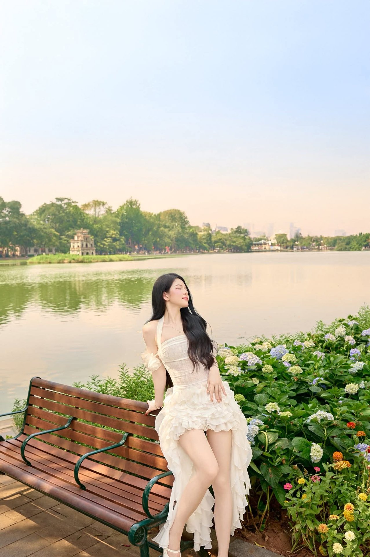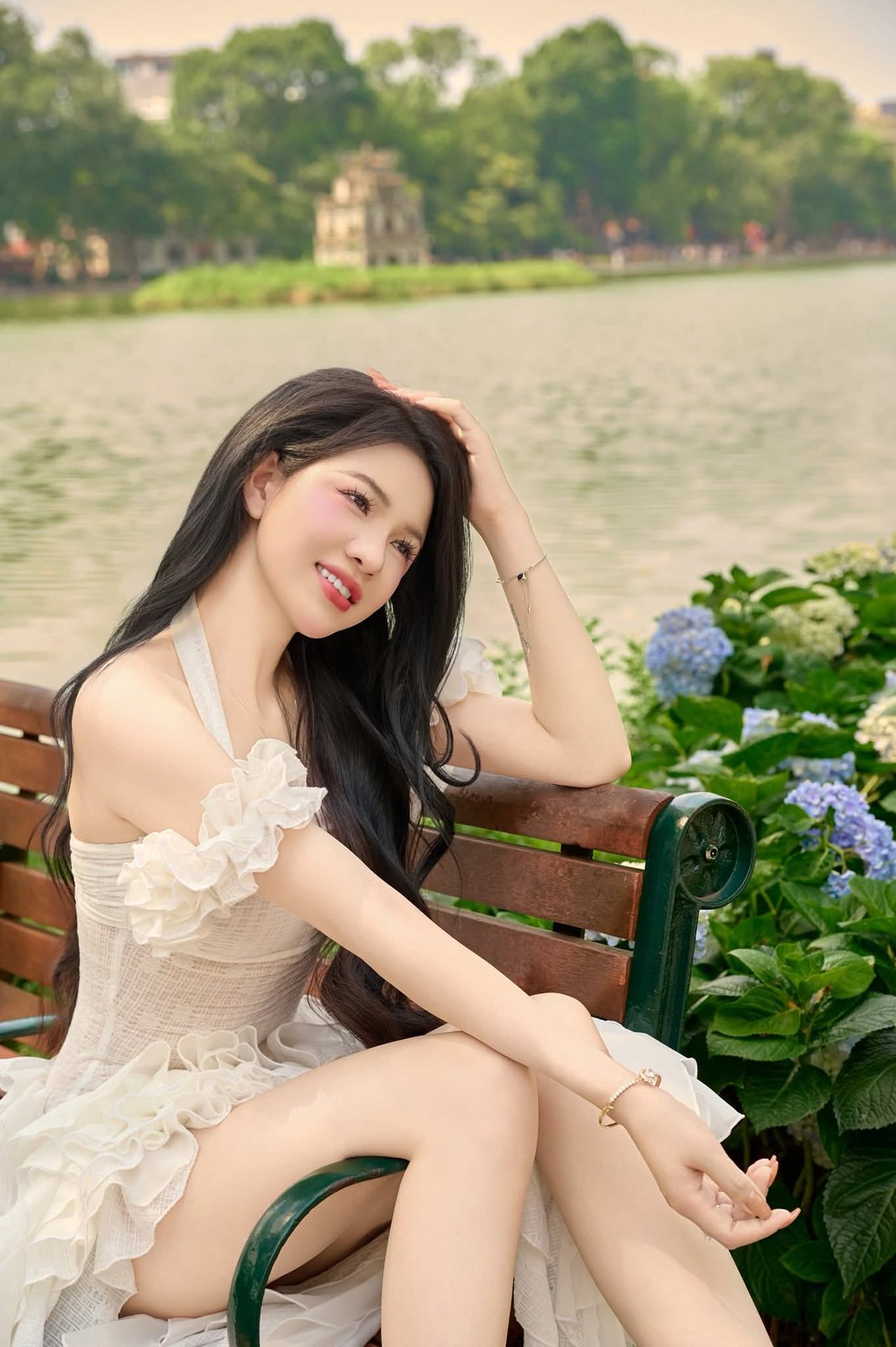 This image, 1000017466.jpg, captures a beautiful moment of a vibrant, youthful girl smiling brightly while seated on a bench by Hoan Kiem Lake in Hanoi, Vietnam. Her fresh smile and elegant beauty perfectly complement the picturesque landscape of blooming hydrangeas. In the background, the serene waters of Hoan Kiem Lake, a true symbol of Vietnam's capital, add to the charm. This photograph beautifully showcases the youthful spirit of the Vietnamese people and the tranquil essence of Hanoi. It's an ideal representation for those exploring the natural beauty and rich cultural heritage of this ancient city.