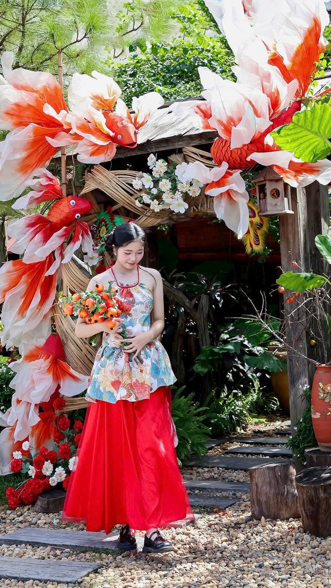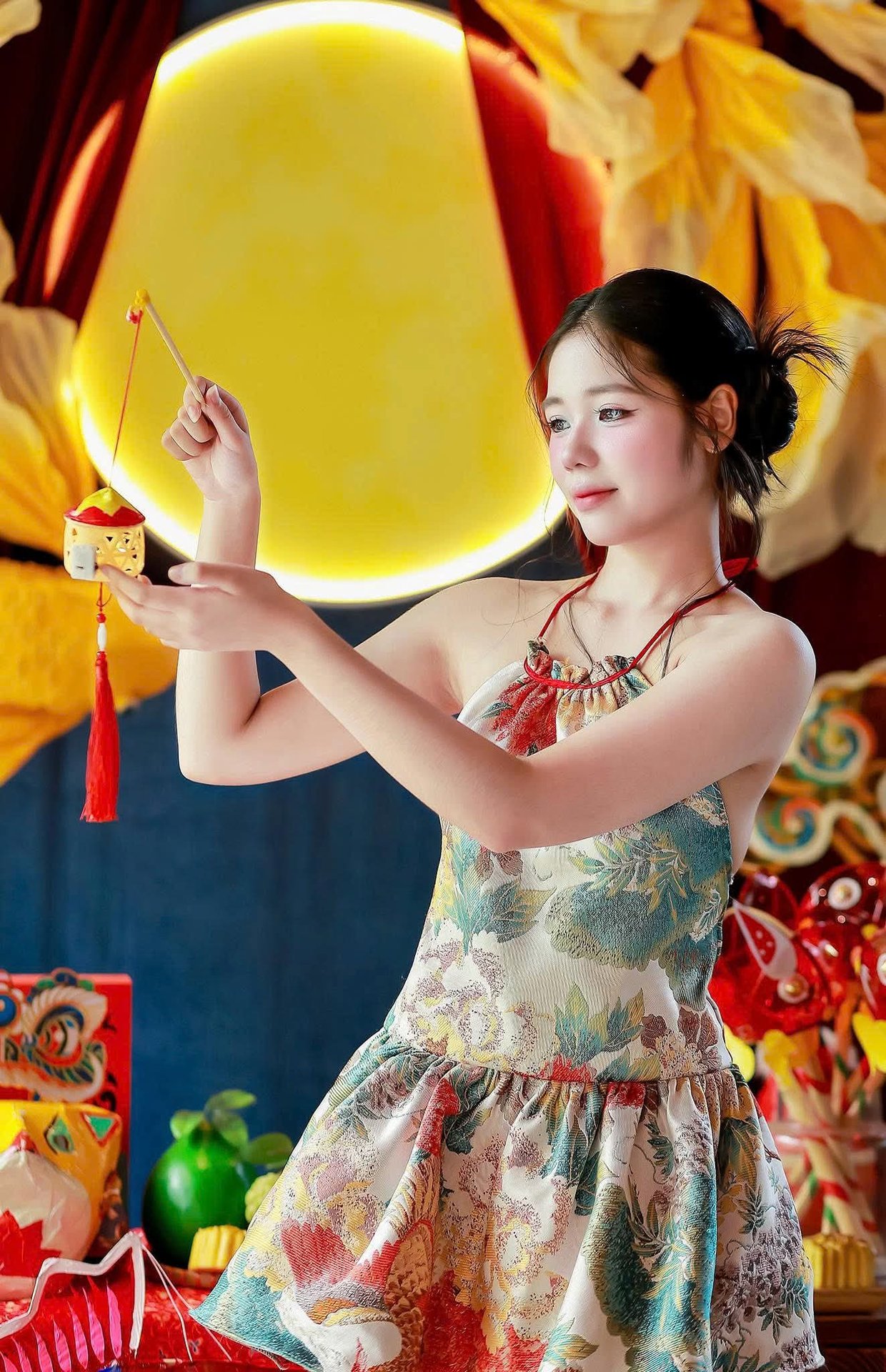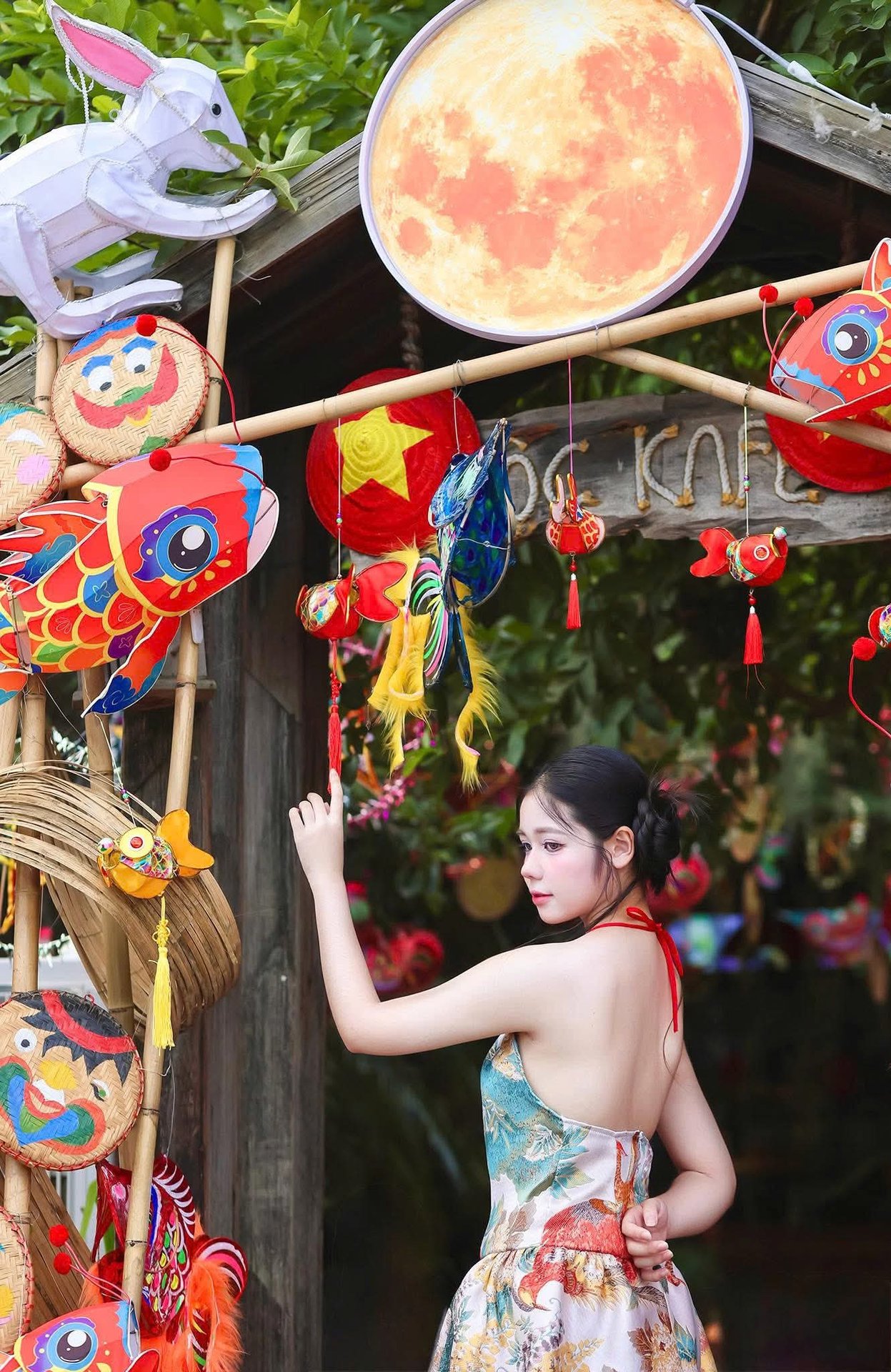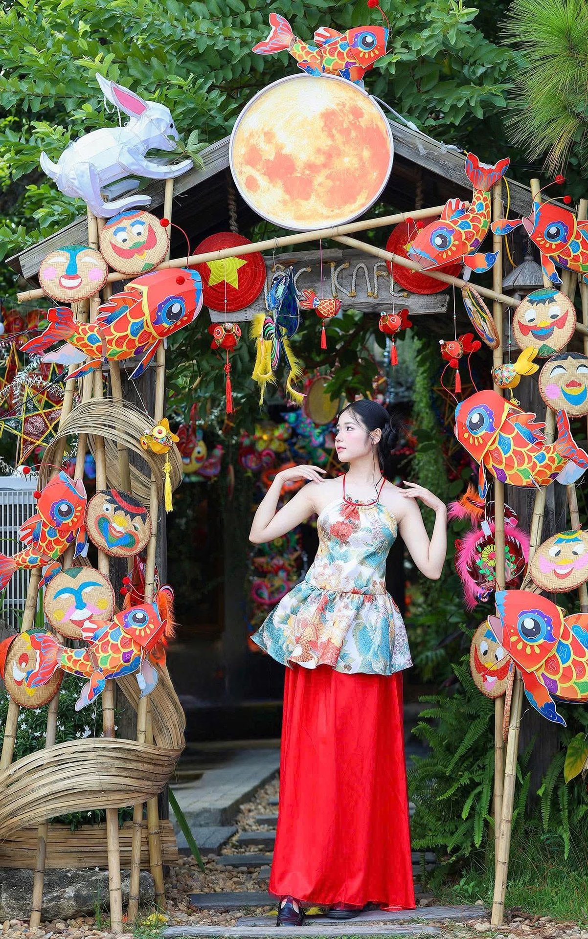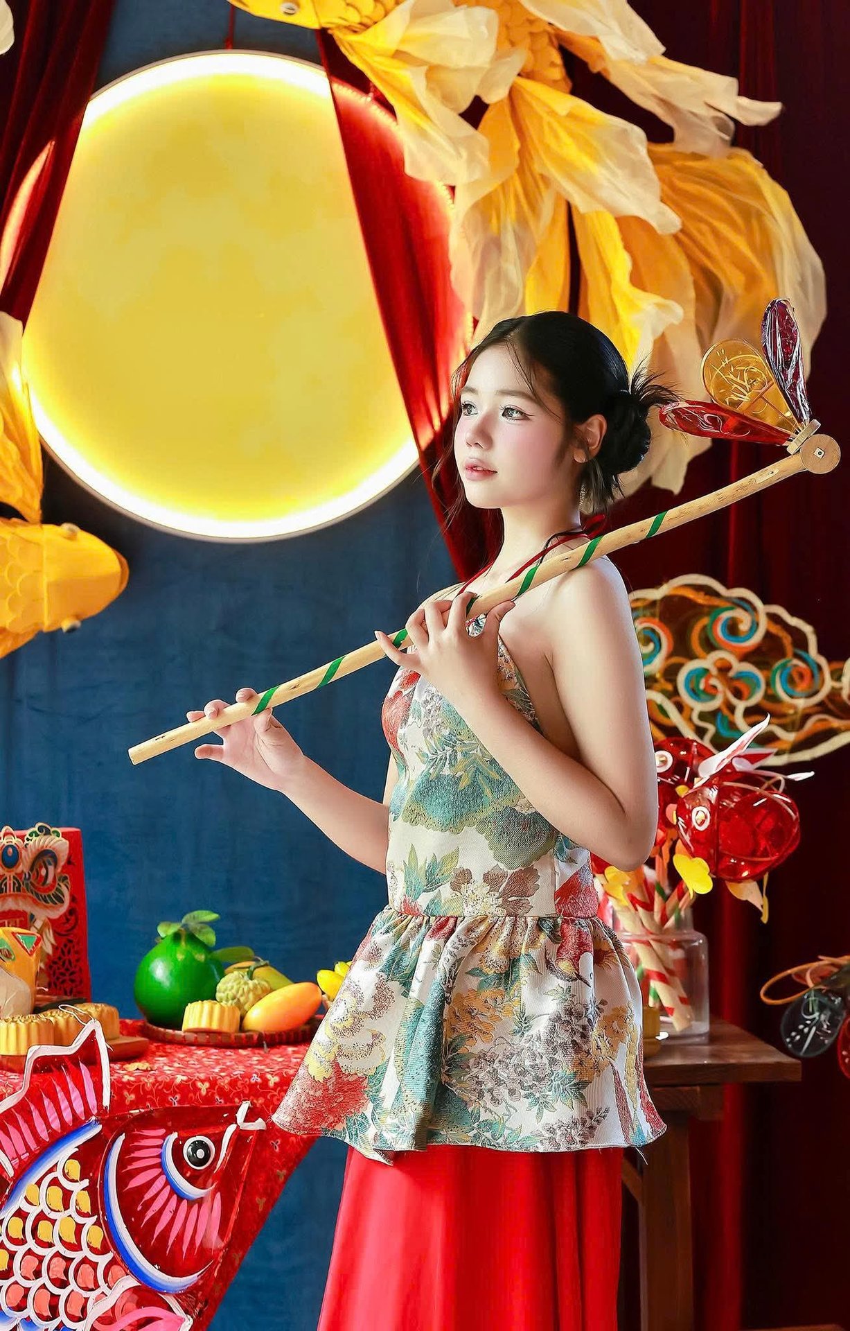 Experience the enchanting beauty of Vietnamese culture with this captivating image of a young woman gracefully celebrating the Mid-Autumn Festival. Dressed in a charming traditional-inspired outfit, she holds a vibrant carp lantern, a cherished symbol of the festivities. Photo 1000017492.jpg beautifully captures the joyful and colorful atmosphere, showcasing the enduring charm of Vietnamese traditions and cultural heritage. The backdrop, featuring a luminous moon and golden flowers, enhances the magical ambiance of the full moon festival, reflecting the harmonious blend of human elegance and rich national customs.