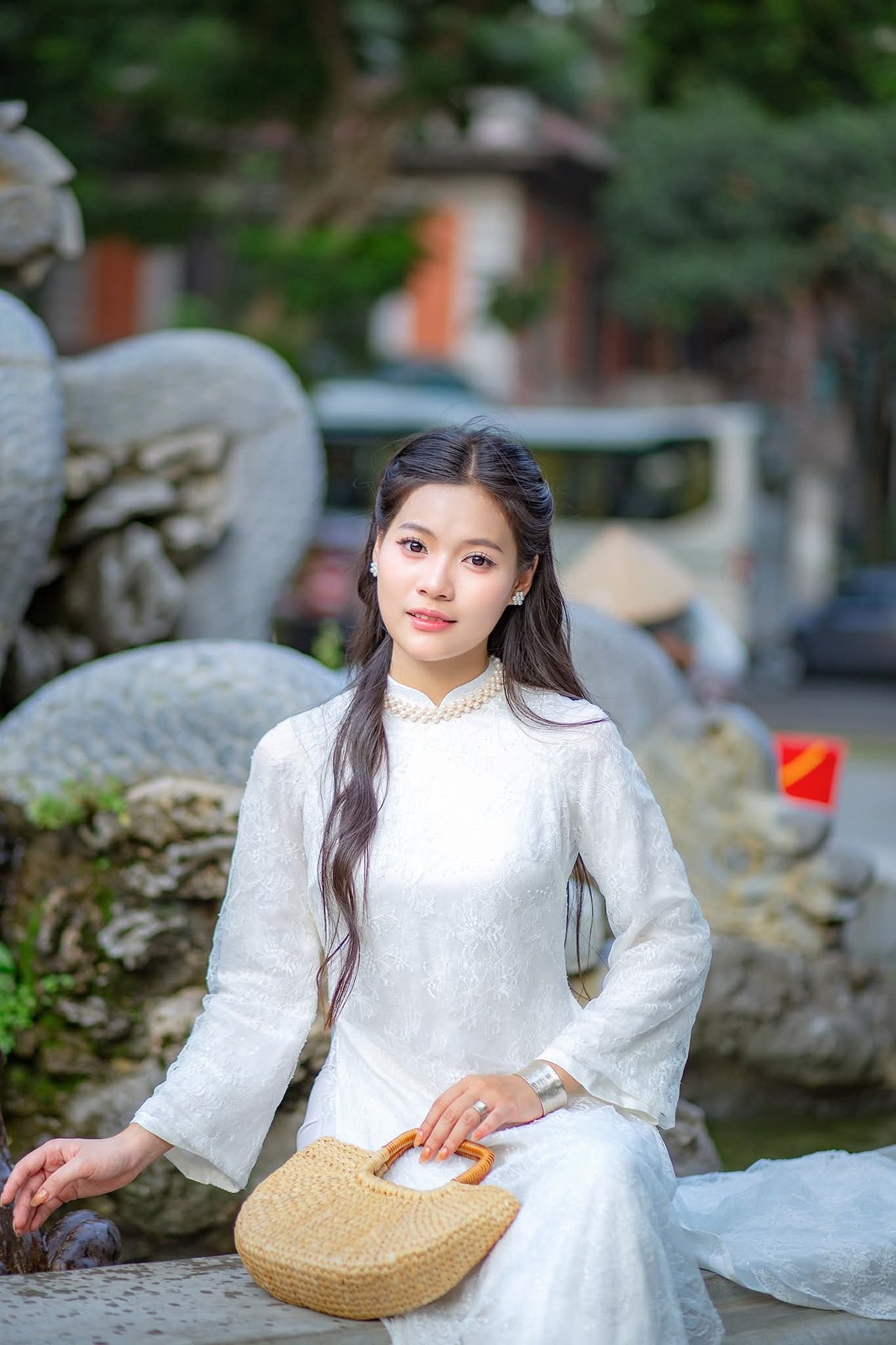 This captivating image features a young Vietnamese woman gracefully adorned in a pristine white Ao Dai. The traditional Ao Dai, with its exquisite design and flowing fabric, elegantly accentuates the gentle and ethereal beauty of Vietnamese women. With her long, wavy hair, delicate features, and a subtle smile, she embodies charm and profound cultural aesthetics. The rustic woven straw bag she holds adds to her natural, approachable appeal. This photograph beautifully represents the timeless traditional beauty and elegance of Vietnamese women, a cherished cultural icon. The harmonious natural backdrop further enhances the subject's captivating presence.