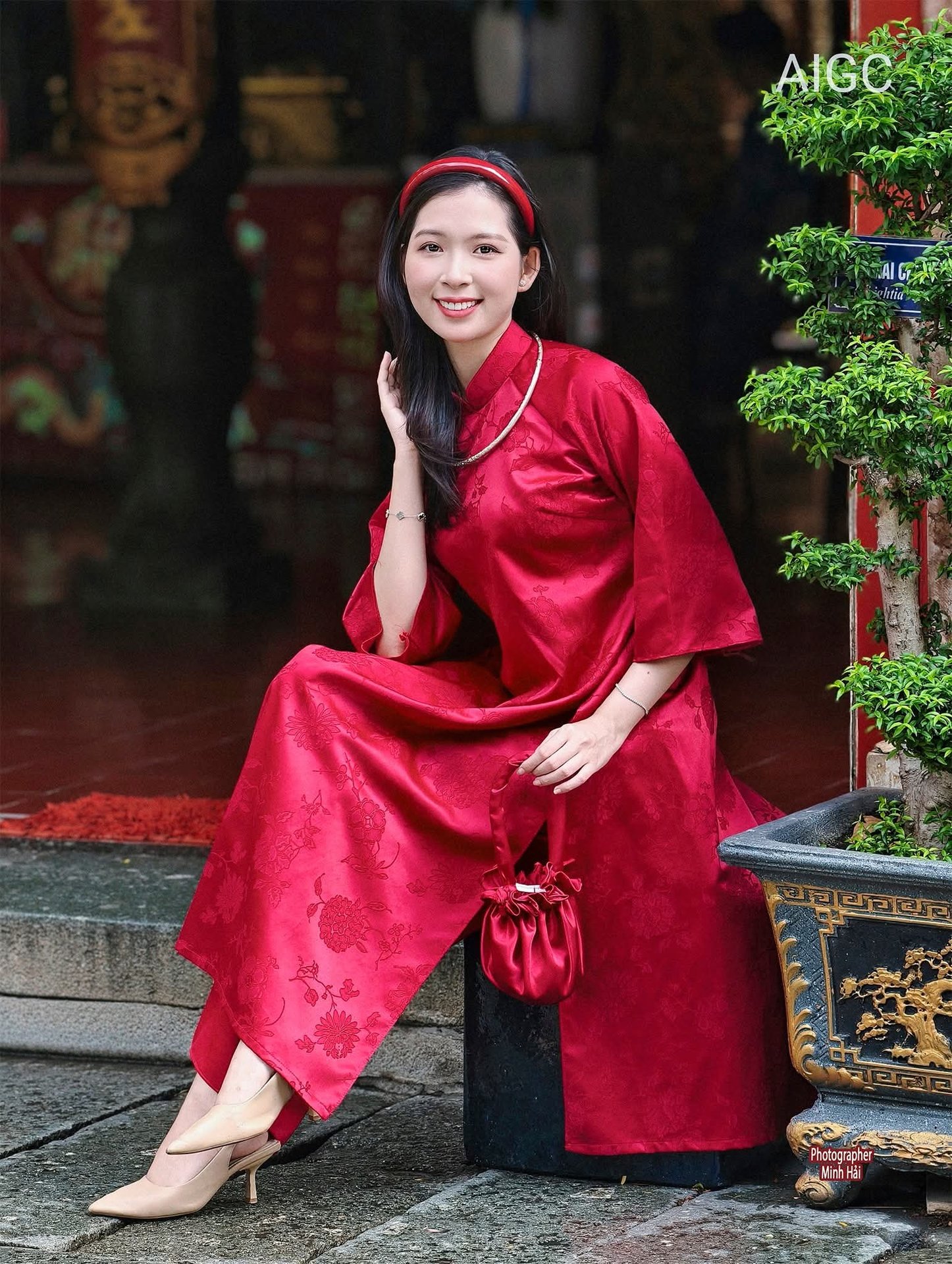 This stunning photograph beautifully captures the gentle and graceful beauty of a Vietnamese woman. She elegantly dons a red traditional Ao Dai, with its exquisite design symbolizing the unique cultural essence of the country. Her radiant smile and serene eyes not only brighten the frame but also convey her elegance and sophistication. The background, reminiscent of traditional Vietnamese architecture, further enhances the cultural significance. This image represents the captivating beauty of Vietnamese people, a harmonious blend of tradition and modern poise, a true emblem of grace and refinement.