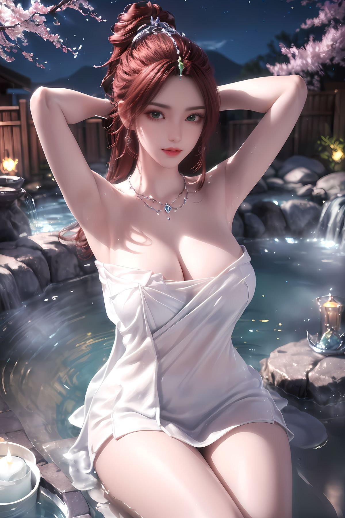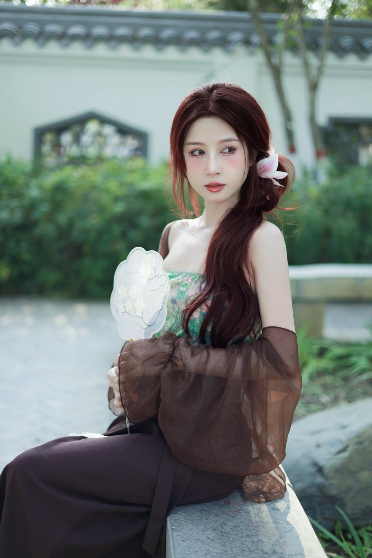 This captivating portrait features a young woman exuding elegant and enchanting beauty. She is gracefully seated in a setting rich with East Asian tradition where ancient architecture and refreshing greenery form a serene backdrop. Her attire presents a delicate fusion of modern flair and traditional charm highlighted by a floral patterned strapless top and a light flowing sheer outer layer. The translucent white fan she holds is not merely an accessory but a symbol of classic grace. Her long reddish-brown hair adorned with a subtle pink embellishment adds to her sophisticated allure. The entire image radiates a unique aesthetic beautifully intertwining human elegance with timeless traditional values evoking a sense of calm and enduring beauty.