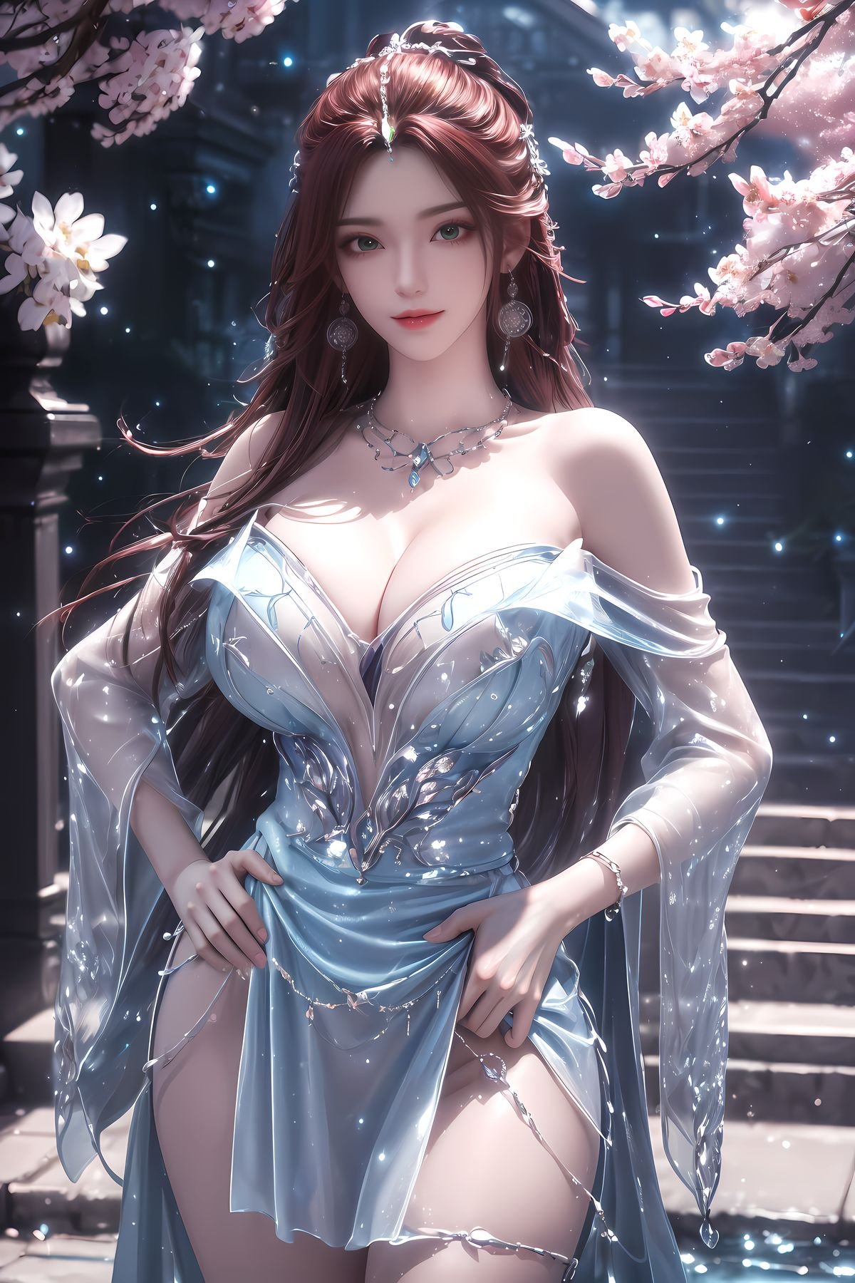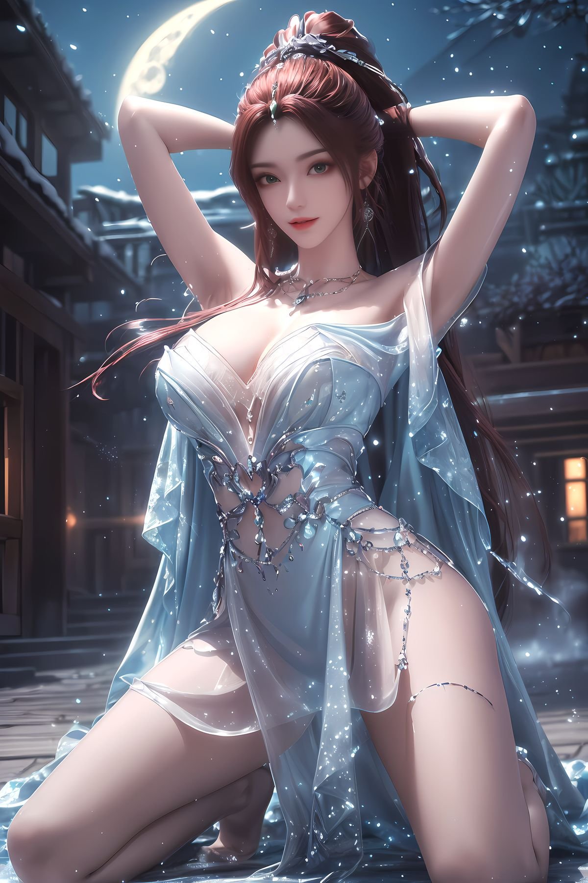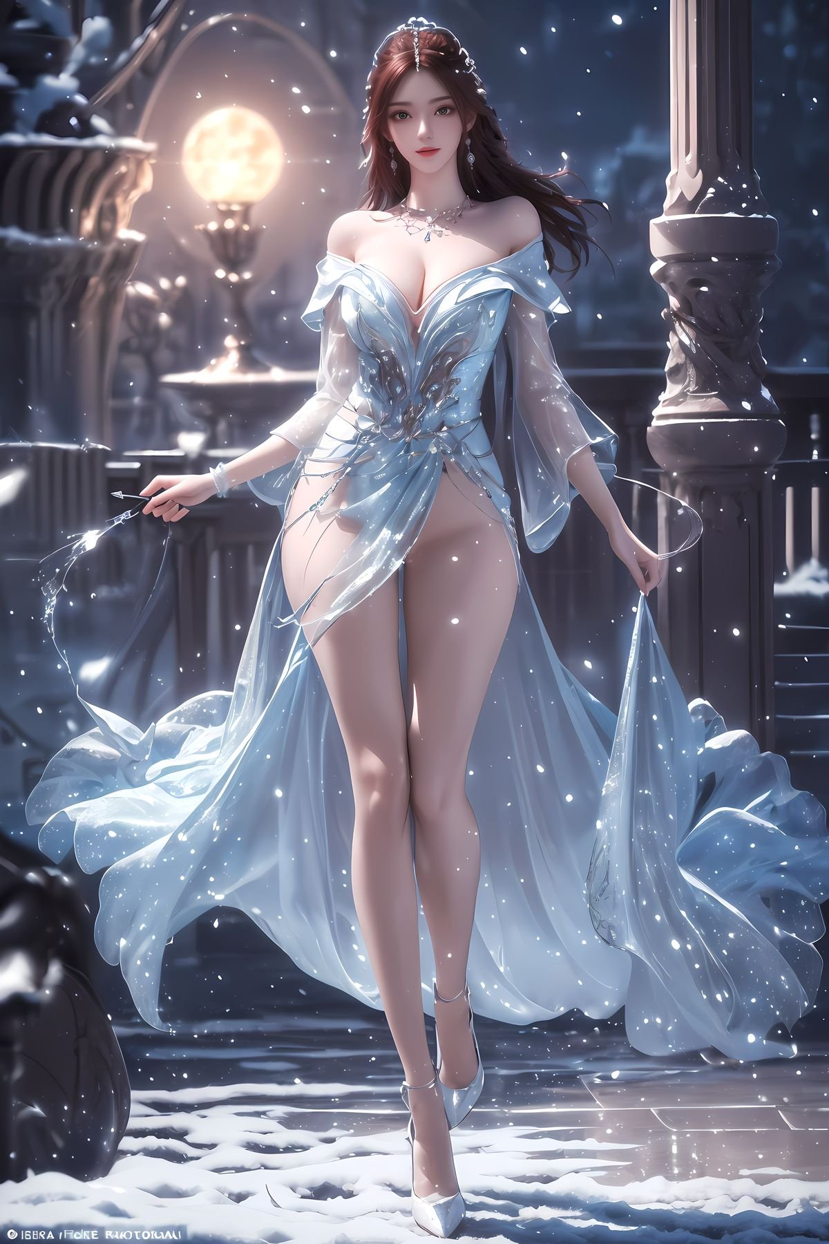 This stunning image showcases the fairy Ye Qingxian from the AI Generated Kuzan collection embodying a surreal beauty within the Perfect World With flowing reddish-brown hair and captivating eyes she is adorned in a magnificent light blue gown exquisitely embellished with sparkling frost-like details The majestic natural backdrop of snow-capped mountains and a full moon creates an ethereal atmosphere where Ye Qingxian emerges as an alluring ice goddess Every detail from her attire to the enchanting scenery is meticulously crafted evoking grace and power This is a masterful digital artwork offering a profound glimpse into the character of Ye Qingxian and her magical world