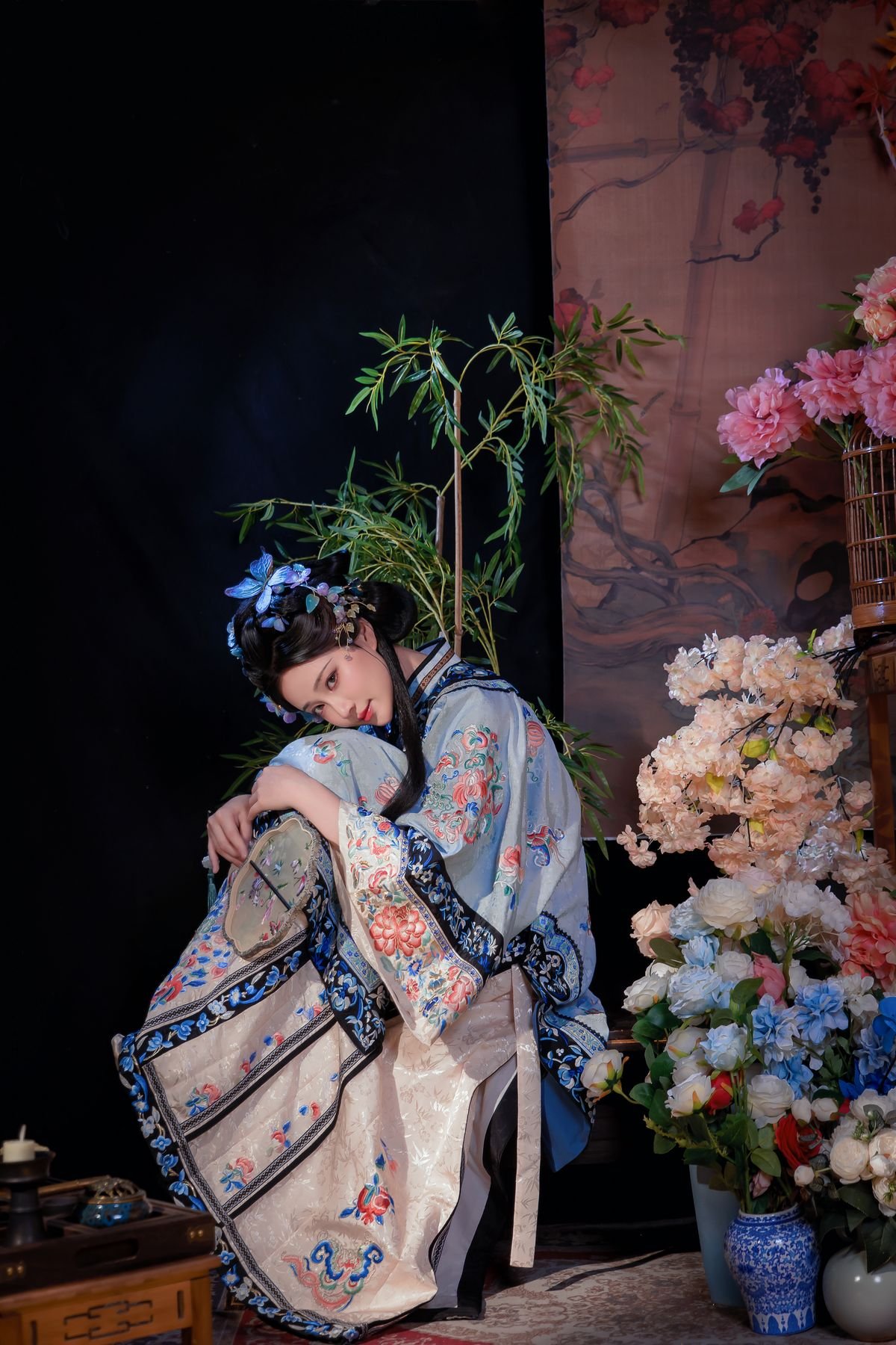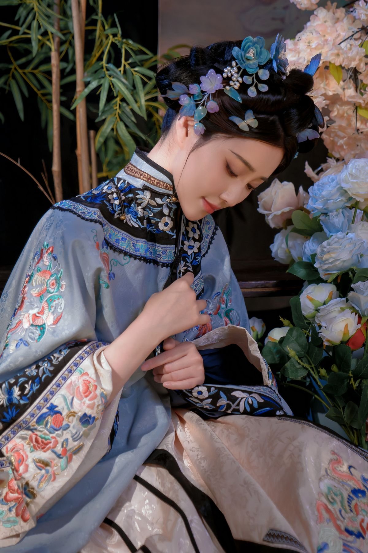 In this captivating image coser Nian Nian embodies the character 丝兰陵 exuding classic and serene beauty. She is adorned in an exquisite traditional Chinese costume featuring a dominant blue palette intricately embroidered with rich floral patterns. Her dark hair is elegantly styled in an updo embellished with delicate blue flower accessories creating a harmonious and noble aesthetic. Her deep gaze and gentle hand gesture convey grace and sophistication. The minimalist background featuring green bamboo foliage further accentuates the characters timeless and tranquil charm. This artistic cosplay showcases meticulous attention to both the elaborate attire and the captivating demeanor.