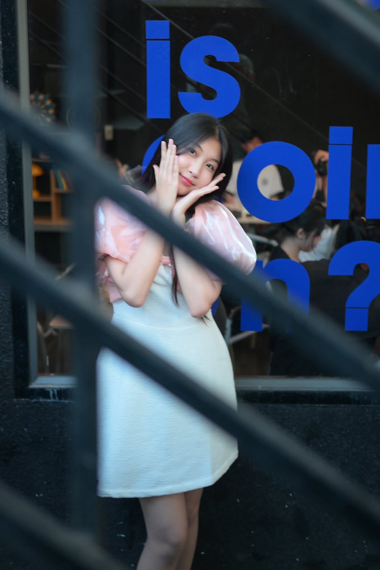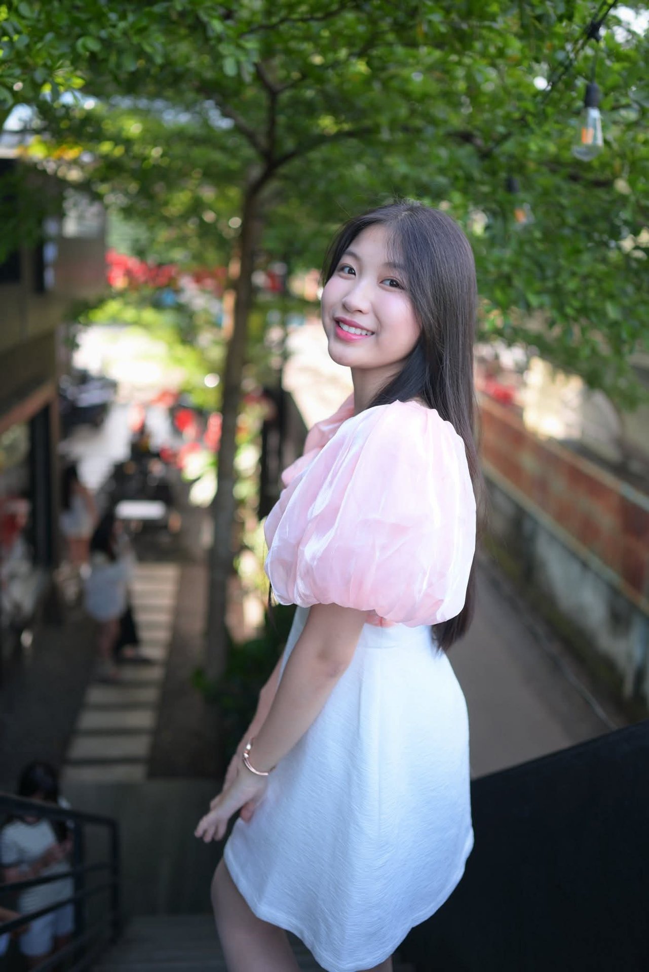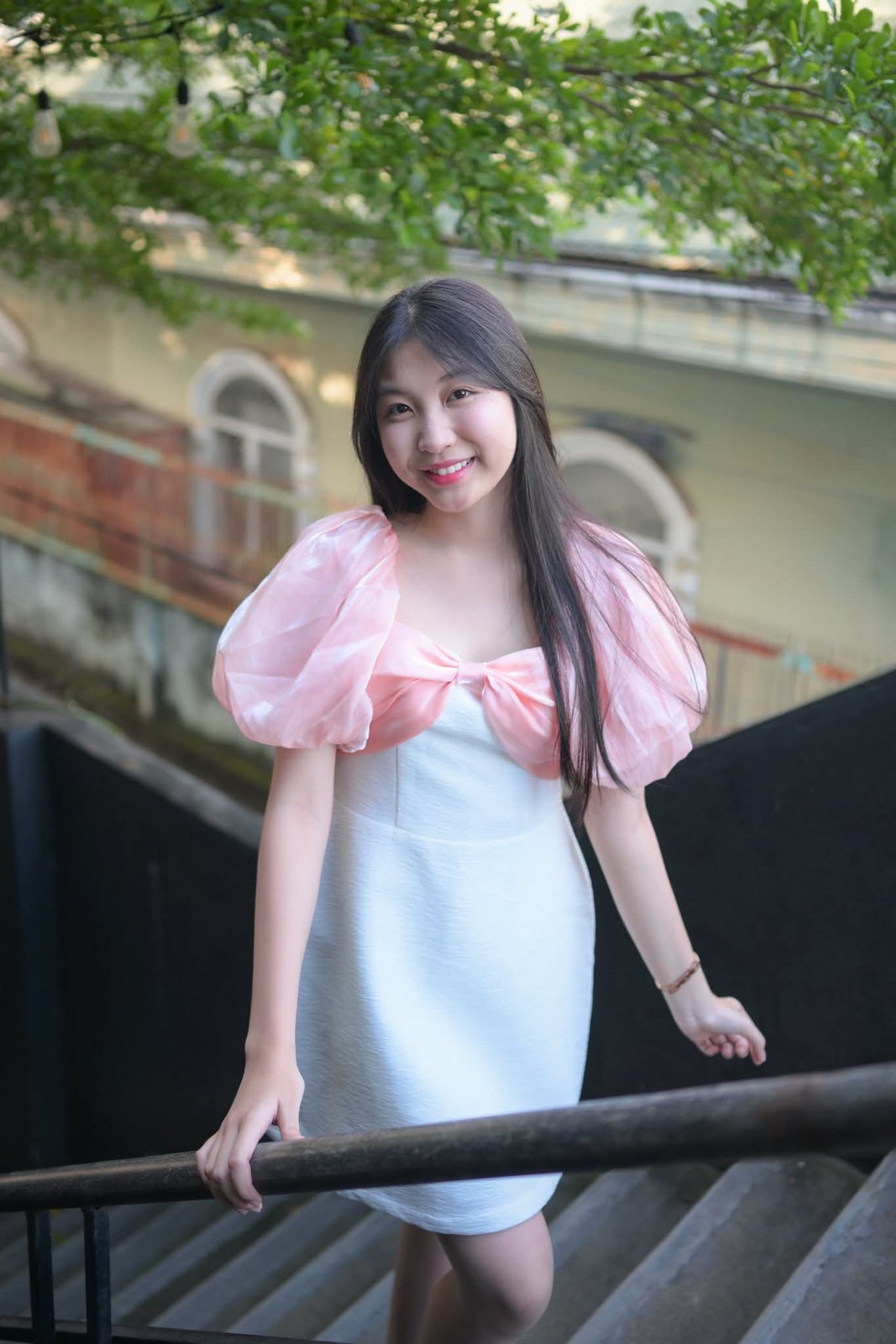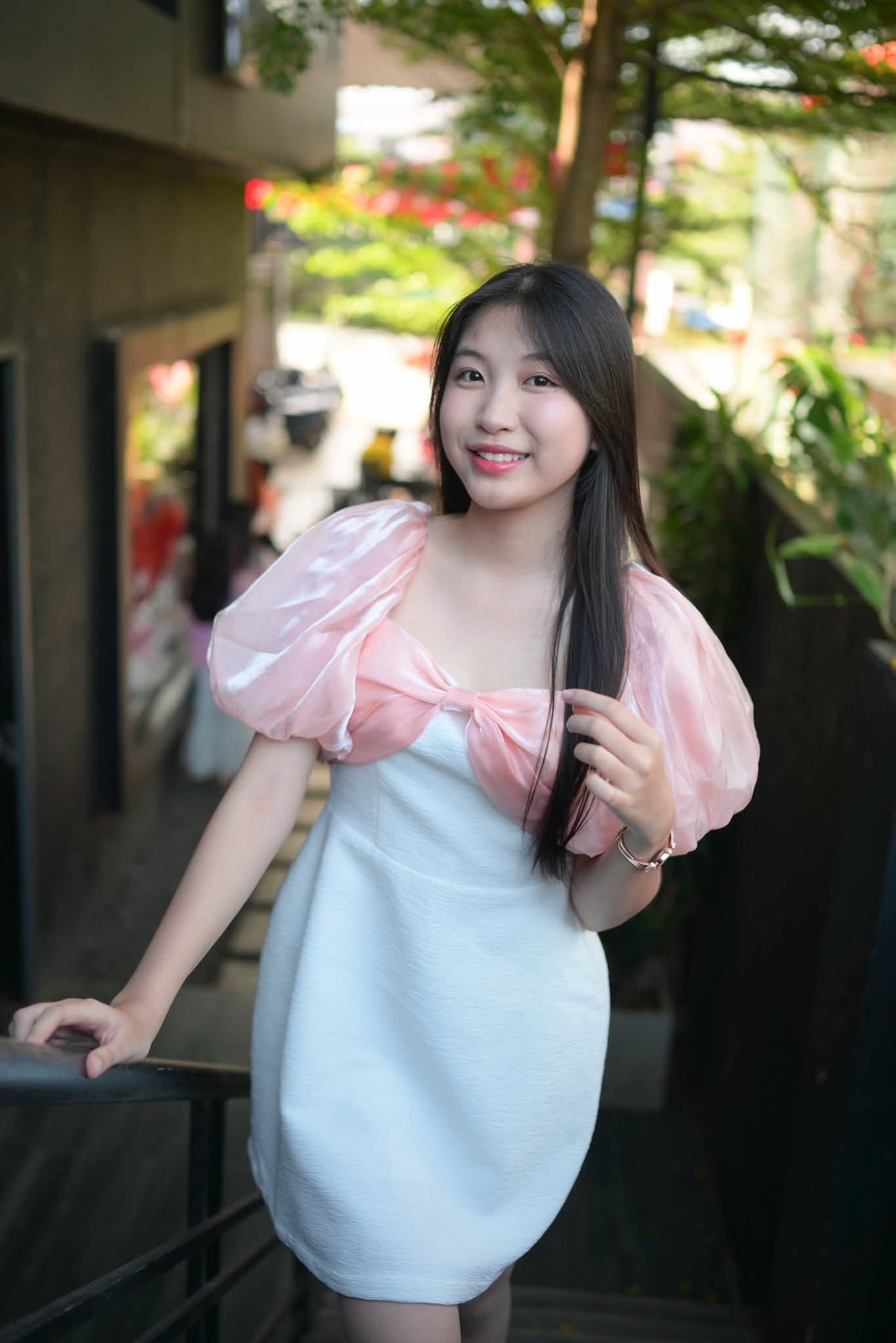 Discover the radiant beauty of a young Vietnamese girl, exuding positivity with her bright smile. She appears gracefully in a modern outfit, featuring a pristine white dress paired with gentle pastel pink puffy sleeves, creating an elegant and feminine style. Her long, lustrous hair naturally enhances her gentle, East Asian charm. This photo not only captures a natural moment but also celebrates the youthful, modern beauty of Vietnamese women, making it suitable for fashion collections, lifestyle media, and showcasing the beauty of Vietnamese people.