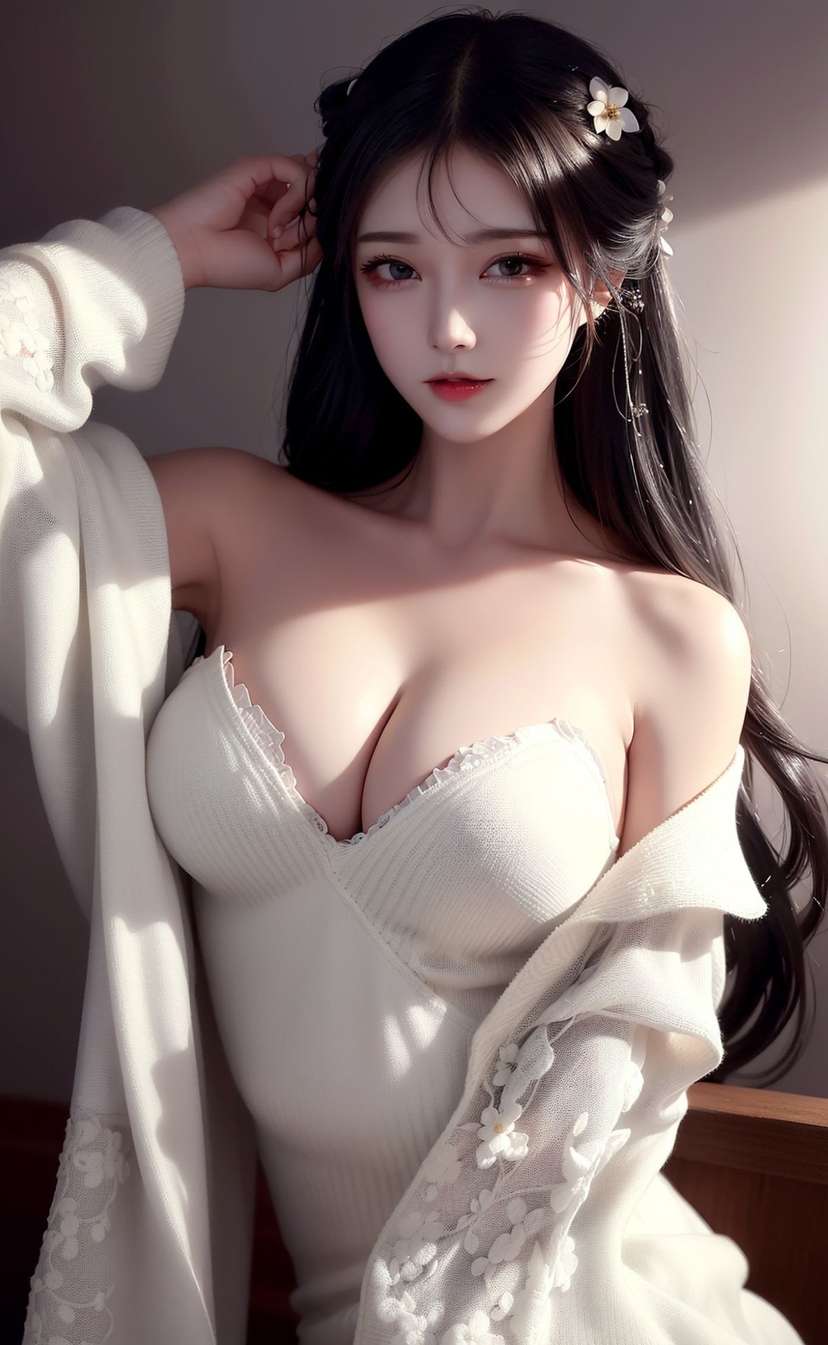 Explore the captivating beauty of a muse in this AI Generated realistic BiAn1 6期 Part02 collection. This lifelike image portrays an alluring woman with long dark hair, luscious red lips, and deep captivating eyes. She is adorned in delicate black lace lingerie, complemented by a mysterious wide-brimmed hat, exuding an aura of both elegance and enigma. Every detail from her direct gaze to the red rose in her hand emanates subtle sensuality and irresistible charm. This stunning digital artwork offers a vivid and emotional visual experience, showcasing the pinnacle of AI generated realism.