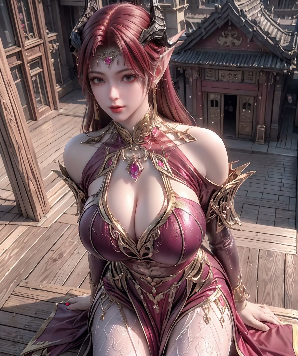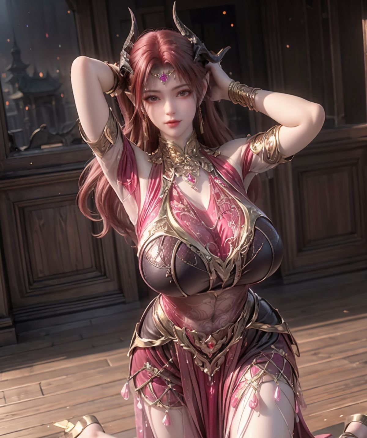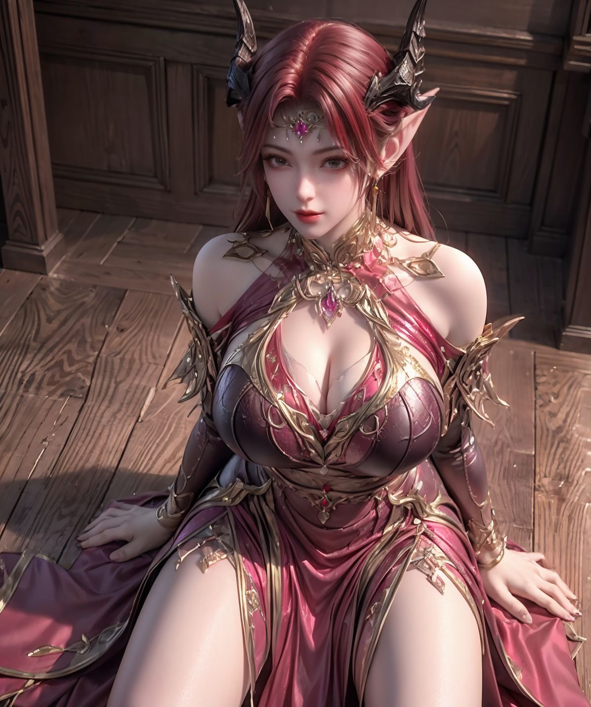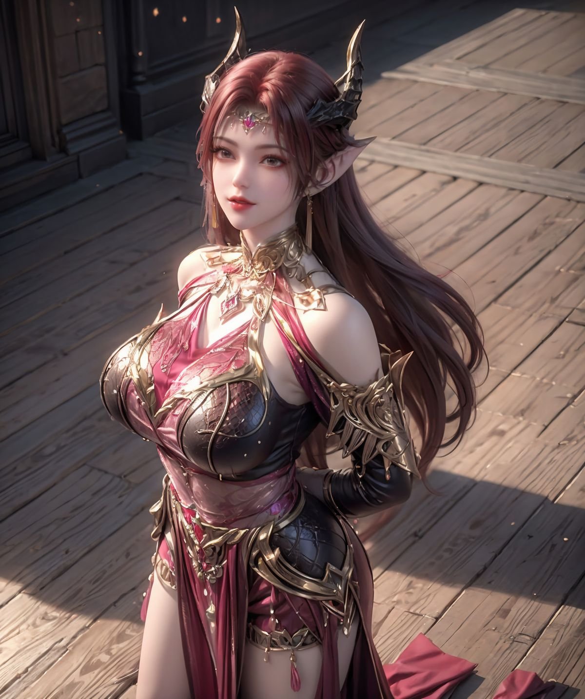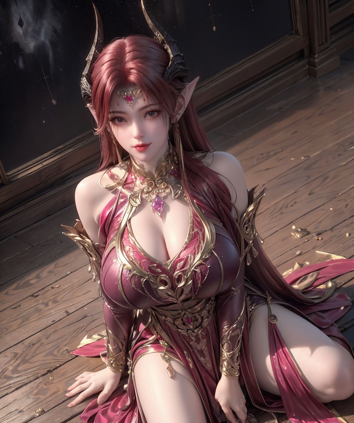 This AI Generated image unveils an enchanting fantasy warrior from the 百炼成神 妖夜 series. The character possesses a regal beauty with captivating reddish-brown hair delicate elf-like ears and mysterious small horns. She is adorned in an elaborate classic battle attire of rich burgundy and gleaming gold exquisitely detailed exuding both strength and allure. The mystical starlit night background further enhances her enigmatic charm. This stunning digital artwork perfectly blends power and grace portraying a beautiful figure within a magical fantastical realm.