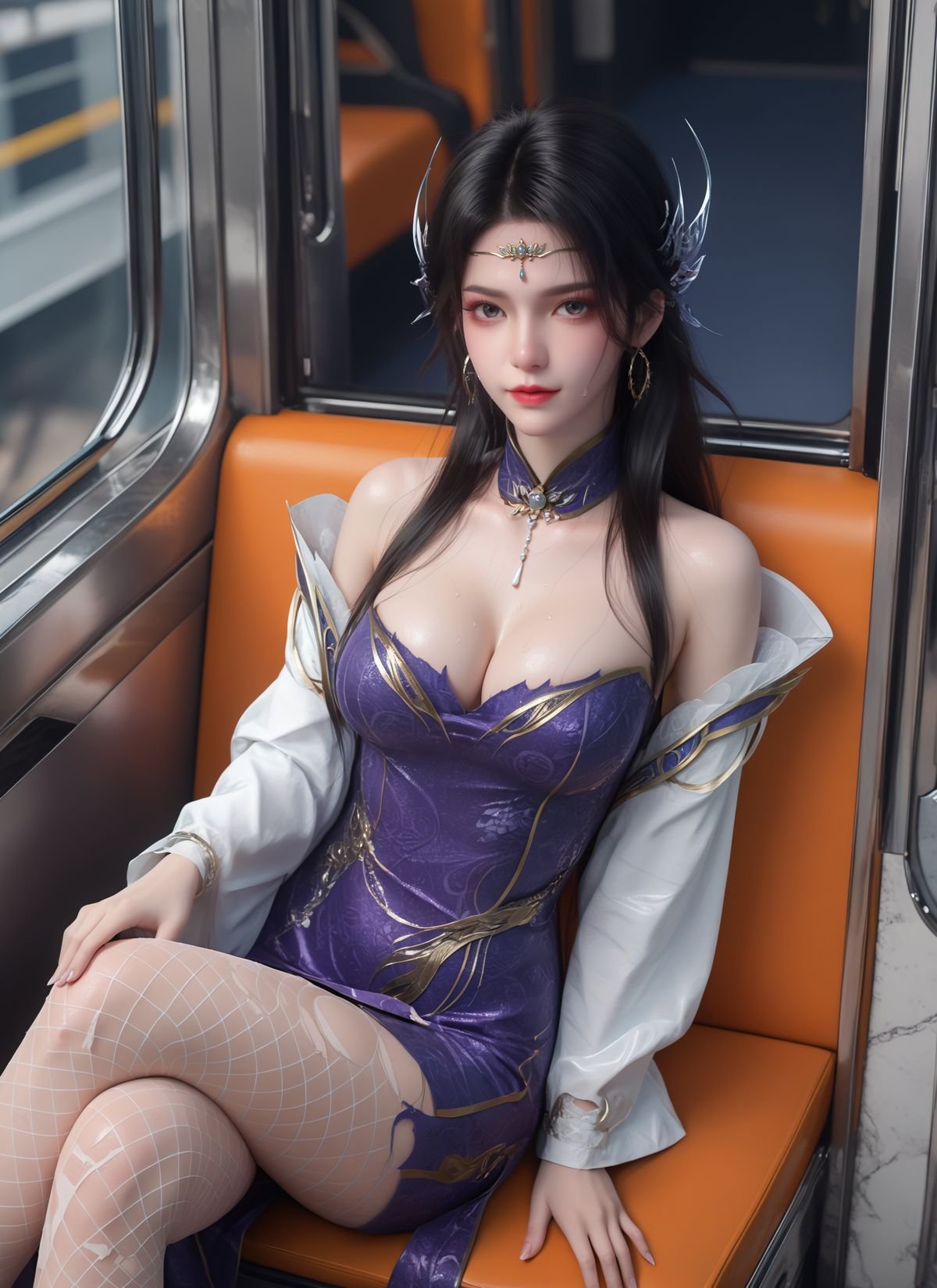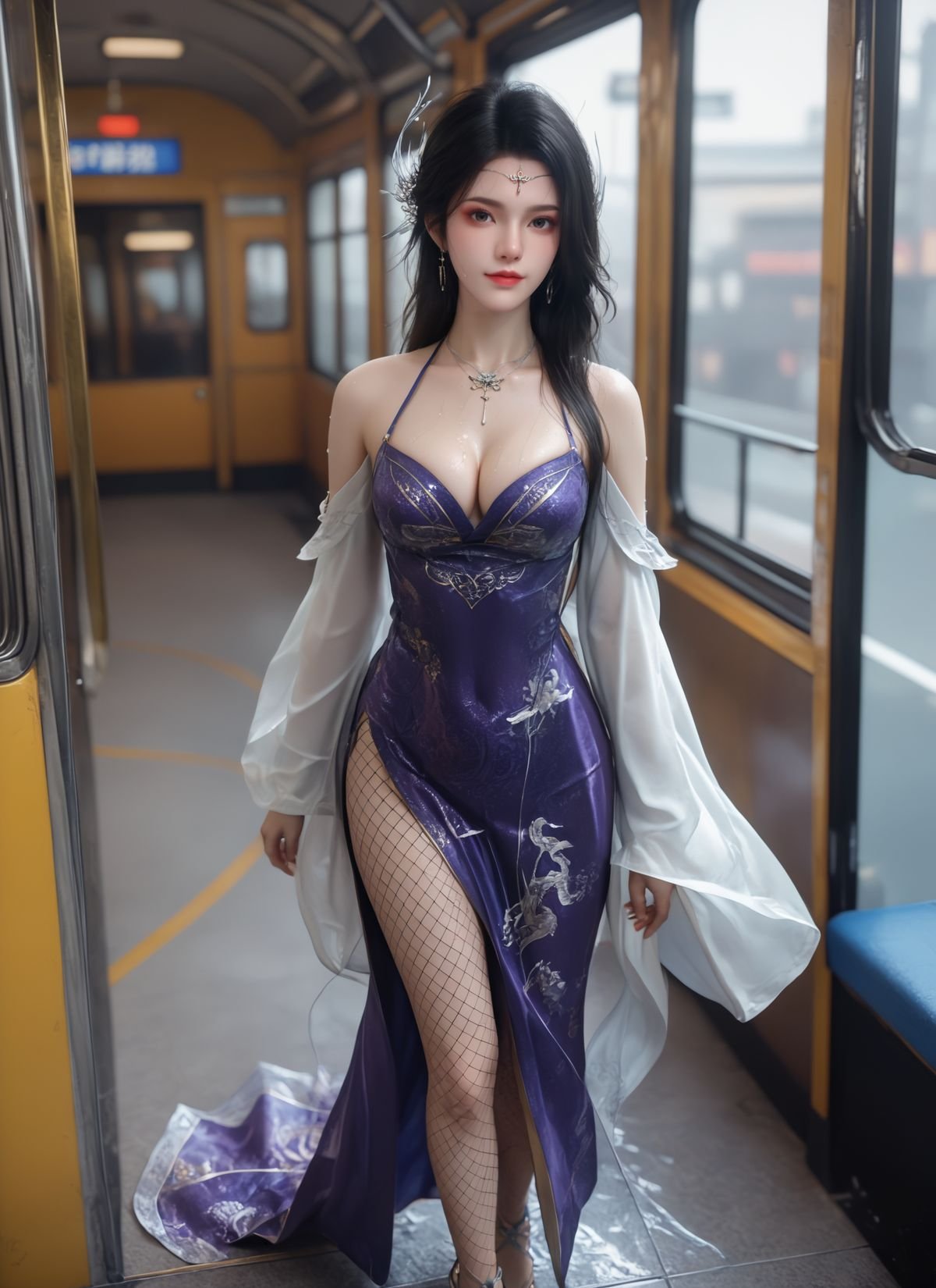 This AI Generated image portrays a mysterious and captivating beauty drawing inspiration from the world of Battle Through the Heavens. She dons a modern purple Xuan Yi outfit an exquisite fusion of traditional elegance and daring style featuring a bold high slit and alluring fishnet stockings. Her flowing white outer robe adds to her ethereal yet powerful aura. With sharp eyes and a confident demeanor she walks along the train platform creating an image that is both graceful and enigmatic. This is an impressive digital artwork showcasing the boundless creativity of AI in reimagining fantasy aesthetics.