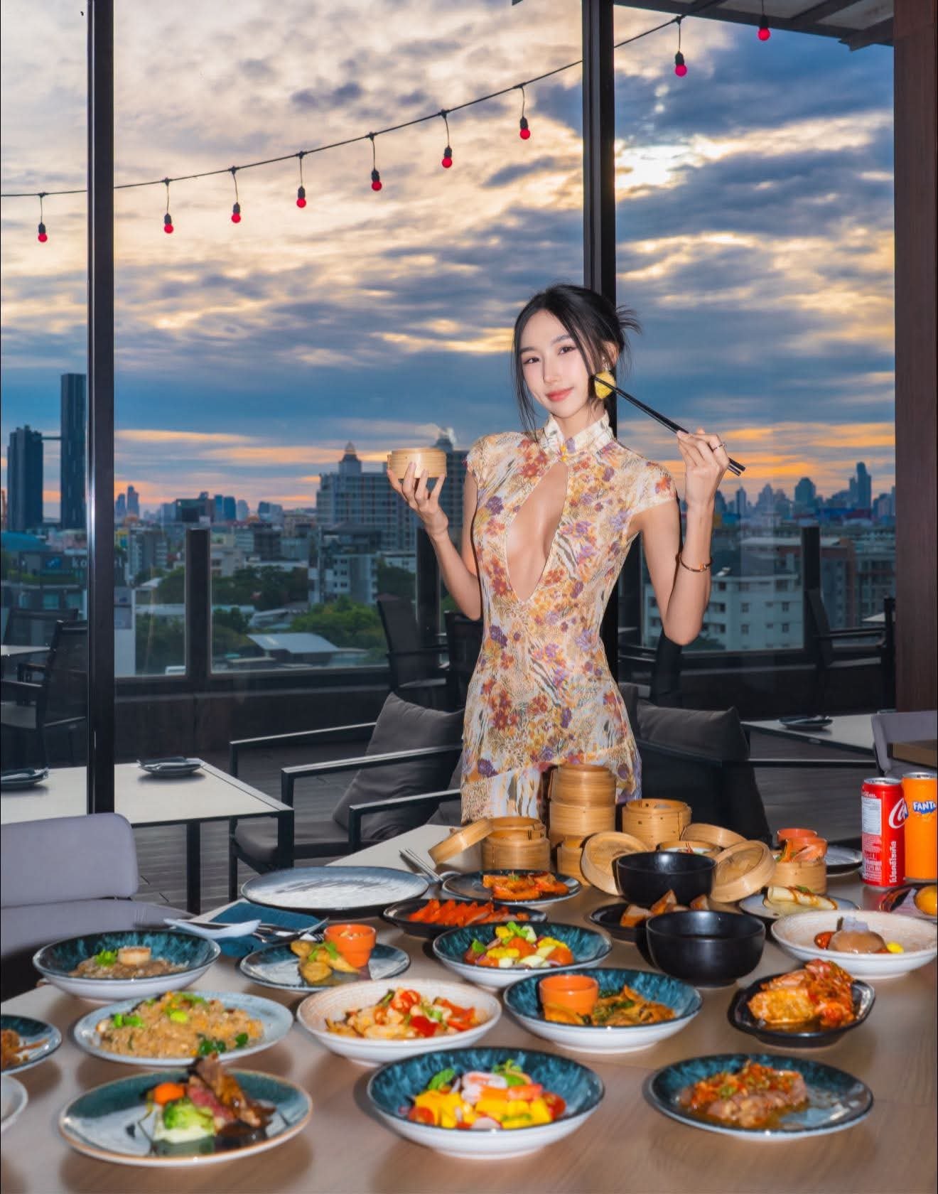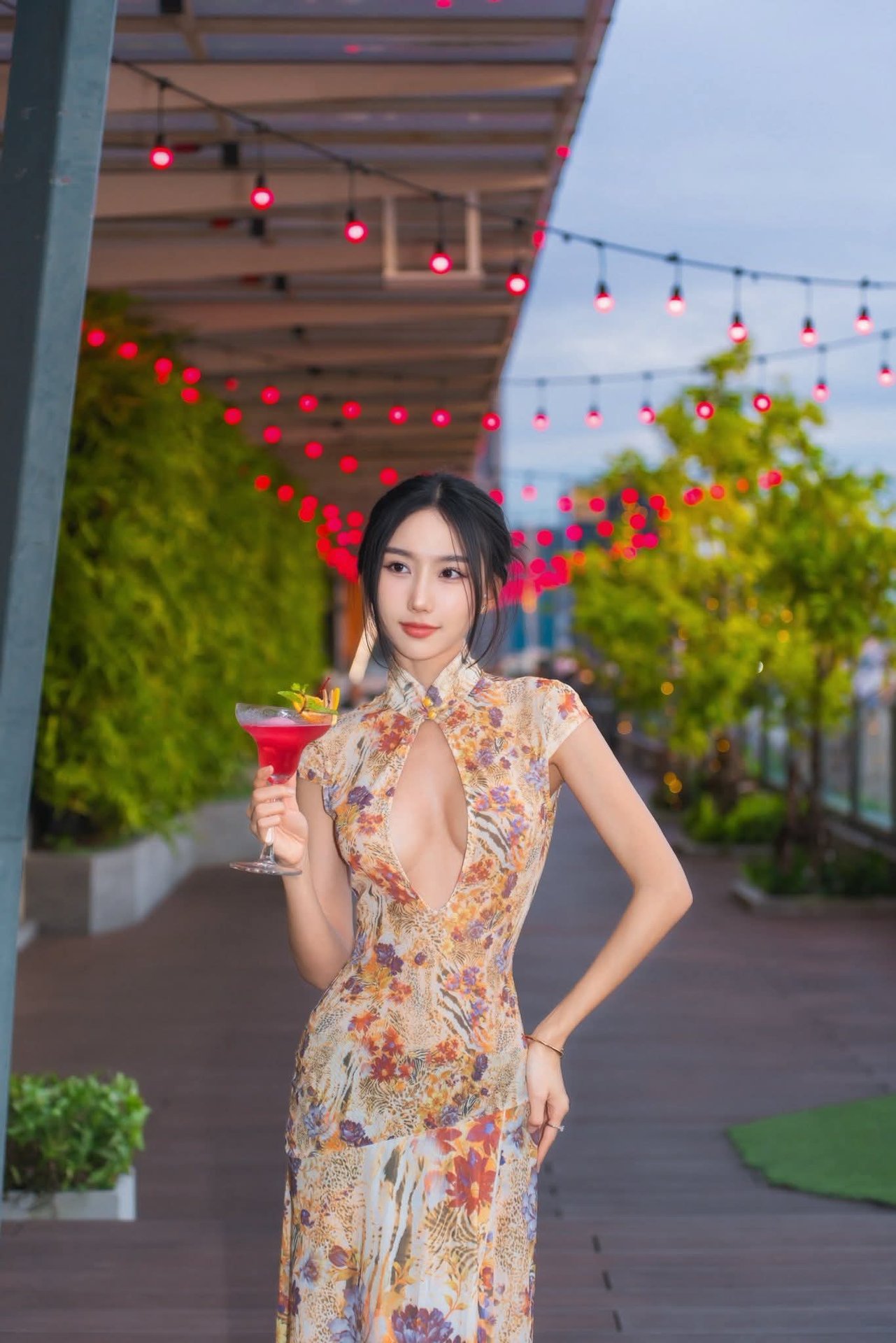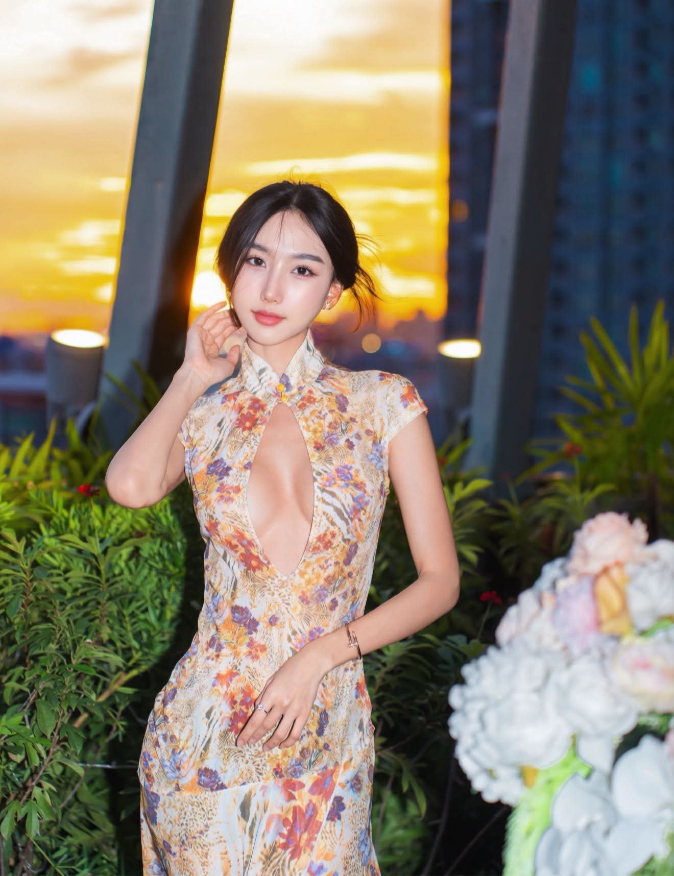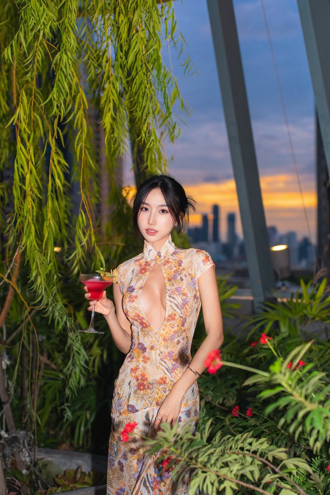 Taiwanese hot girl Donna exudes captivating charm in an elegant slip dress highlighting her slender figure. She showcases a confident demeanor and mesmerizing eyes creating an irresistible allure. The backdrop of a sparkling city night with towering buildings illuminated by dazzling lights further enhances her beauty and luxurious lifestyle. This image is not just a glamorous check in moment but also a display of her self assured personality within the modern urban setting. Donnas beauty blending seamlessly with the city lights paints a perfect picture of sophistication and allure captivating every gaze.